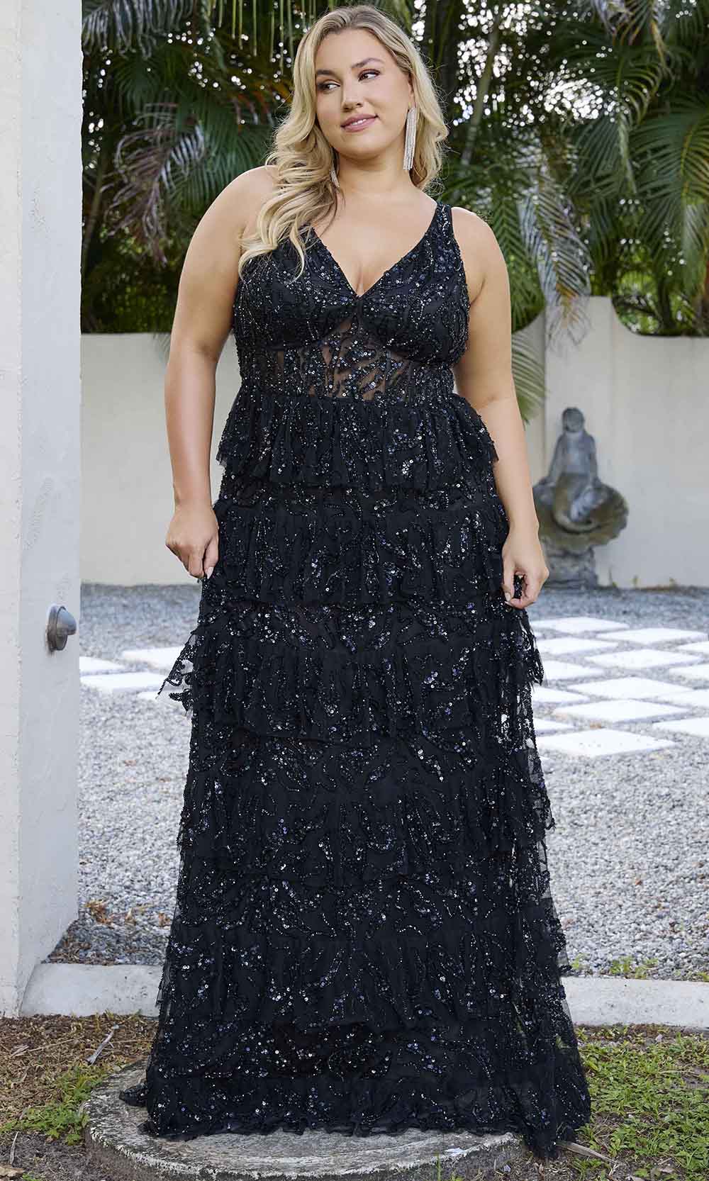 Embrace a style that is immaculately sultry as you glam up for your event in this Primavera Couture 14073 gown. Adorned with exquisite beads and sequins, this dress offers a captivating and luxurious look. The sleeveless sheer bodice features a V-neckline that perfectly matches the V-shaped open back, providing a chic and elegant appearance. A concealed zipper closure at the back ensures a flawless fit, highlighting your figure. The floor-length skirt flows in a refined A-line silhouette, accented with delicate tiers, and ending with a train that adds movement and drama. Perfect for formal events, this Primavera Couture 14073 blends classic charm with modern allure, making you the center of attention at any special event. Models are wearing Black, Pink, and Powder Blue colors.