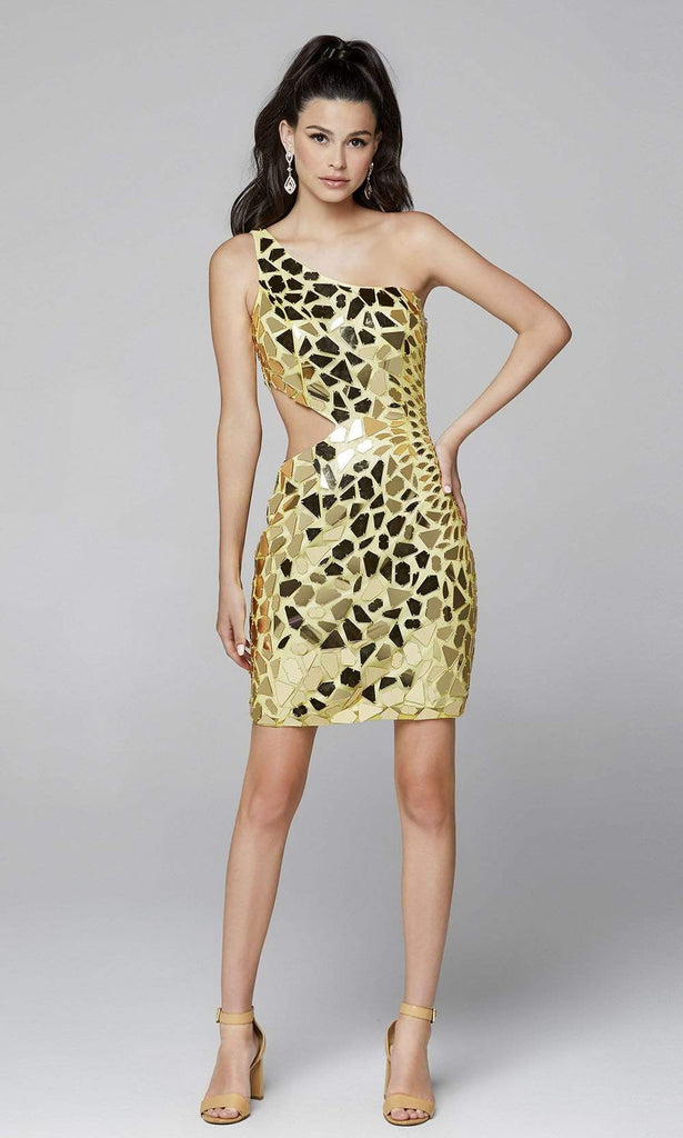Sparkle from every angle in this cocktail dress by Primavera Couture 3529. Fully enwrapped in glistening cut-glass accents on its figure-flattering silhouette, this stunner flaunts an asymmetric one shoulder neckline mirrored at the back, and features a cutout along the side panel of the bodice. Sculpting the feminine form, the illuminating sheath skirts columns divinely as it flows to a short hemline. Be irresistibly striking in this lavish piece by Primavera Couture.