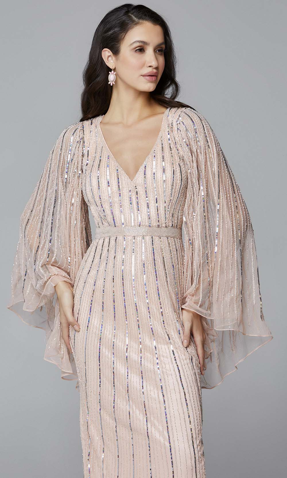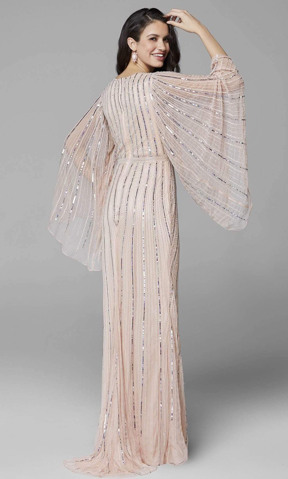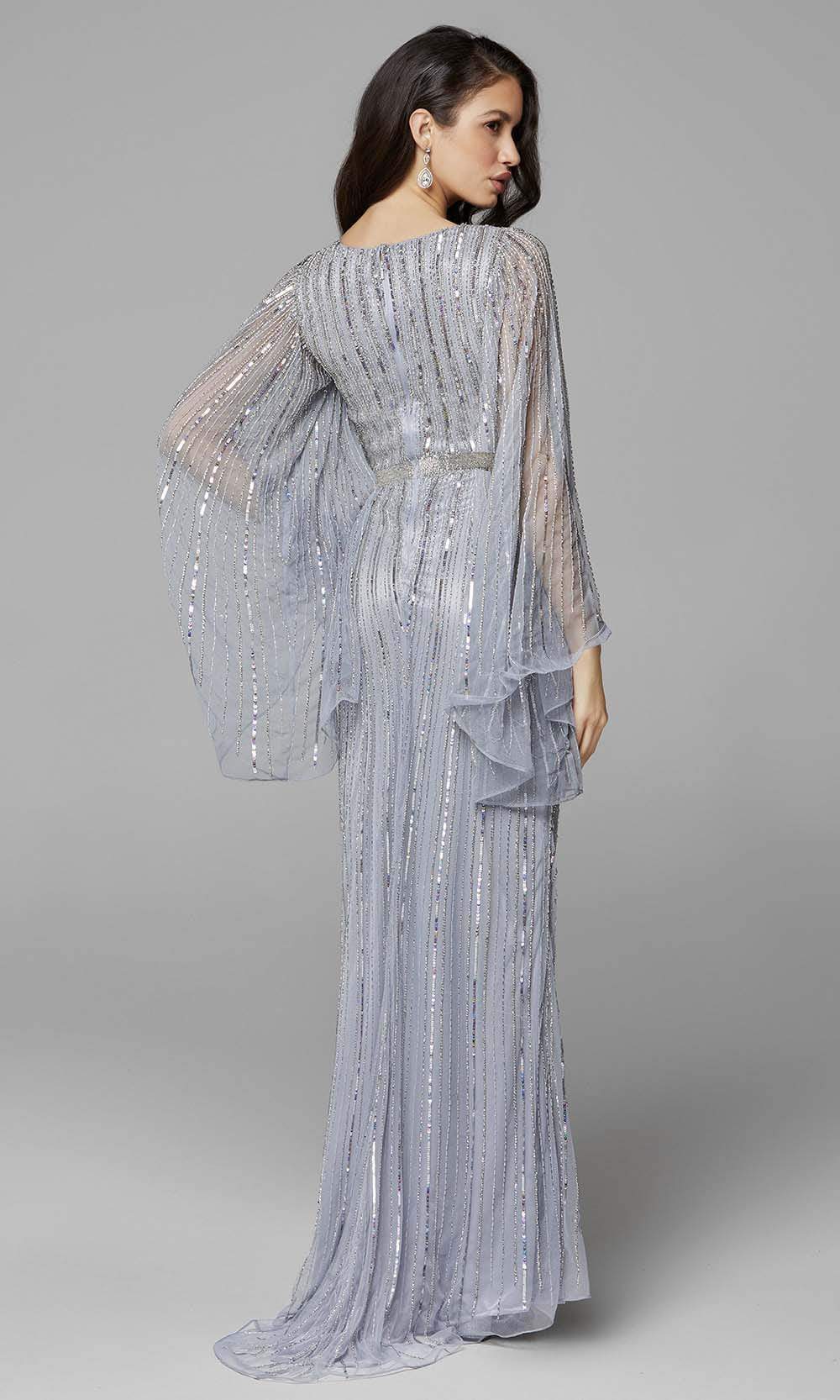 Look fabulous for your event wearing this dress from Primavera Couture 3672. This sequined dress fashions a V neckline with long bell sleeves. The dress has a fitted bodice and a sheath skirt with a mini train finish. This Primavera Couture dress is sure to be an attention-grabber in any occasion.