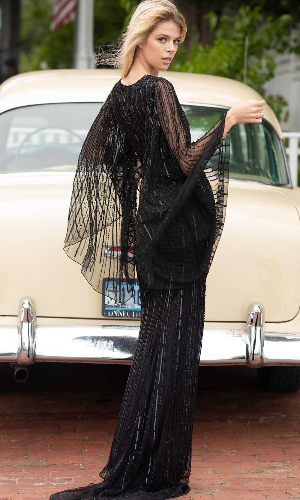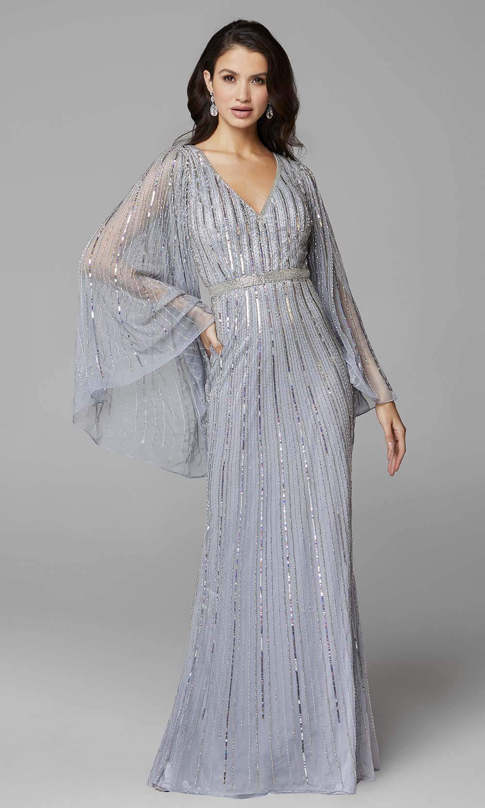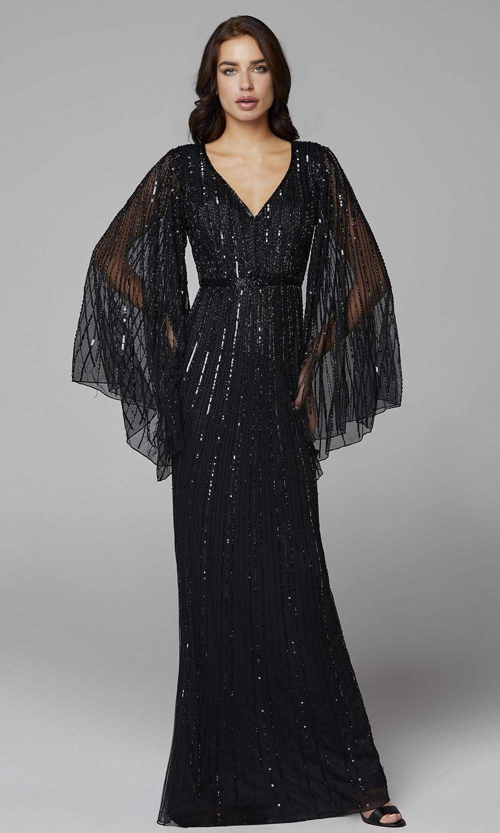 Look fabulous for your event wearing this dress from Primavera Couture 3672. This sequined dress fashions a V neckline with long bell sleeves. The dress has a fitted bodice and a sheath skirt with a mini train finish. This Primavera Couture dress is sure to be an attention-grabber in any occasion.