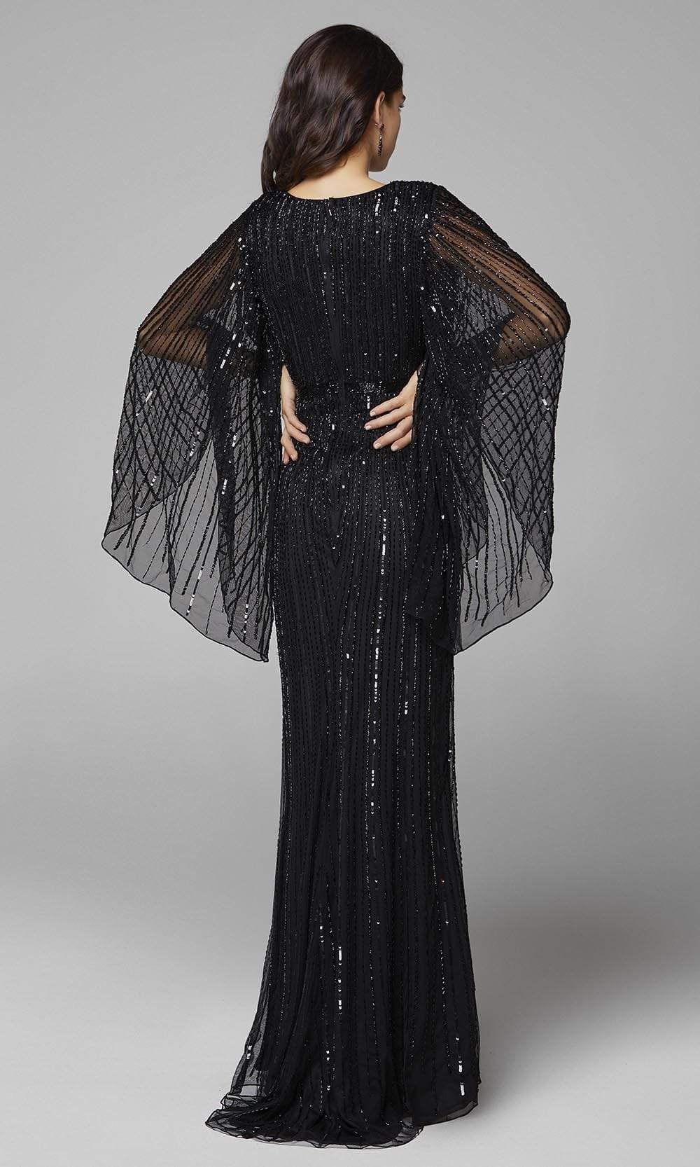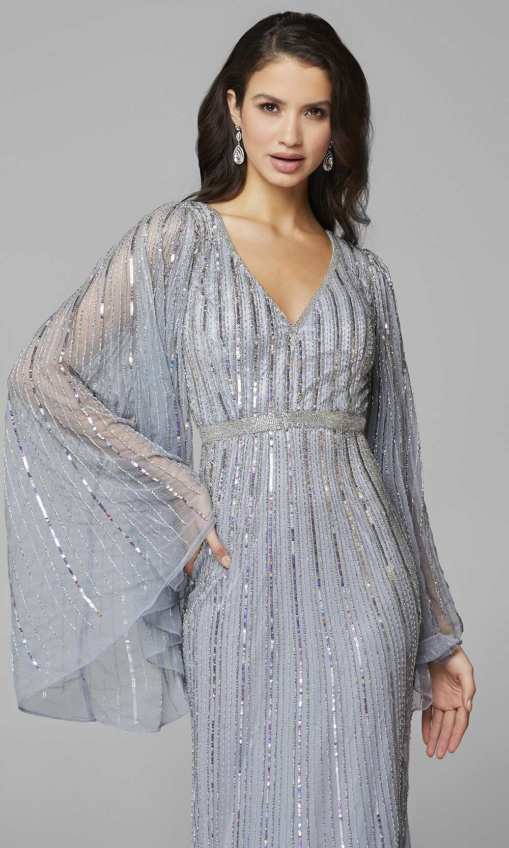 | Details: | Long bell sleeves, Sequins, Fitted bodice, Sheath skirt, Mini train |