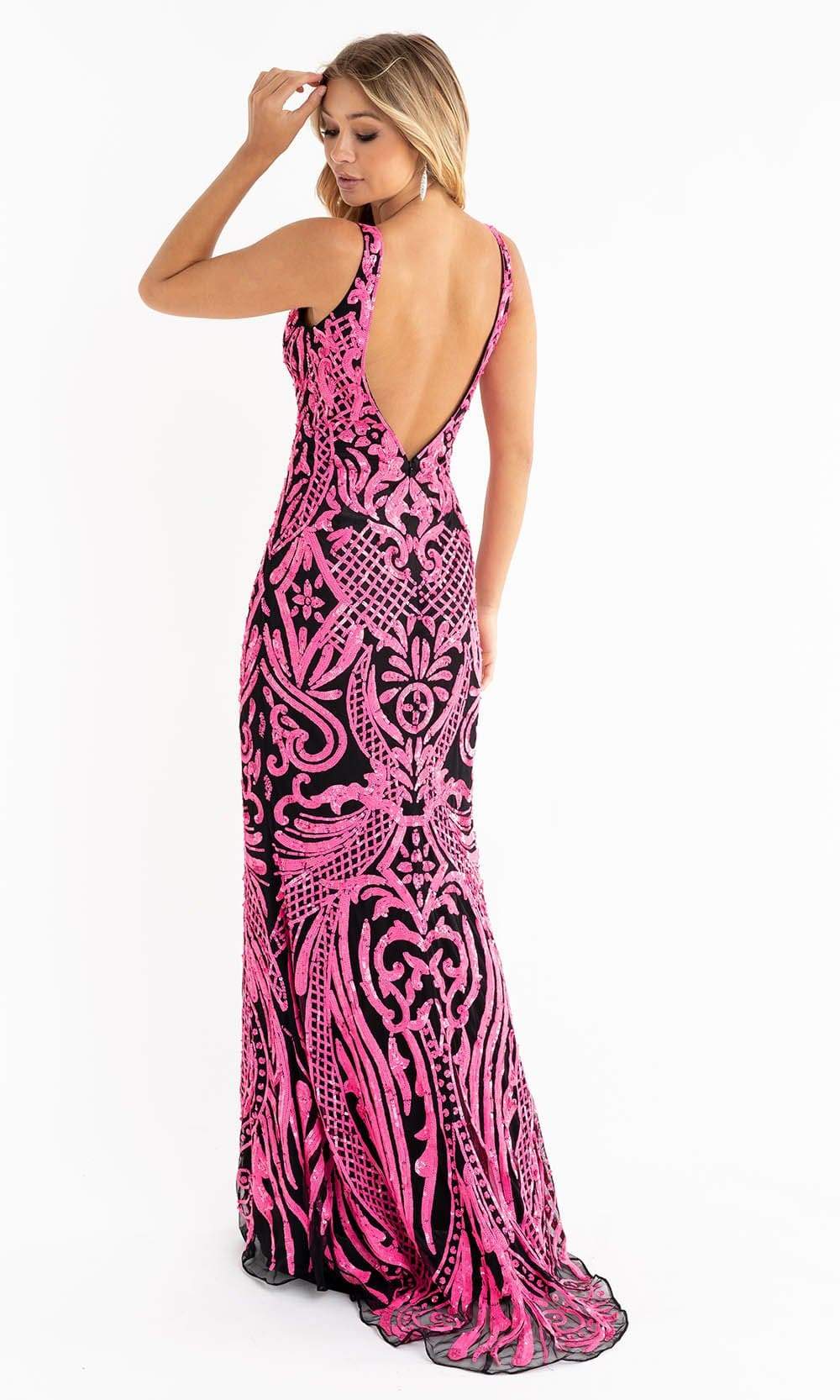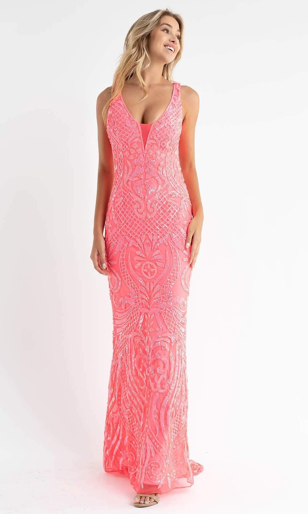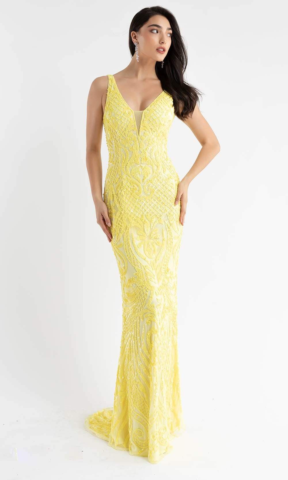 This enchanting Primavera Couture 3722 is sure to make you the center of everyone's attention. Turn heads in this gown with a plunging v neckline that has a sheer courtesy panel and the fitted bodice showcases a sleeveless and a v shape open back. Flatter your finest assets as you enthrall the crowd in this Primavera Couture . Primavera Couture's sparkling long sequin dresses and cocktail dresses will dazzle you with compliments as these dresses are extremely impressive.
