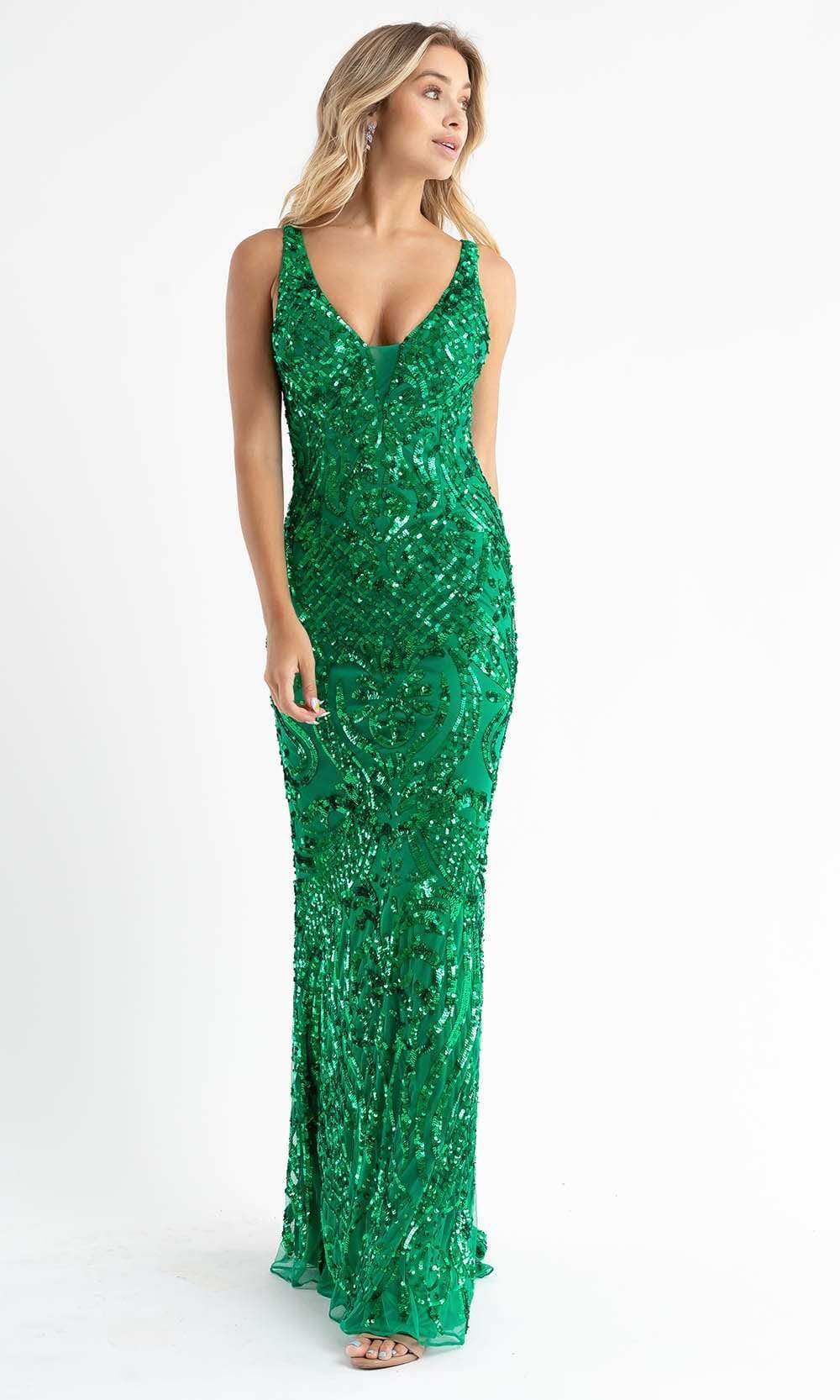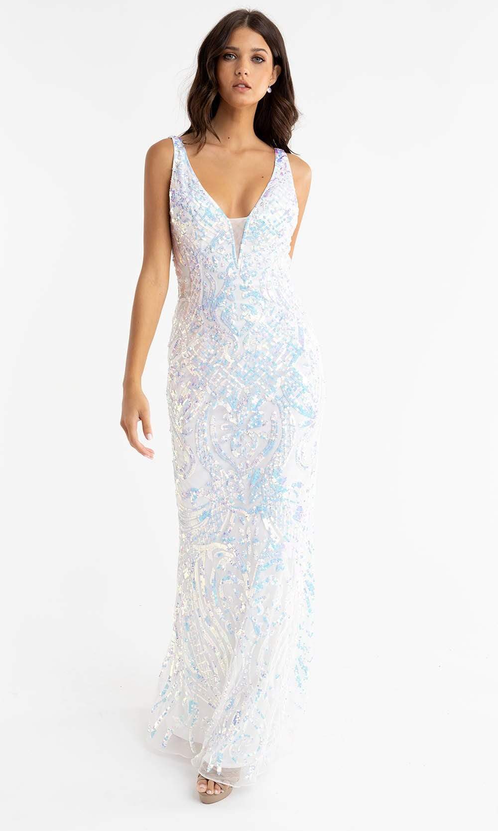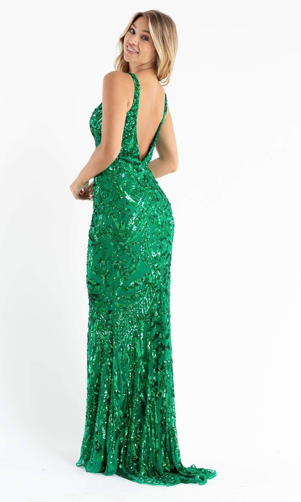 This enchanting Primavera Couture 3722 is sure to make you the center of everyone's attention. Turn heads in this gown with a plunging v neckline that has a sheer courtesy panel and the fitted bodice showcases a sleeveless and a v shape open back. Flatter your finest assets as you enthrall the crowd in this Primavera Couture . Primavera Couture's sparkling long sequin dresses and cocktail dresses will dazzle you with compliments as these dresses are extremely impressive.