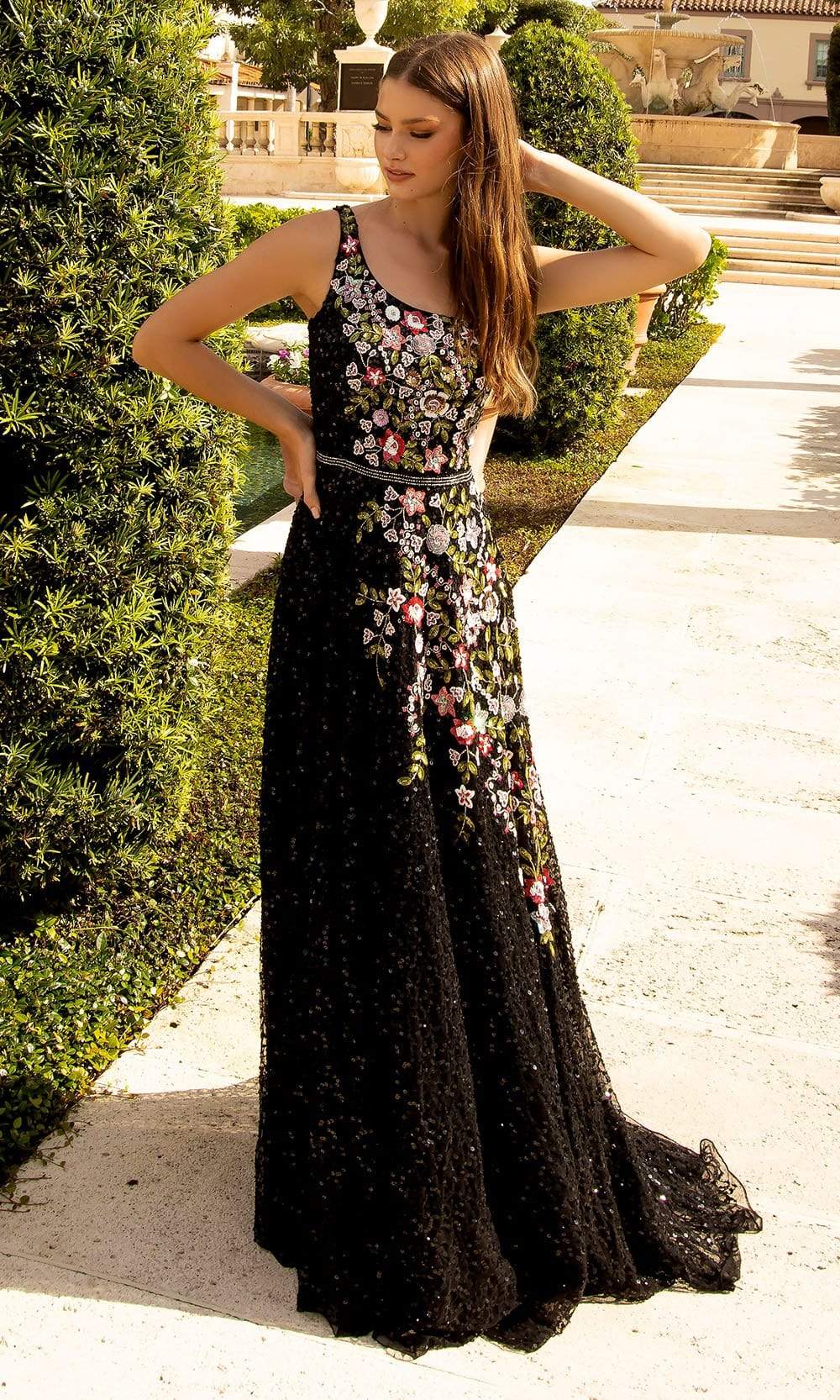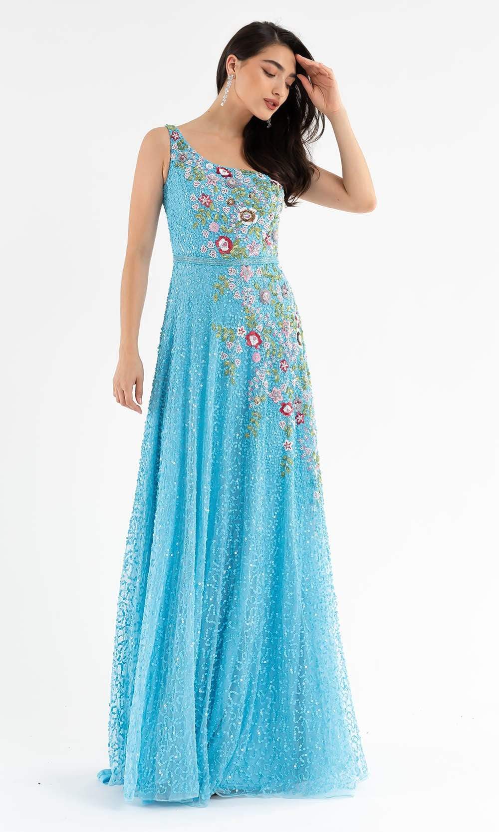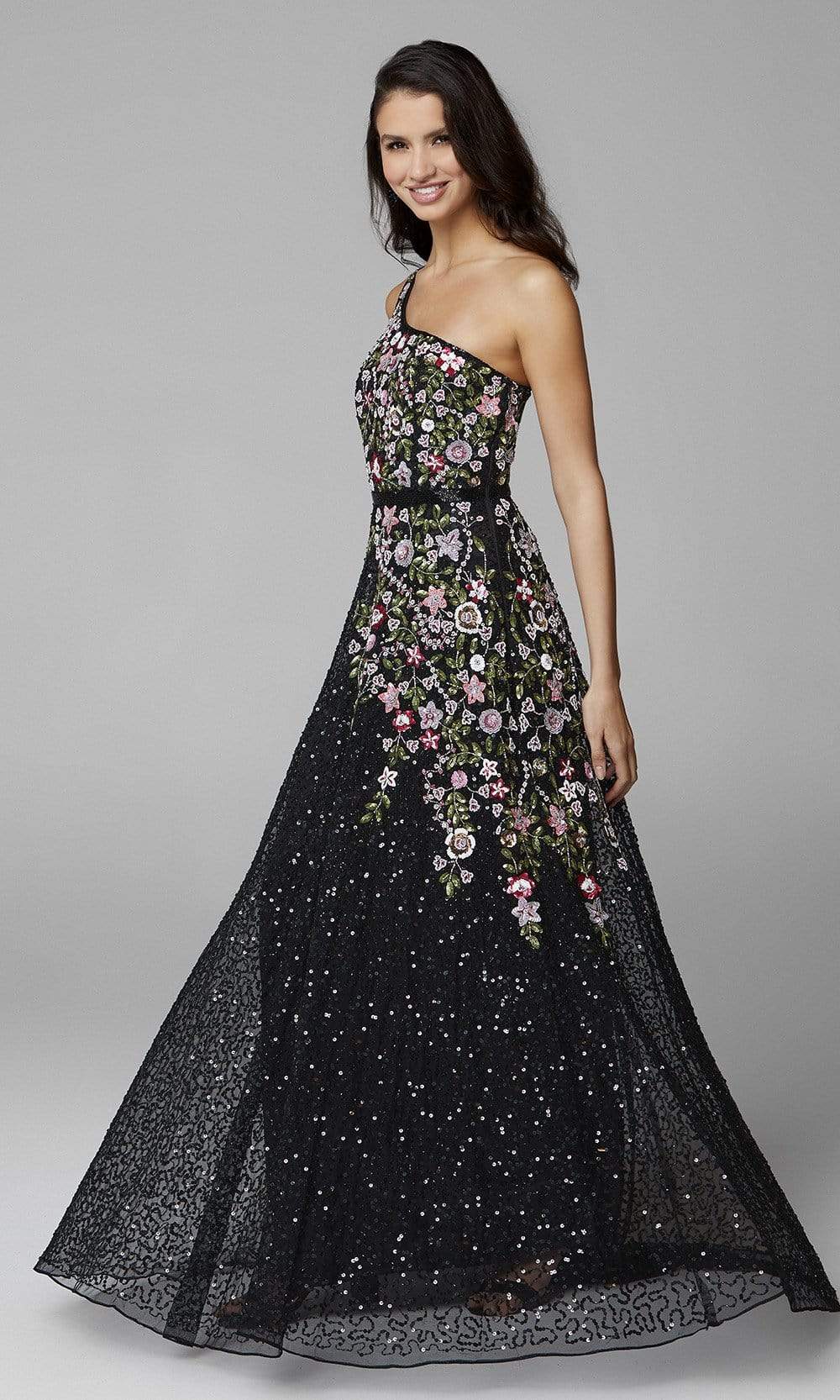 Be one of the best dressed lists as you show up in this Primavera Couture 3736 masterpiece. Designed in fully beaded and floral patterned sequins, this ensemble showcases fitted bodice with an asymmetrical neckline and singe shoulder strap. The waist is accented with a beaded waistband giving way to the embellished tulle A-line skirt. The open back displays strappy back and a sweep train for added drama. Walk in a defined sophistication and beauty wearing this Primavera Couture creation. Model is wearing Black Multi color. Primavera Couture's sparkling long sequin dresses and cocktail dresses will dazzle you with compliments as these dresses are extremely impressive.