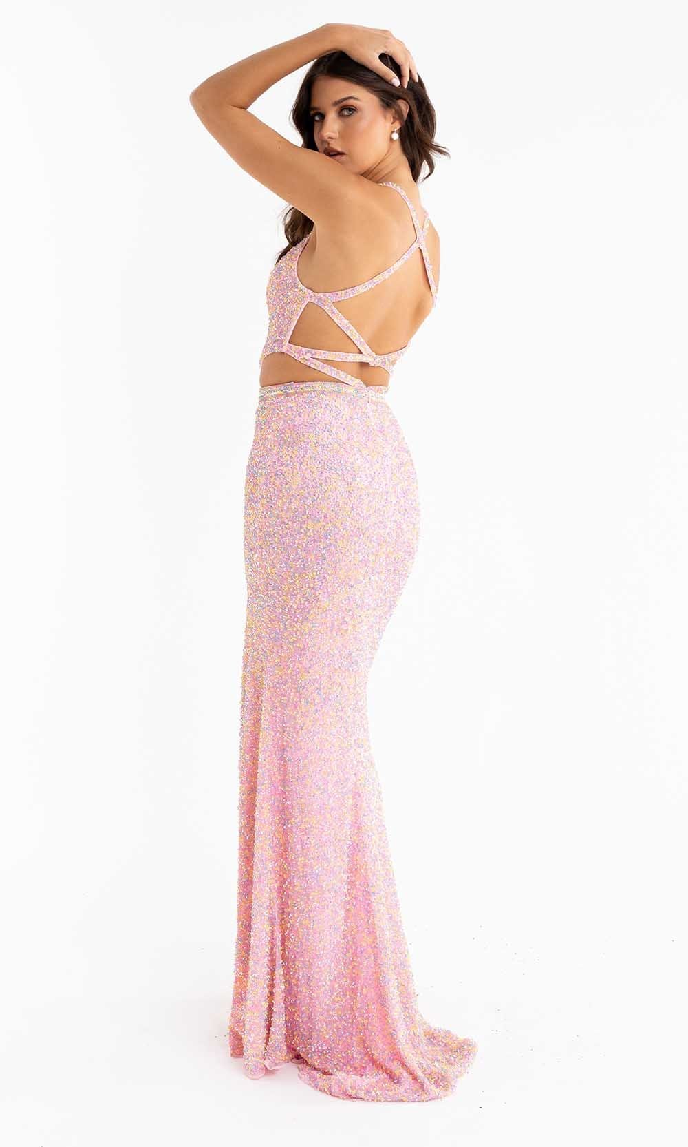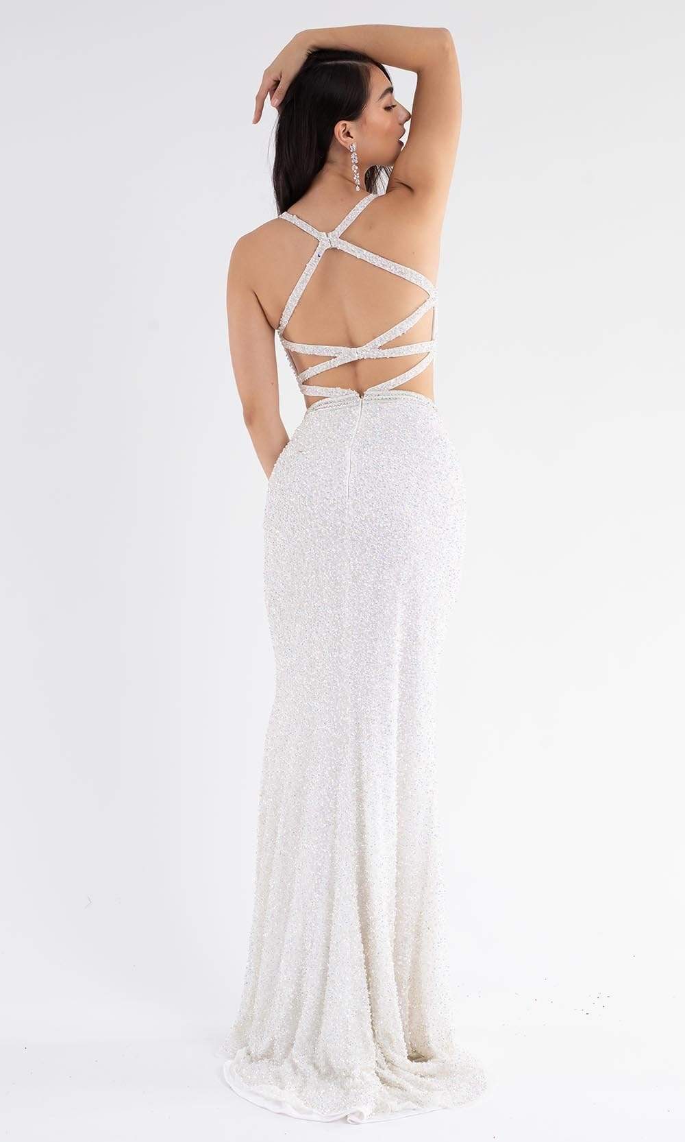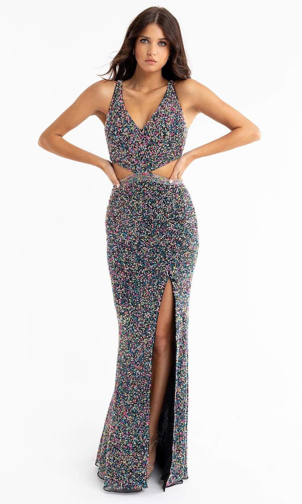 Promote attention-grabbing style in this stunning Primavera Couture 3744. A plunging V-neckline offers you a sexy touch to this sequins all the way to the floor length skirt. This made more sexier with the cutouts at the waistline and the multiple crossing wide straps in the back and with the high slit. Primavera Couture for a flattering look. Primavera Couture's sparkling long sequin dresses and cocktail dresses will dazzle you with compliments as these dresses are extremely impressive.