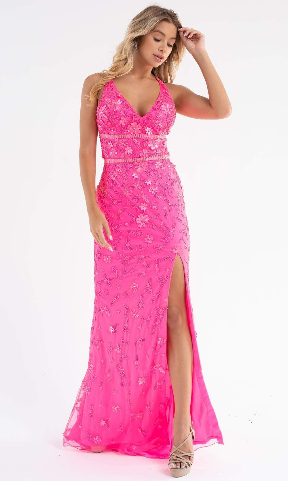 Captivate the crowd as you shine in this gown by Primavera Couture 3746. This shimmering beadwork mesh gown will let you stand out among the rest as you gracefully parade with its front thigh-high slit showcasing a crisscross beaded strap open back with a deep V-neckline. A double beaded waistband embraces the fitted midriff. Delicate gathers accent the A-line skirt with a thigh-high slit and grace it to a full-length hemline. Have a blast at your special event with this Primavera Couture creation. Primavera Couture's sparkling long sequin dresses and cocktail dresses will dazzle you with compliments as these dresses are extremely impressive.