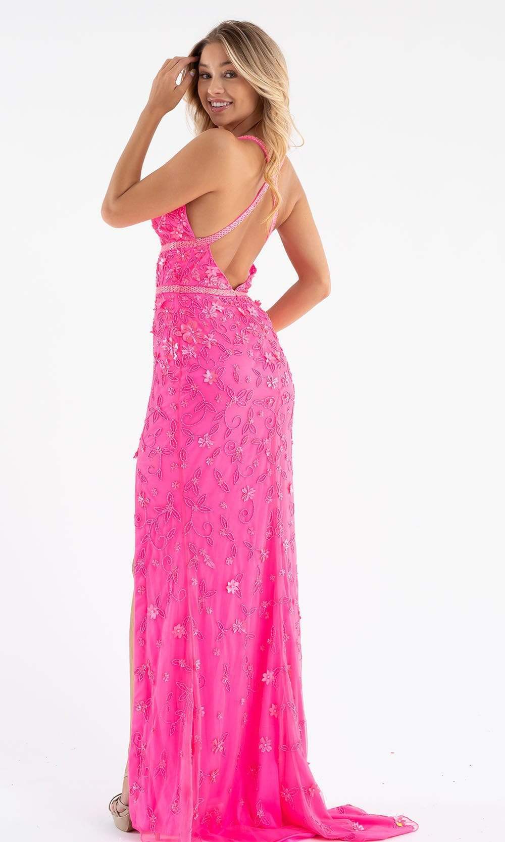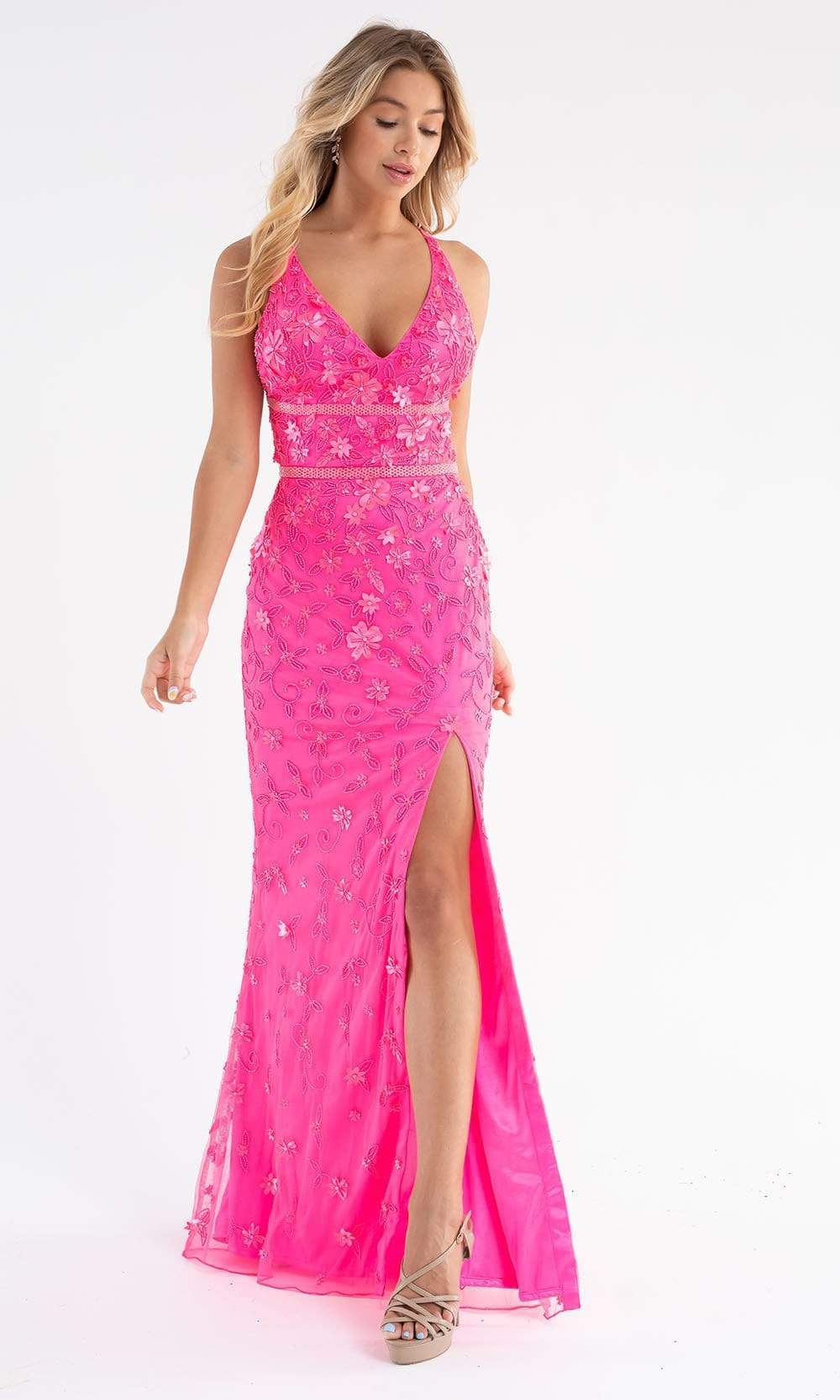 | Details: | Floral Beaded, Plunging V Neckline, Sleeveless, Concealed Back Zipper, High Slit, Train, Beaded Waistband, Open back, Sheath Silhouette |