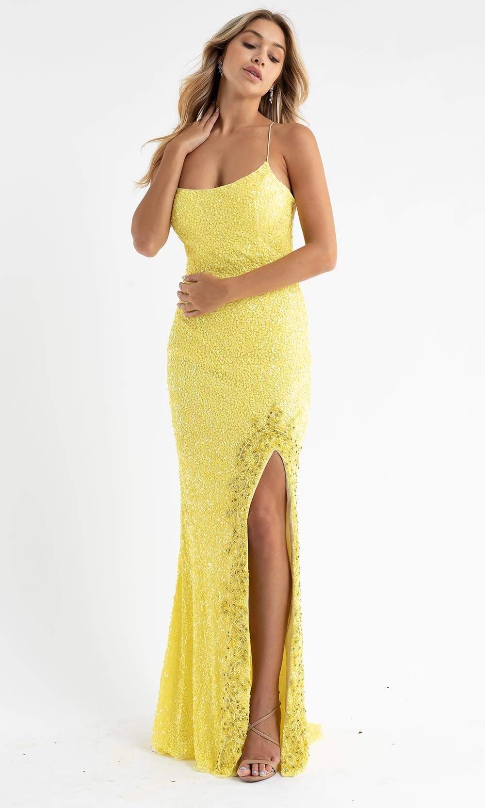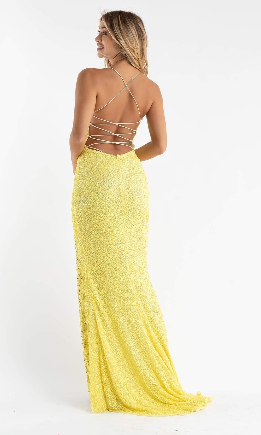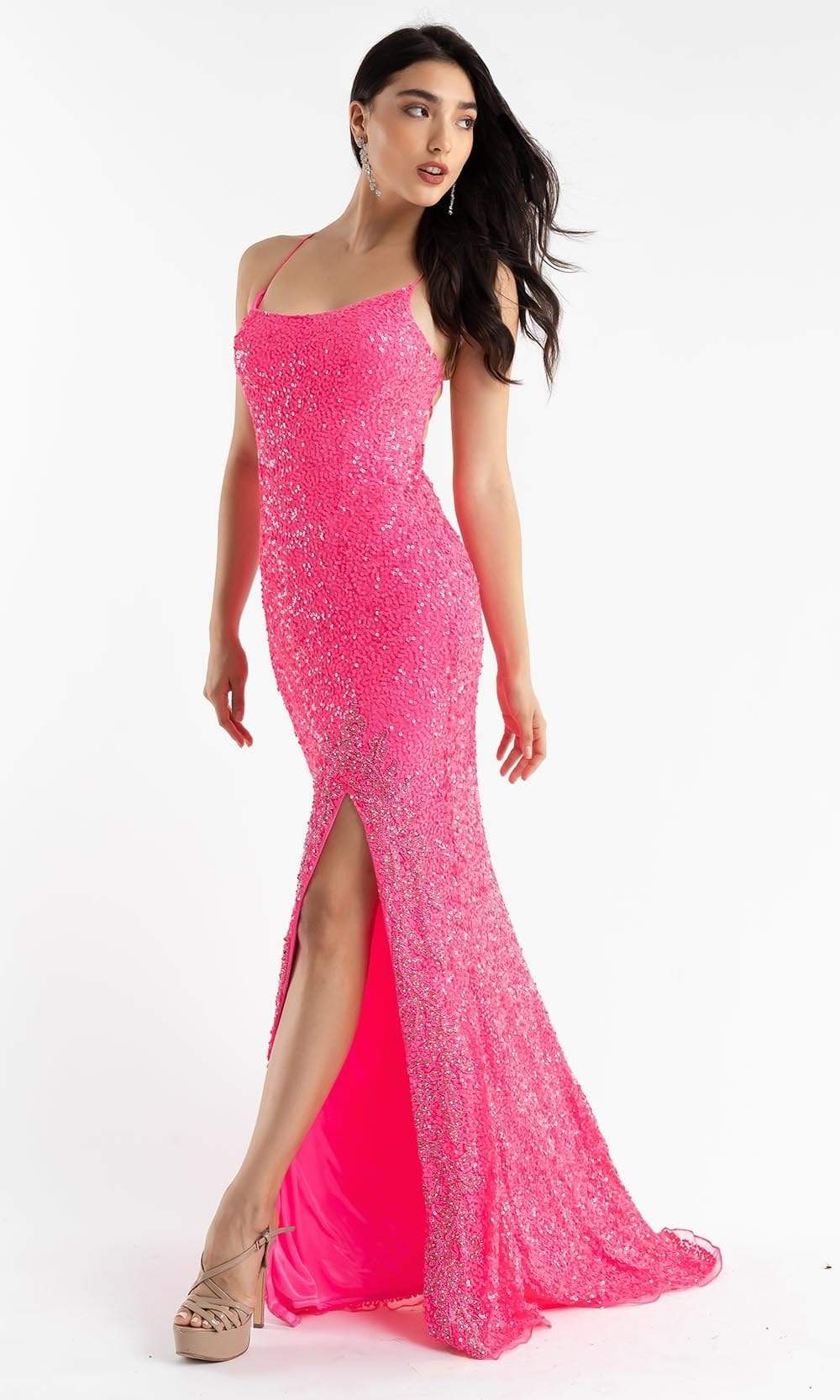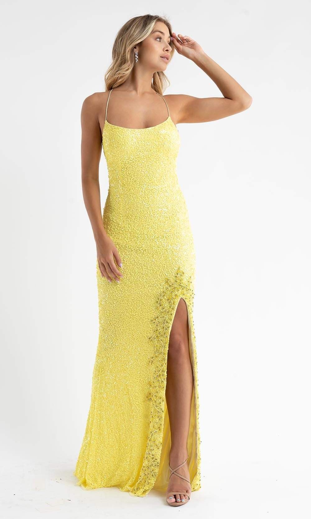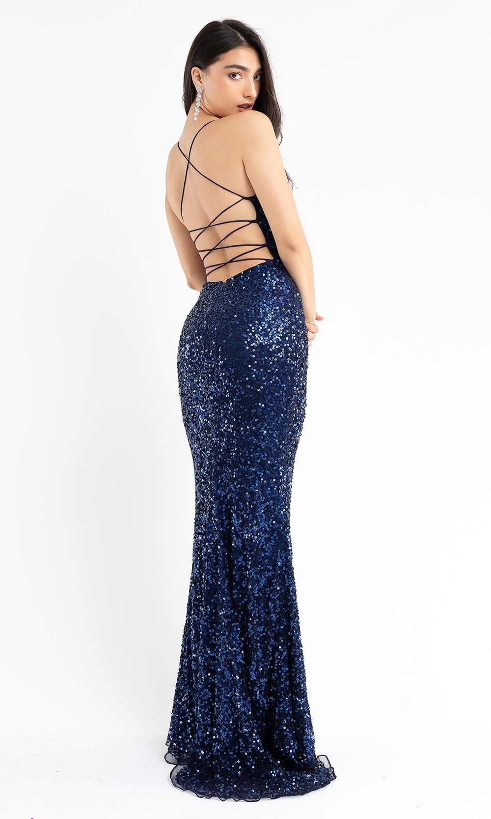| Details: | Fully Sequined, Scoop Neckline, Spaghetti Strap, Open Back, Concealed Back Zipper, Strappy Back, High Slit, Train |