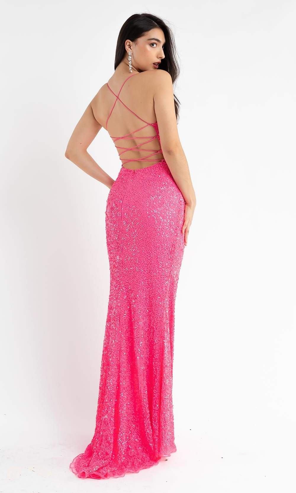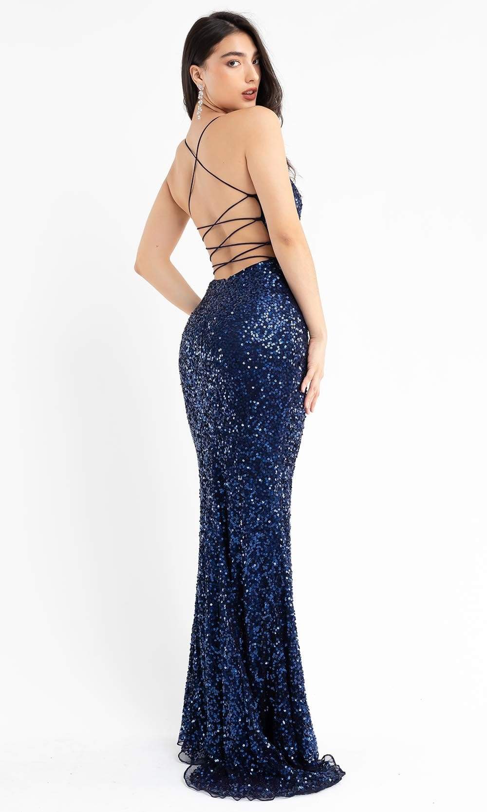 Every detail of this Primavera Couture 3758 is dripping with faultless charm! This long shiny dress is embellished with sequin applique throughout and features scoop neckline and uses sleeveless spaghetti straps. It shows off your naughty and sexy side with its strappy open back style on a full length column silhouette. A thigh high slit is perfect for this dress. Another great creation by Primavera Couture. Primavera Couture's sparkling long sequin dresses and cocktail dresses will dazzle you with compliments as these dresses are extremely impressive.