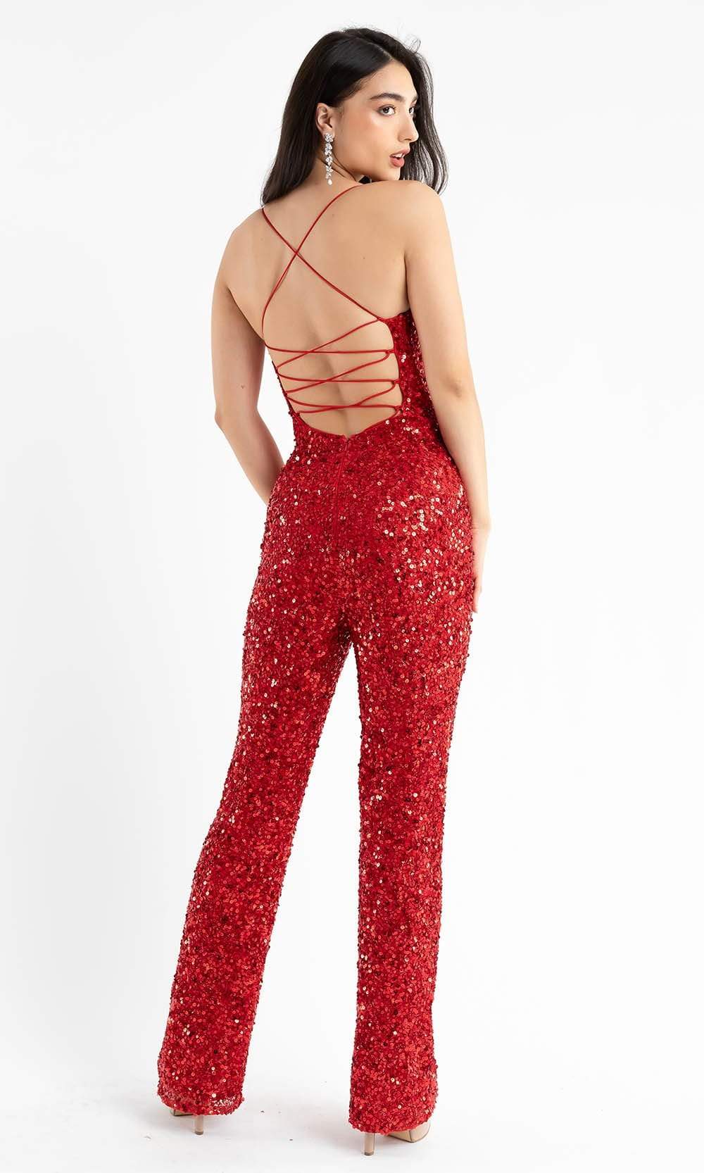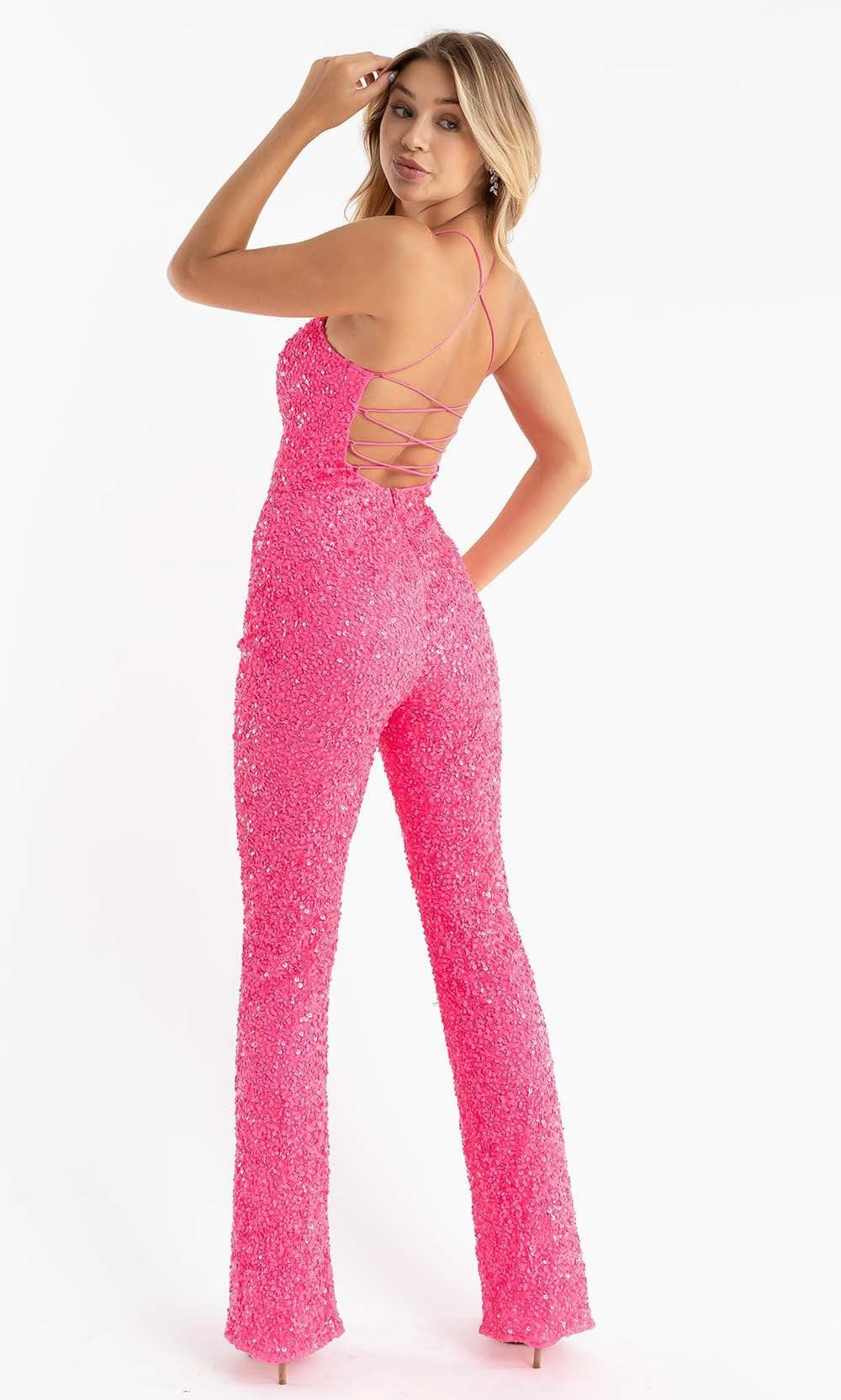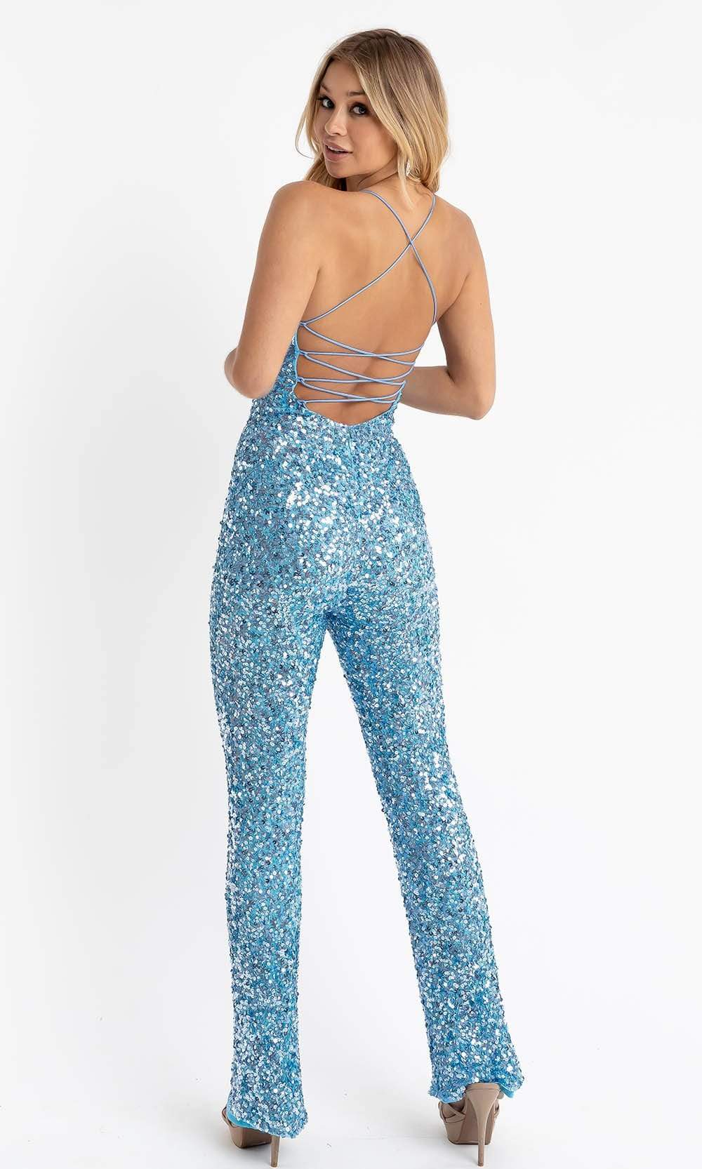 Show off your bubbly and pleasant personality with this sequin jumpsuit by Primavera Couture 3774. This gorgeous pair that has a fashionable sleeveless, scoop neckline and thin spaghetti straps that lace up and tie in the back with fitted bodice would definitely adore everyone in the crowd. This Primavera Couture is tailored to fit your curves. Primavera Couture's sparkling long sequin dresses and cocktail dresses will dazzle you with compliments as these dresses are extremely impressive. Find more Formal Pantsuits.