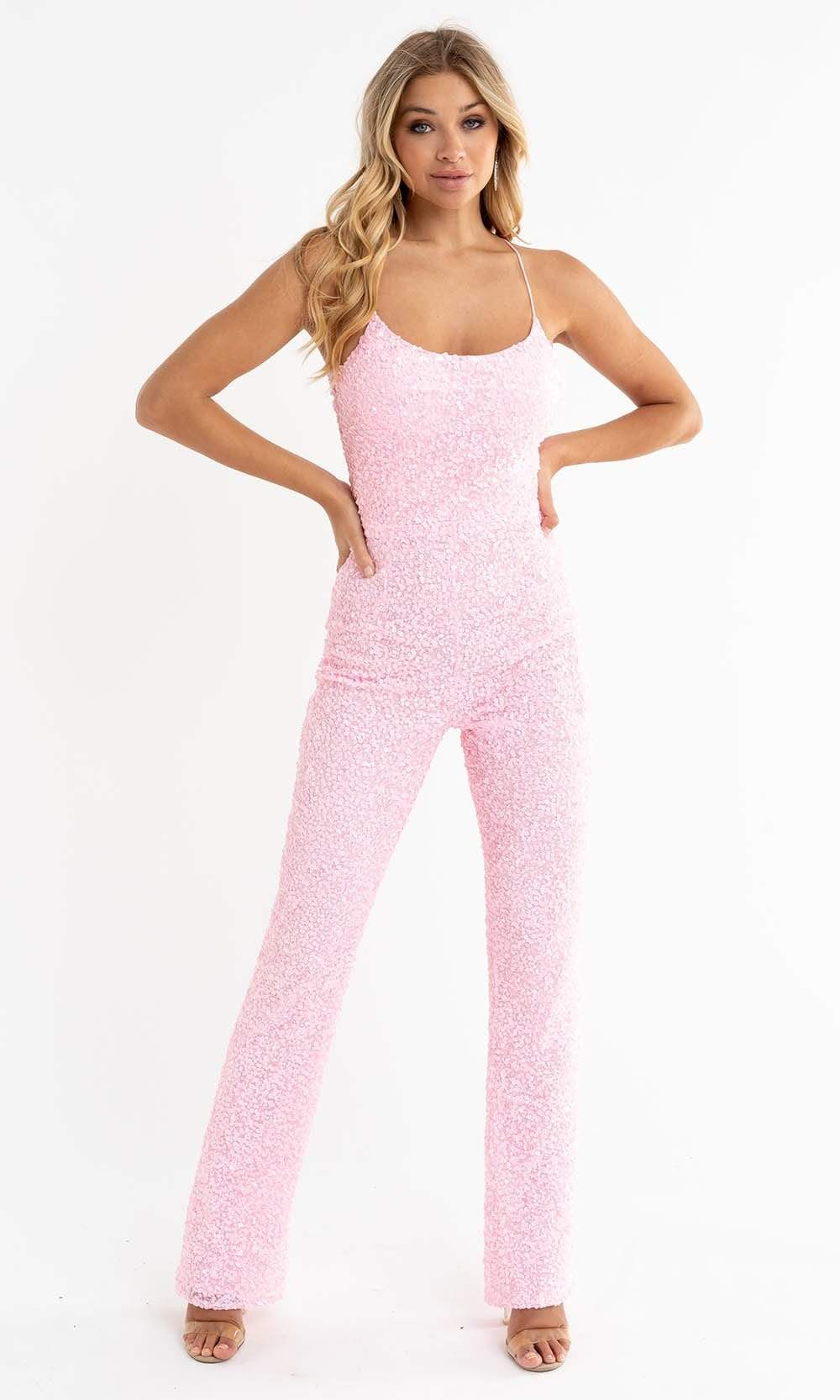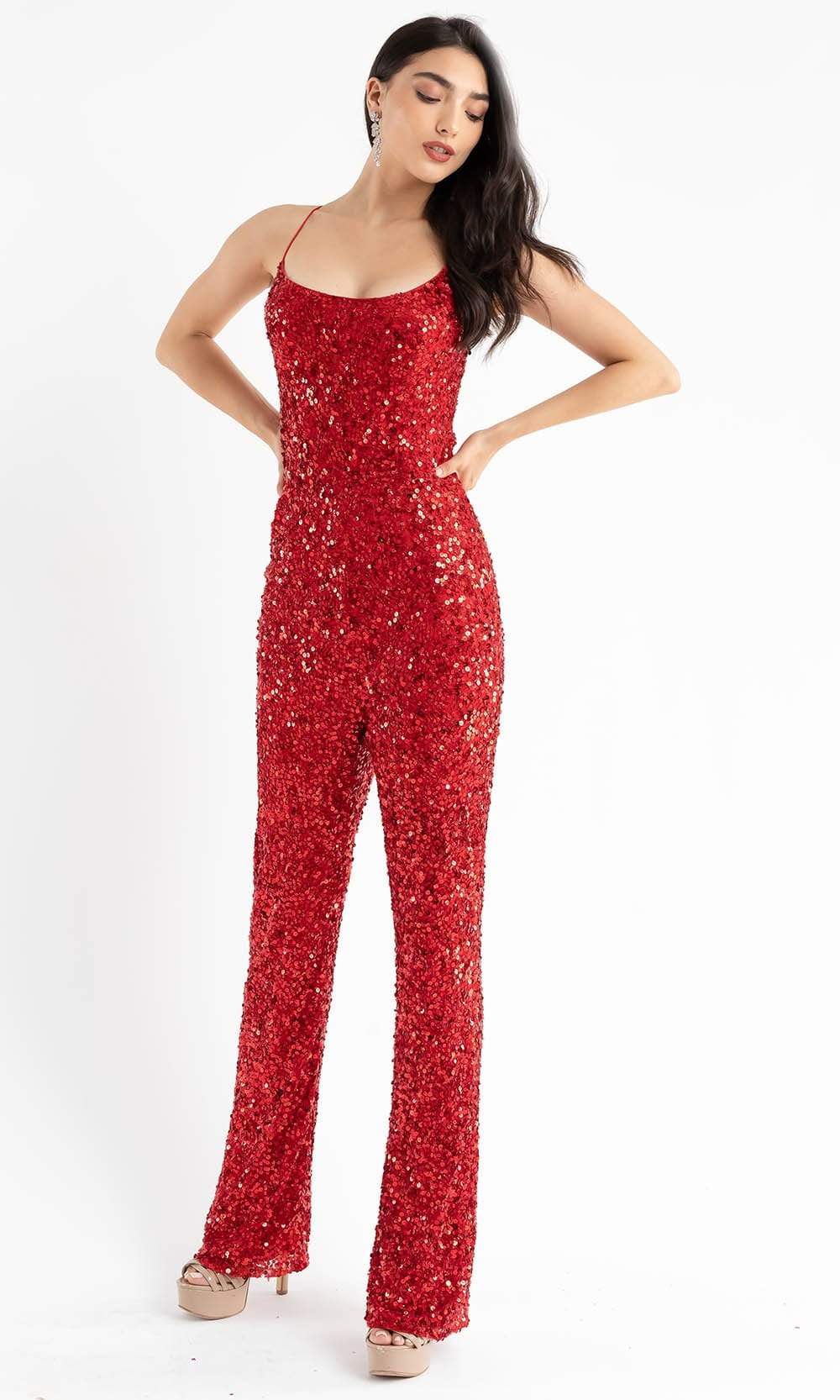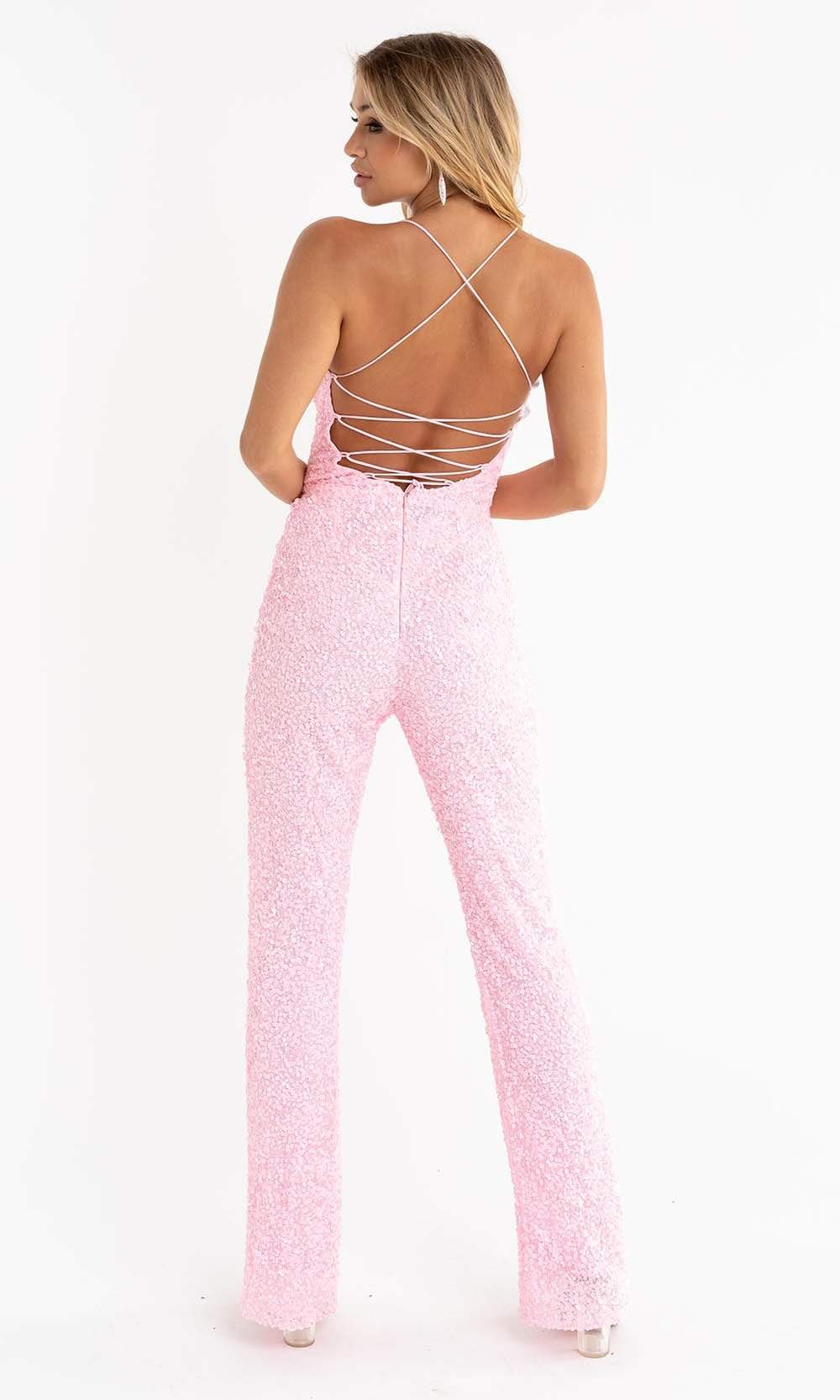 Show off your bubbly and pleasant personality with this sequin jumpsuit by Primavera Couture 3774. This gorgeous pair that has a fashionable sleeveless, scoop neckline and thin spaghetti straps that lace up and tie in the back with fitted bodice would definitely adore everyone in the crowd. This Primavera Couture is tailored to fit your curves. Primavera Couture's sparkling long sequin dresses and cocktail dresses will dazzle you with compliments as these dresses are extremely impressive. Find more Formal Pantsuits.