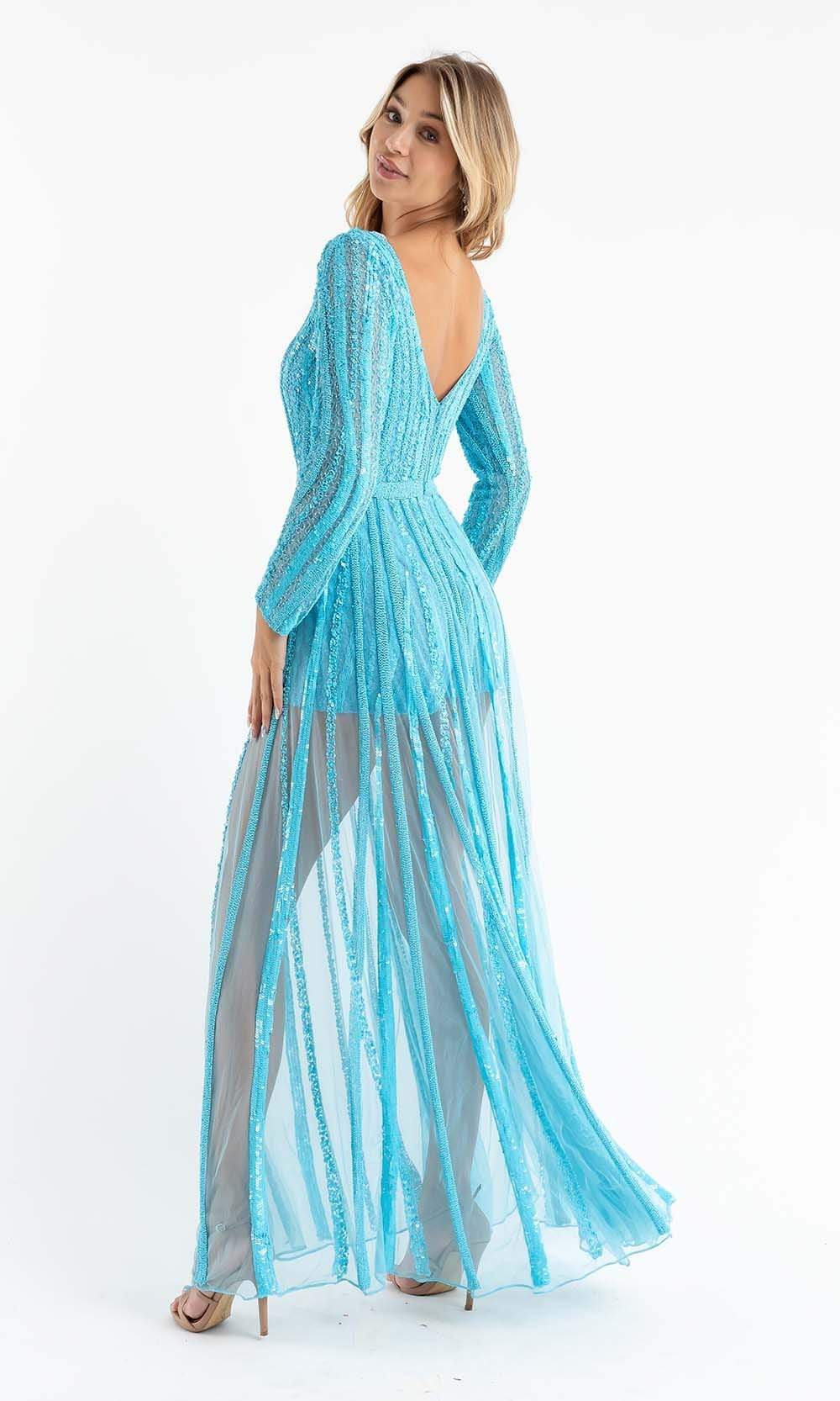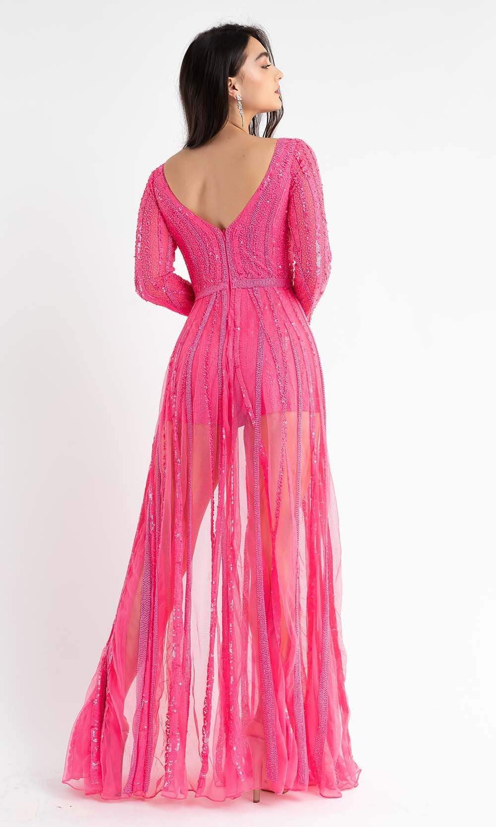 Get noticed in any crowd wearing this Primavera Couture 3777. This long sleeve romper has a V neckline with a sheer panel and a mid scoop open back. The fitted bodice and shorts are designed with rich beaded and sequin lace appliques. To add drama to the look is a sheer beaded overskirt. Primavera Couture is perfect for a standout style and flawless fit. Primavera Couture's sparkling long sequin dresses and cocktail dresses will dazzle you with compliments as these dresses are extremely impressive.