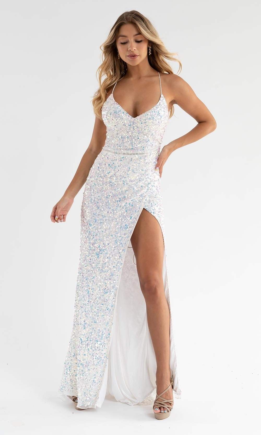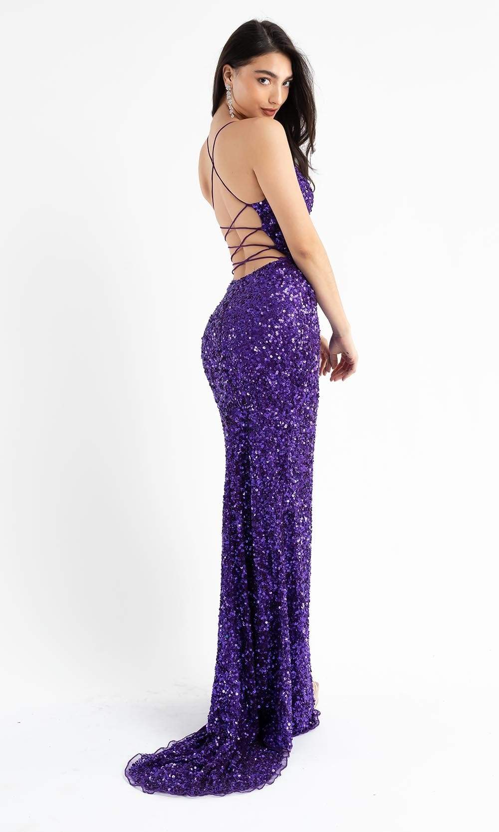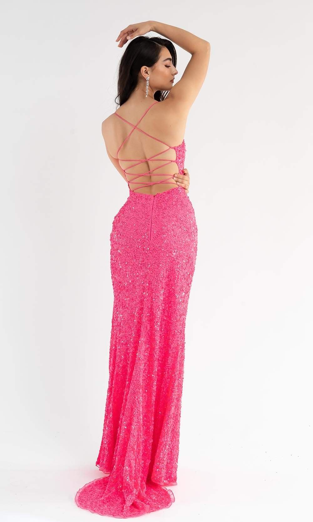 Show off your classy style when you wear this Primavera Couture 3791. This sequin long dress with spaghetti straps with crisscross back and a high slit is totally amazing as it captures everyone's eyes. The skirt forms a full length  sheath silhouette and finishes in a sweep train This stunning sequined creation by  Primavera Couture is definitely a worthy addition to your formal wardrobe. Primavera Couture's sparkling long sequin dresses and cocktail dresses will dazzle you with compliments as these dresses are extremely impressive.