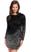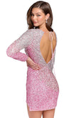 Enhance your visual appeal in this luxurious Primavera Couture 3819. This figure-hugging dress is covered from top to bottom in shimmering sequins, which combine to provide an asymmetrical ombre effect at the hemline of the dress. A high neckline and long sleeves will provide you with a sense of confidence. This dress is finished with a slit that is located below at the side front of the sheath skirt and an open back. This Primavera Couture is both comfortable and elegant perfect for a formal party night! Models are wearing Black, Light Blue, and Pink colors.