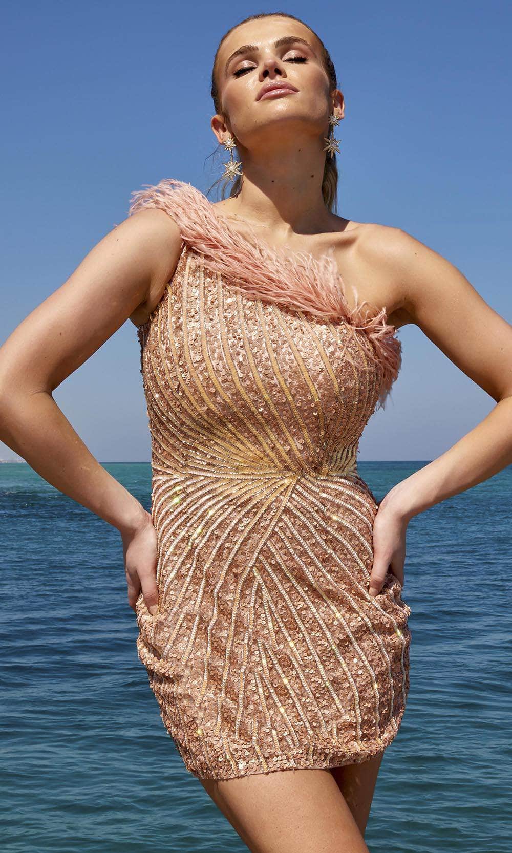| Details: | Sleeveless, Fitted, Sequin Embellished, Feather, Mid-Thigh Length, Asymmetrical Back, Back Zipper |