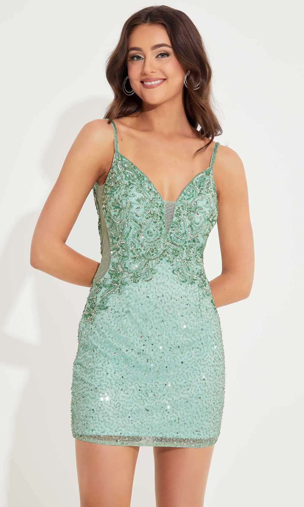Glow with a sophistication like no other in this gorgeous Primavera Couture 4245, an enchanting sleeveless cocktail dress, adorned with a mesmerizing mix of beads and sequins. It features a daring plunging V-neckline and an open back, adding a touch of bold allure. Designed with a center zipper closure for a secure fit, it boasts a short-length skirt in a sleek sheath silhouette. Perfect for any special occasion, this Primavera Couture 4245 radiates a blend of sophistication and glamour. Models are wearing Mint, Nude, and Purple colors.