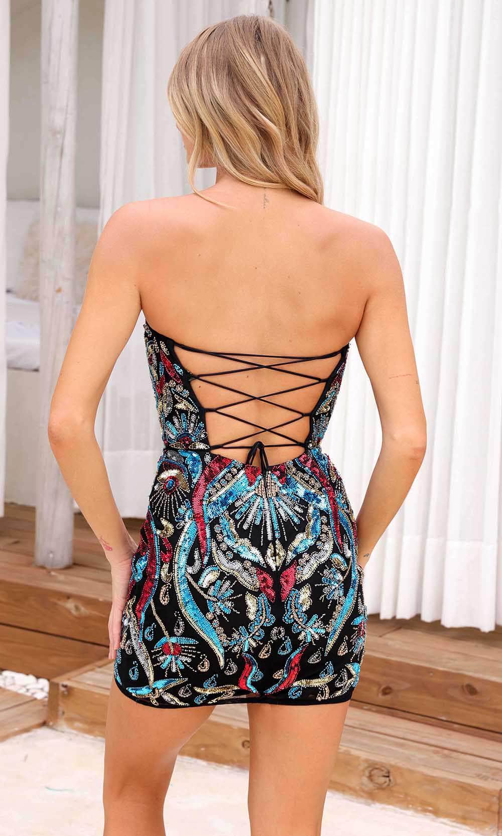 Strike a pose in this dazzling Primavera Couture 4256, an enchanting cocktail dress embellished with sparkling rhinestones. It features a strapless bodice crowned with a V-neckline accented by a sheer insert, adding a touch of allure. The open back, with a lace-up tie and center zipper closure, ensures a secure fit. The short-length skirt, designed in a chic sheath silhouette, completes the look. Perfect for any special occasion, this Primavera Couture 4256 exudes elegance and sophistication. Models are wearing Black, Nude and Orchid colors.
