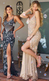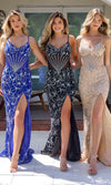 Command the spotlight in a Primavera Couture 4307 gown, where bold design meets refined elegance. This stunning gown is meticulously crafted with intricate tailoring and luxurious fabric, featuring delicate floral and linear embellishments that enhance its silhouette. The spaghetti straps and V-neckline exude sophistication, while the sheer corset bodice provides a figure-flattering, chic look. The midrise back, with a convenient zipper closure, offers a seamless fit. The sheath skirt, featuring a daring high slit, adds a touch of drama, while the sweep train delivers an elegant, flowing finish. Perfect for any upscale event, the Primavera Couture 4307 gown ensures you make a lasting impression. Models are wearing the Black, Nude, and Royal Blue colors.