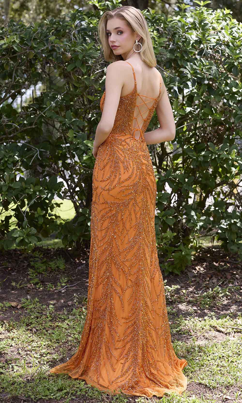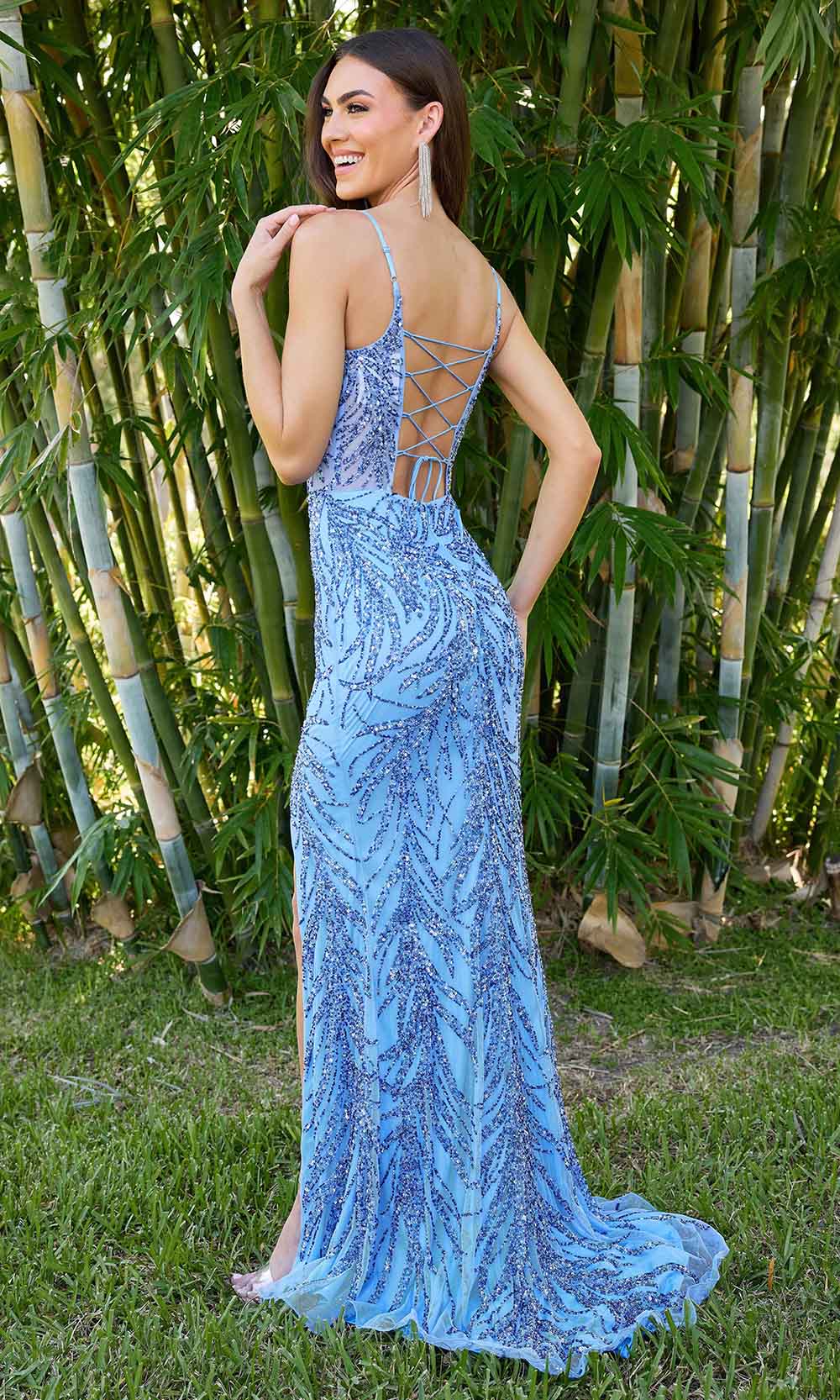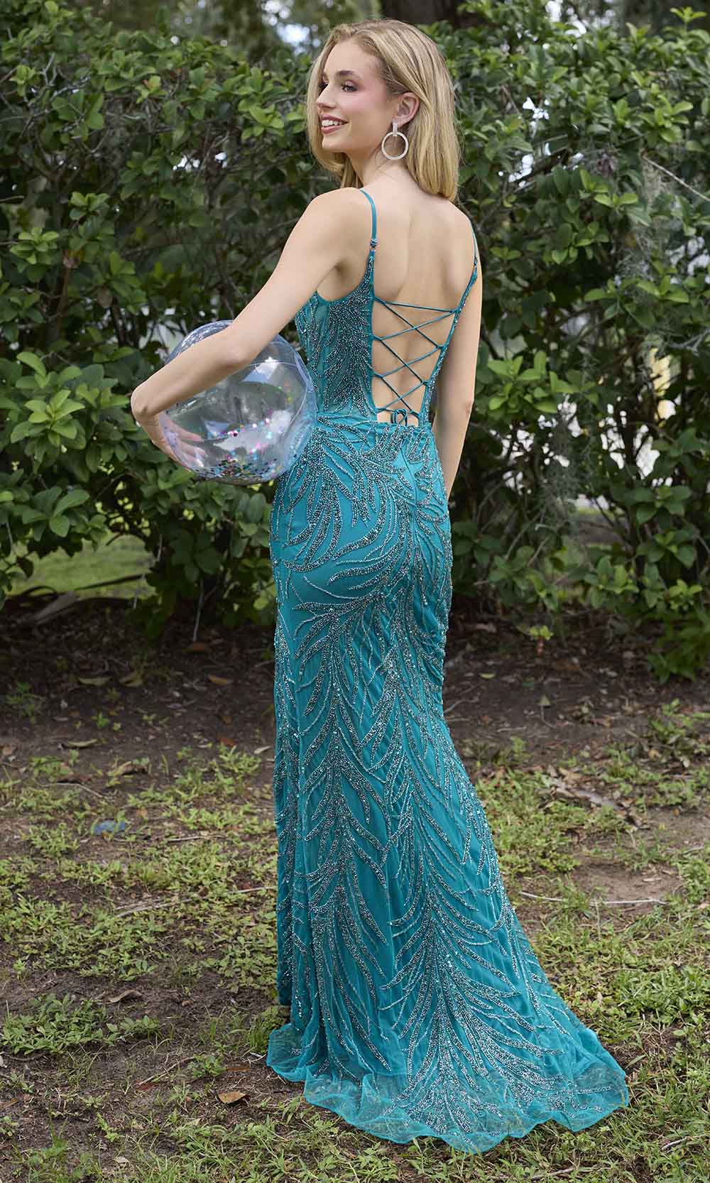 Step into sophistication with the Primavera Couture 4310 gown, a masterpiece of timeless elegance and intricate craftsmanship. This captivating design showcases sleek tailoring lines on luxurious fabric, offering a polished and refined fit. The soft scoop neckline is framed by delicate spaghetti straps, while foliage-inspired beadwork graces the gown, exuding natural beauty. The lace-up open back adds a modern and charming detail, complementing the alluring sheath skirt. Featuring a daring high slit and a sweeping train, this gown is the perfect choice for any formal occasion, blending sophistication with allure. Be unforgettable in the Primavera Couture 4310 ensemble, where elegance reigns supreme. Models are wearing the Azurre, Black, Neon Pink, Orange, and Teal colors.