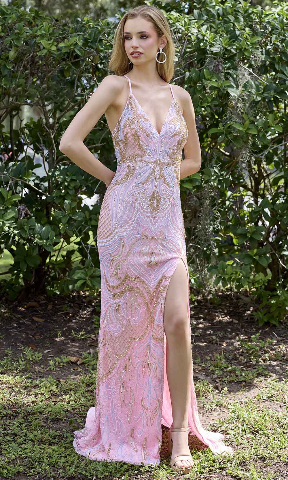 | Details: | Multi-Patterned Sequins, Spaghetti Straps, Plunging Back with Crisscross Straps, High Slit, Sweep Train |