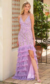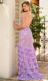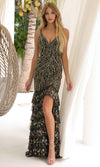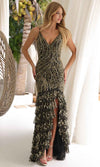 Showcase your style with a Primavera Couture 4315 dress, where sophistication and glamour effortlessly blend together. This stunning gown features luxurious lining and detailed embellishments, with tailored lines that flatter your figure. Beaded foliage accents add refinement to the form-fitting silhouette, while the spaghetti straps and deep V-neckline create an alluring focal point. The open back, adorned with lace-up detailing, adds a sensual touch. The trumpet skirt gracefully flares with tiered layers, a daring slit, and a sweeping train, making it the perfect choice for an unforgettable, glamorous appearance. Step into the spotlight with a Primavera Couture 4315 gown, designed for an unforgettable presence. Models are wearing the Azurre, Black Gold, and Lavender colors.