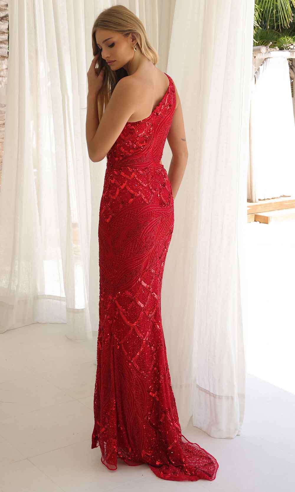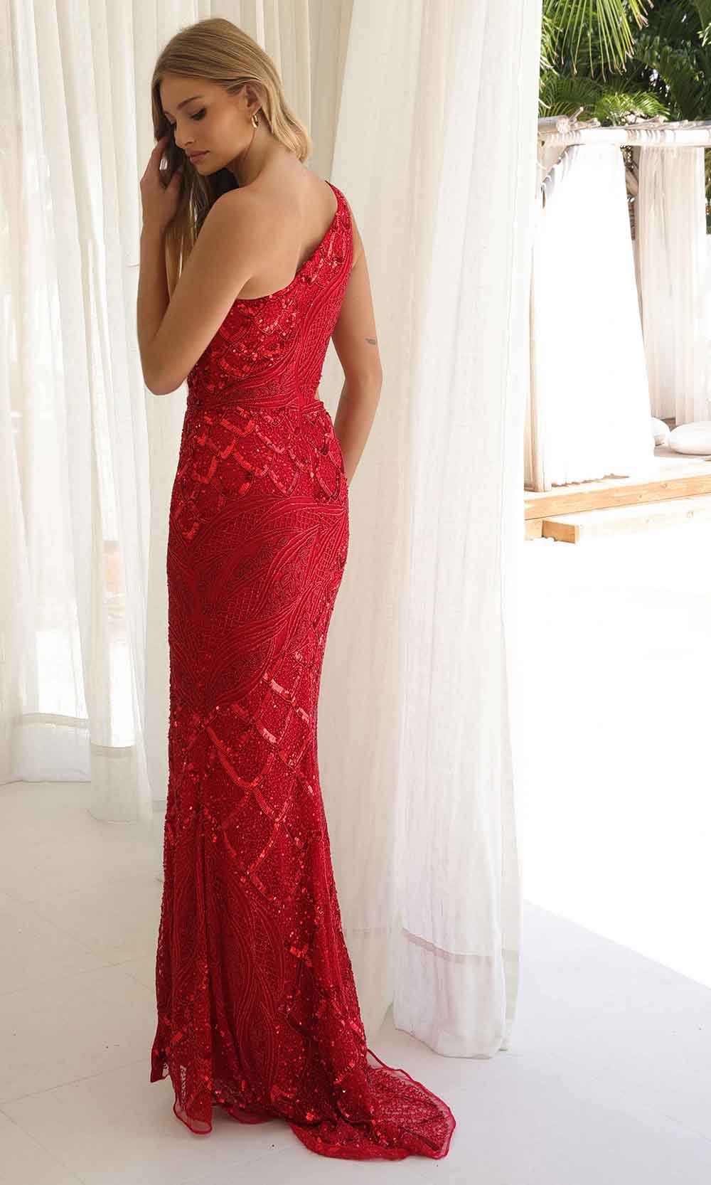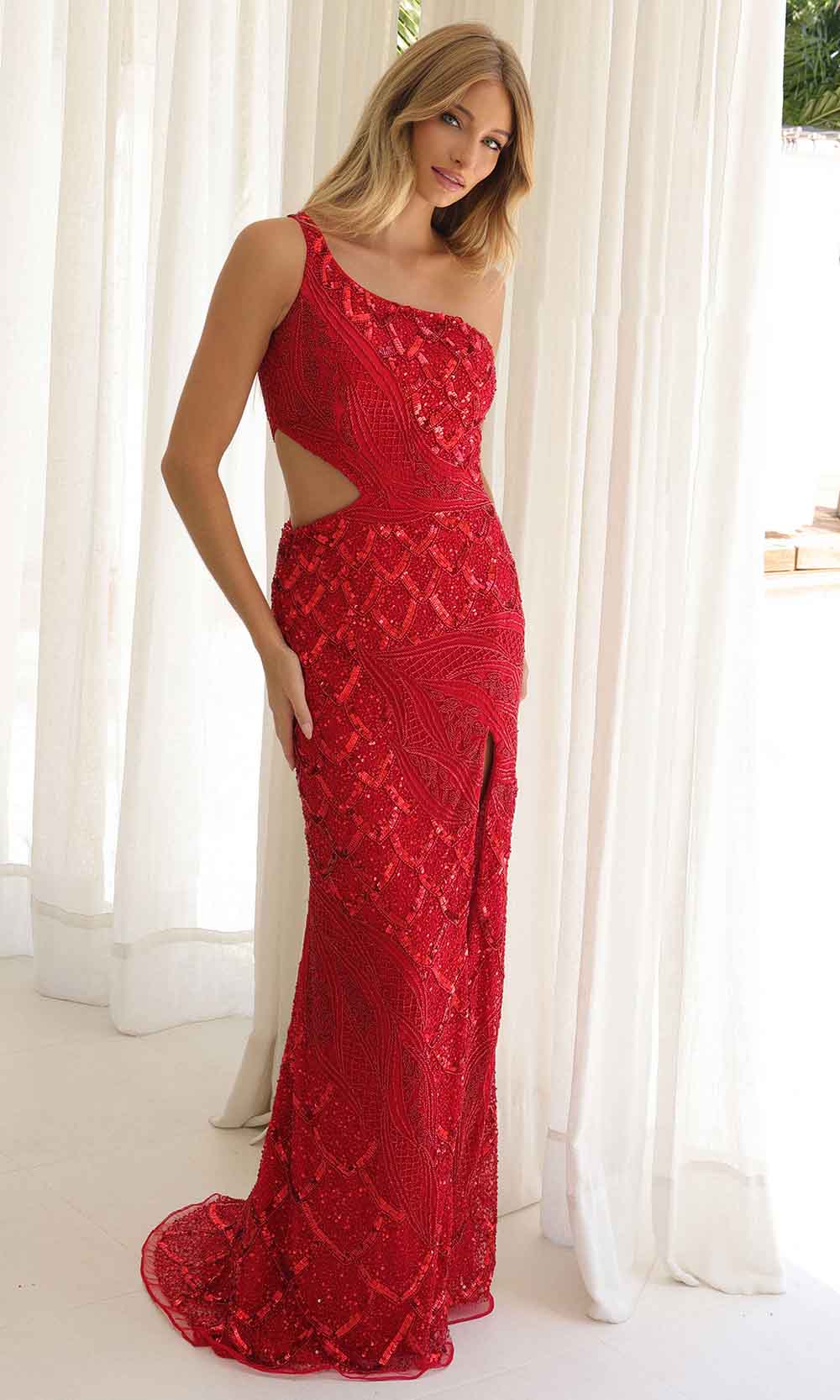 Captivate every eye in a Primavera Couture 4329 ensemble, where exquisite embellishments and perfect tailoring come together. Crafted from luxurious fabric and adorned with sequins arranged in linear patterns, this gown sparkles with elegance. The sleeveless design features a one-shoulder neckline, complemented by angular side cutouts for a modern flair. The midrise back, with a zipper closure, ensures a seamless fit. The sheath skirt, enhanced by a daring high slit, adds both drama and ease of movement. The gown finishes with a sweeping train, creating a graceful, sophisticated silhouette perfect for an unforgettable evening. Embrace your beauty in the Primavera Couture 4329 dress, where refined craftsmanship meets intricate detail. Models are wearing the Black, Red, and Royal Blue colors.