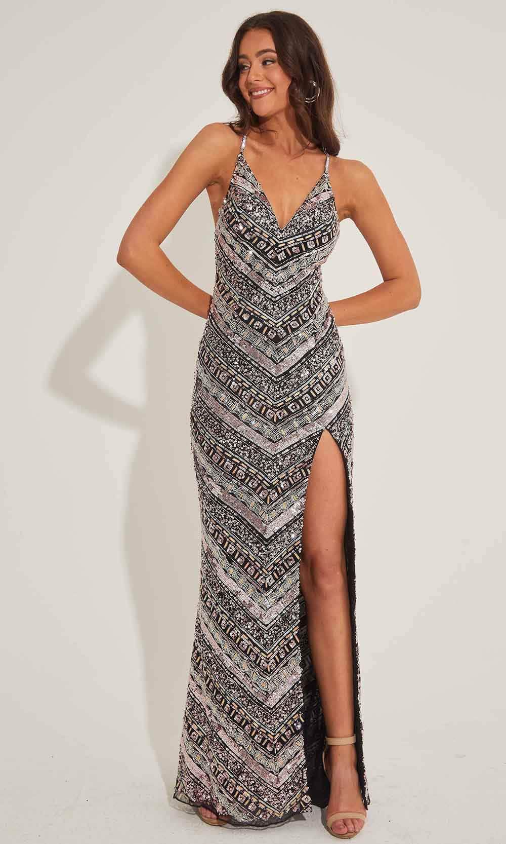 Envelop yourself in the radiant glow of this Primavera Couture 4349 creation. Adorned with sequin and beaded in eye-catching geometric patterns, this sleeveless dress will guarantee a show-stopping entrance. A plunging V-neckline exudes femininity, and the spaghetti strapless fascinatingly creates a crisscross detail in the daring open back. Finished with a graceful sweep train, the skirt is perfectly fitted in a sheath silhouette and breaks a high slit to lengthen your legs. Take center stage in the fashionable Primavera Couture 4349 dress. Models are wearing Black, and Emerald colors.
