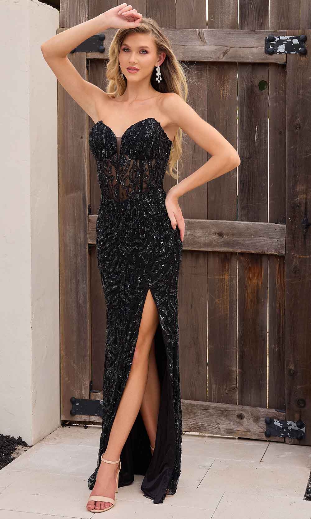 Details: Strapless, Beaded, Sequins, Open Back, Concealed Back Zipper, Sweep Train, High Slit, Fitted