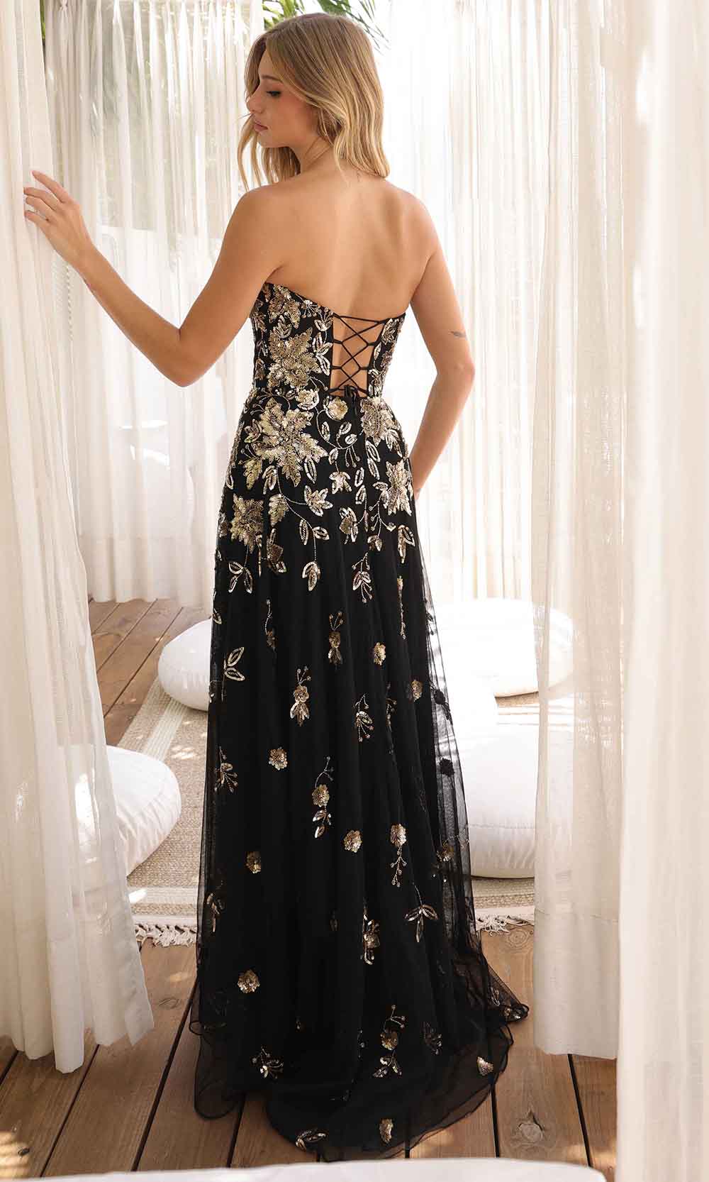 | Details: | Strapless, Sequin, Beaded, High Slit, Open Lace-Up Back, Floor Length |