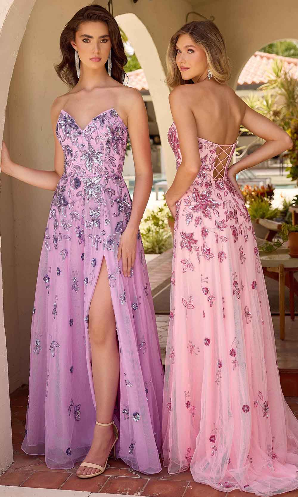 Step into the spotlight and let your beauty blossom in this Primavera Couture 4361 masterpiece. Embellished with floral sequins and beading, this stunner exudes femininity and a mesmerizing sparkle. A plunging V-neckline perfectly complements the striking open lace-up back for a hint of allure. The skirt creates a dreamy A-line silhouette that glides to the floor and opens a high slit for the flirtatious edge. Light up the night in the Primavera Couture 4361 prom dress. Models are wearing Black Gold, Orchid, and Pink colors.