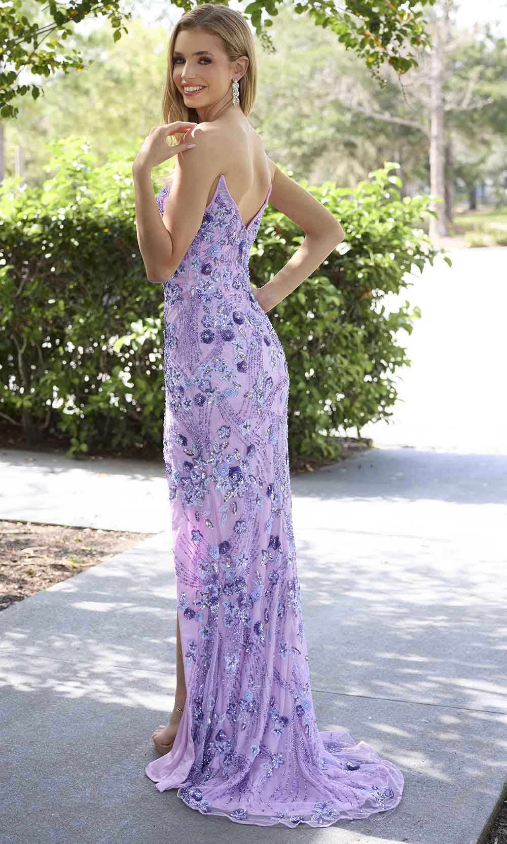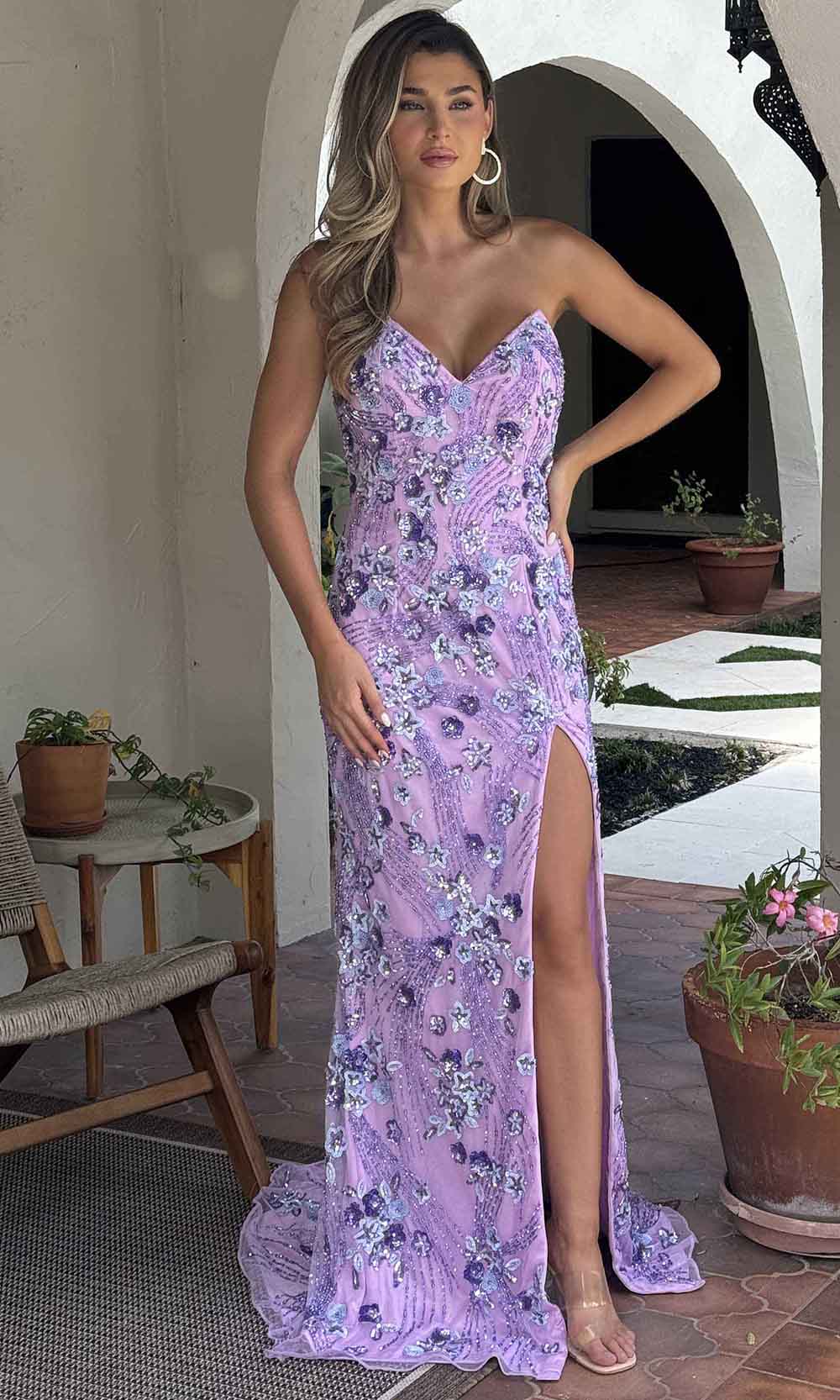 Beam with pride when you wear this blossoming design from Primavera Couture 4374. This strapless dress radiates an air of luxury with its floral sequin details and beadwork. The v-neckline pairs beautifully with the midrise V-back, offering a hint of sultriness. Move freely and elegantly with the thigh-high slit on the side. With a gorgeous drop to the sweep train, the skirt emphasizes your curves in a sheath silhouette. This Primavera Couture 4374 design is the perfect choice for anyone looking to steal the limelight. Models are wearing Black Multi, Lilac, and Neon Pink colors.