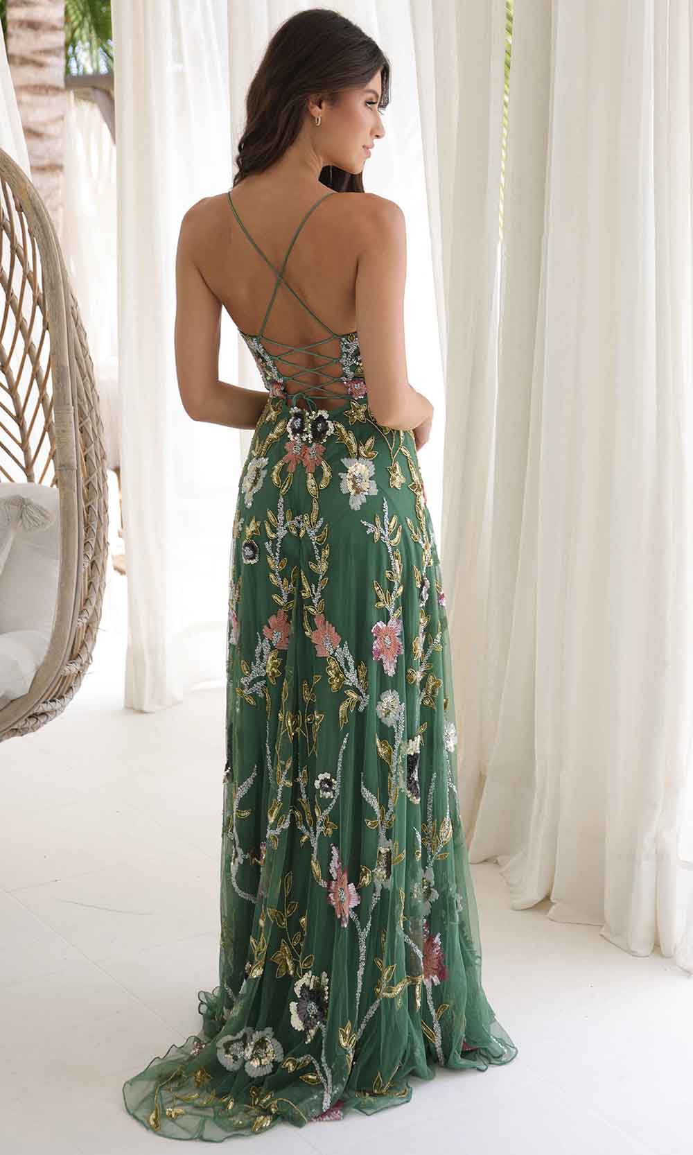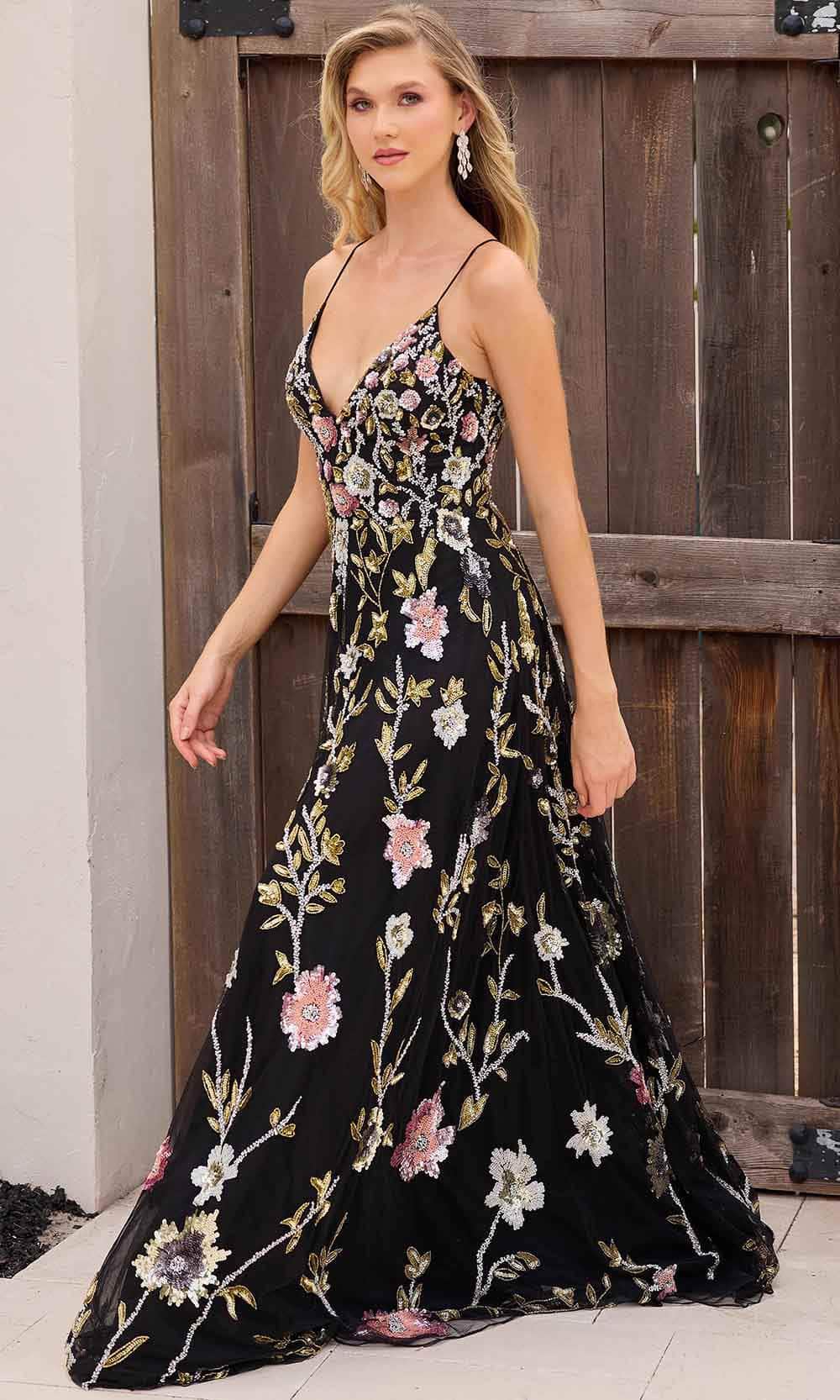 Romantic chic has never been this easy with this Primavera Couture 4378 gown. This masterpiece is fully embellished with sequins in a stunning floral pattern, creating a captivating visual effect. The sleeveless fitted bodice features a V-neckline, offering a touch of sophistication. Supported by delicate spaghetti straps that crisscross at the back and finish with a lace-up tie, this gown ensures a secure and perfect fit with a back zipper closure. The floor-length skirt flows in a graceful A-line silhouette, ending with a sweeping train that adds movement and drama. Ideal for formal events, this Primavera Couture 4378 blends classic charm with modern allure, ensuring you make a memorable entrance. Models are wearing Black and Sage colors.