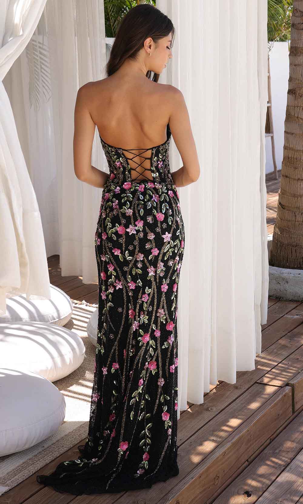| Details: | Strapless, Floral Sequin, Beaded, High Slit, Open Back, Lace-Up Closure, Sweep Train |