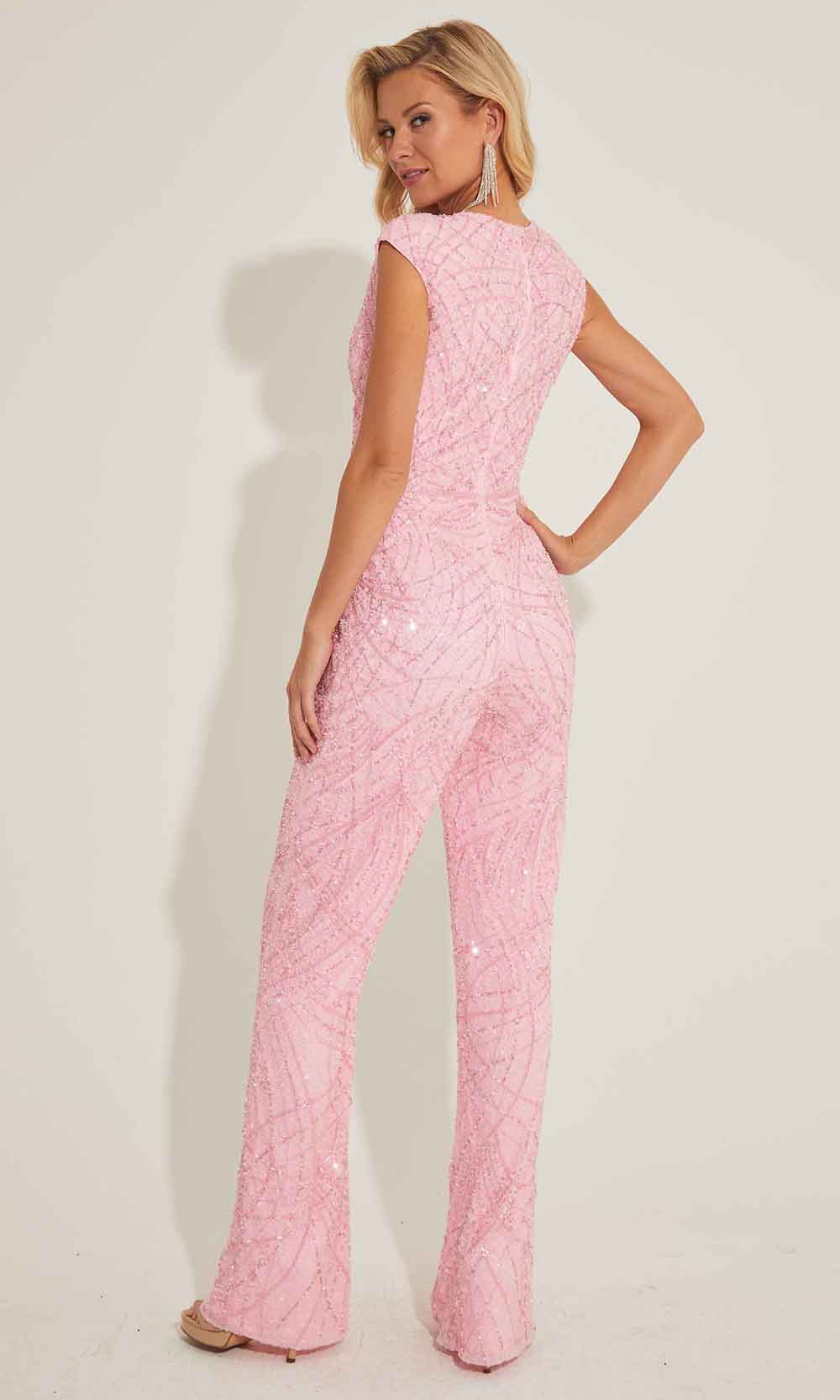 Be ready to fascinate everyone with this Primavera Couture 4384 jumpsuit. This exquisite piece is fully embellished with sparkling beads, providing a luxurious and eye-catching look. The jumpsuit boasts cap sleeves and a V-neckline, adding a touch of sophistication. A full back design ensures comfort and style, while a concealed zipper closure offers a flawless fit. The floor-length straight leg pants create a sleek silhouette, perfect for formal occasions. Combining modern allure with classic elegance, this Primavera Couture 4384 is perfect for making a memorable statement at any special event. Models are wearing Pink and Teal colors.