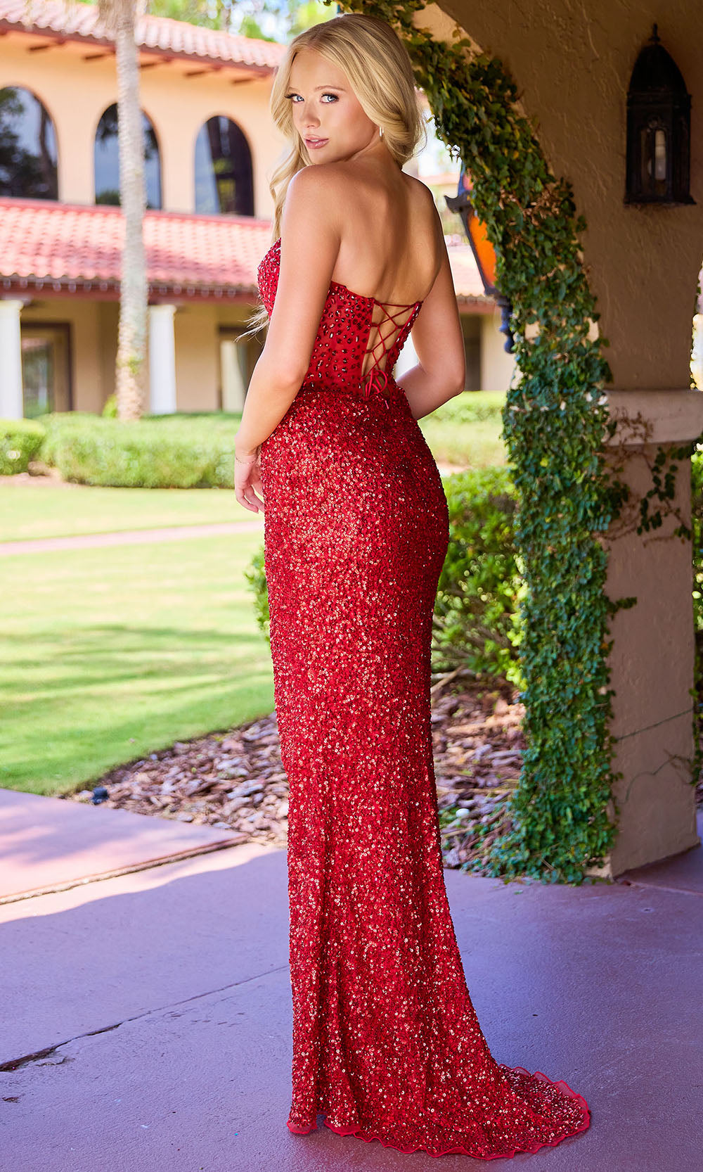 Defined by its refined structure and shimmering detail, Primavera Couture 4544 dress radiates sophistication and artistry. A strapless v-neckline accentuates the shoulders, leading to an illusion corset bodice that contours the frame. The sheath skirt features a thigh-high slit, bringing a modern contrast to its structured design. Subtle ruching at the waist enhances the silhouette, ensuring a perfect finish. For formal gatherings or red-carpet moments, Primavera Couture 4544 delivers a perfect harmony of elegance and allure. Models are wearing Nude, Peacock, Platinum, and Red colors.