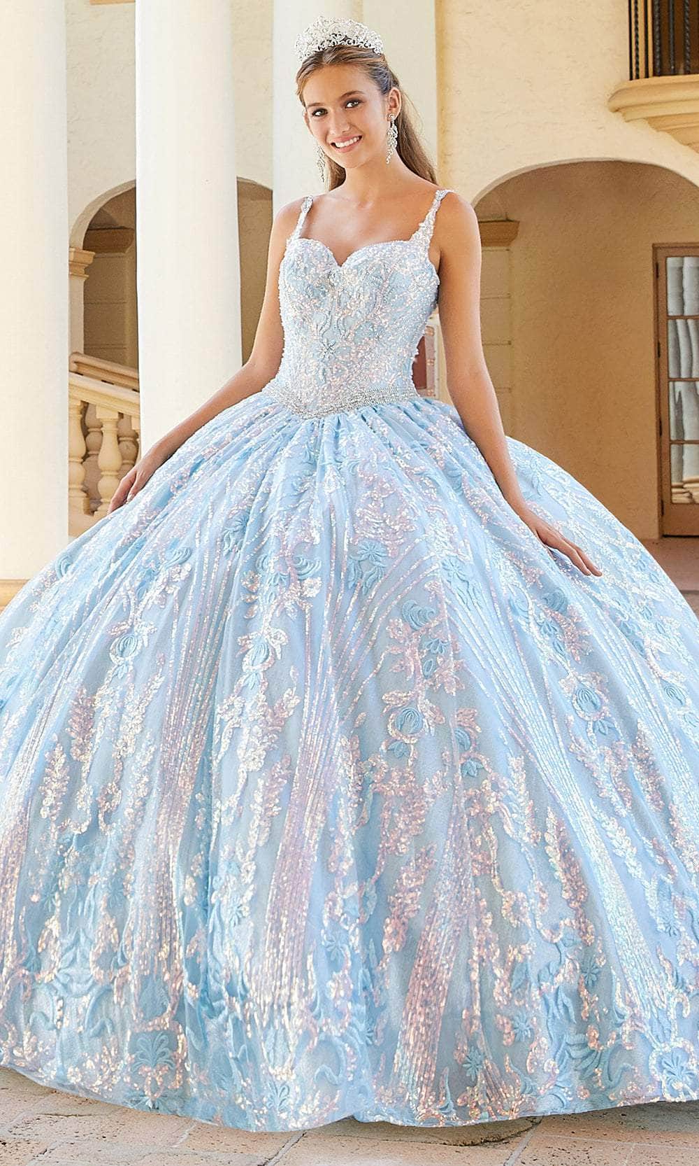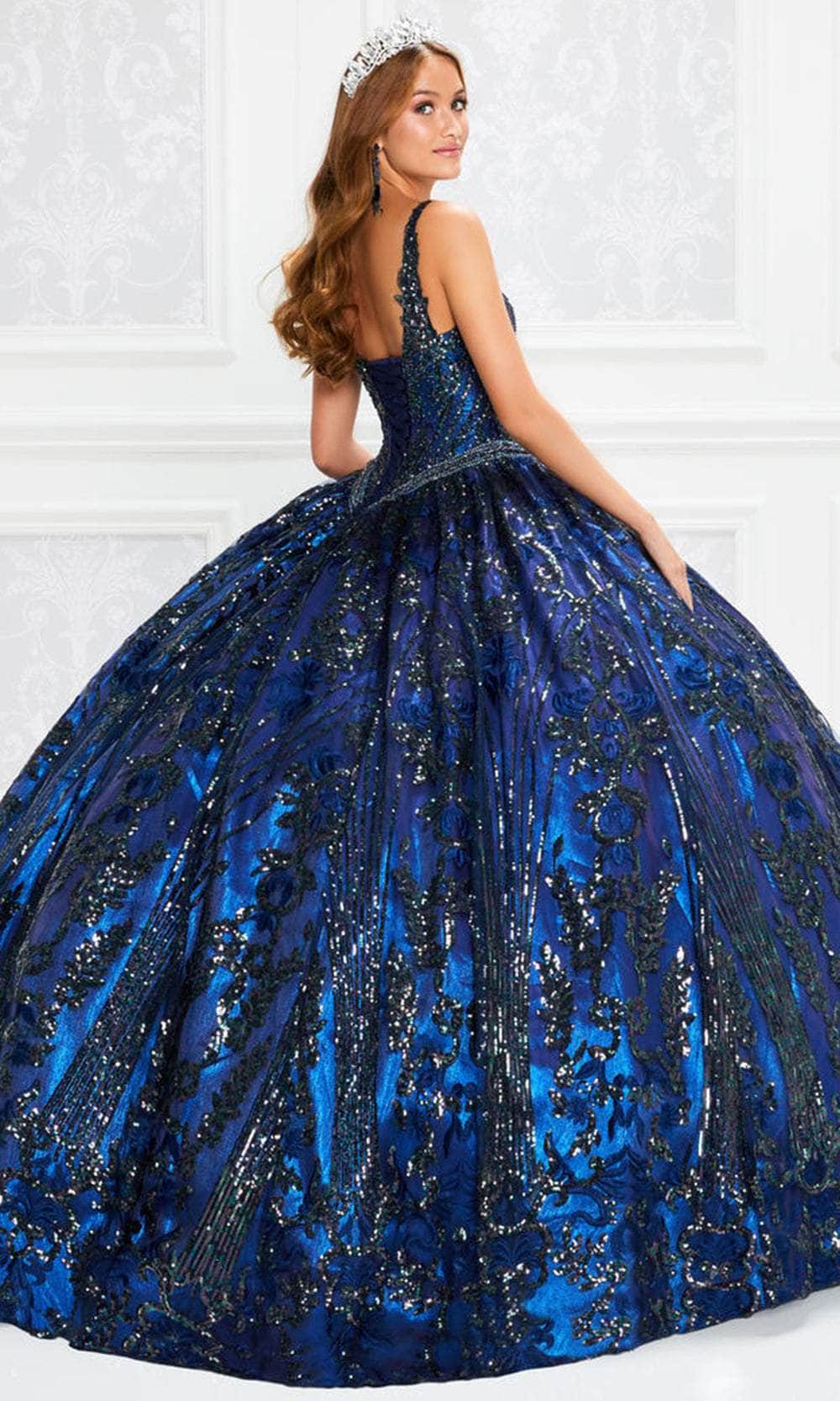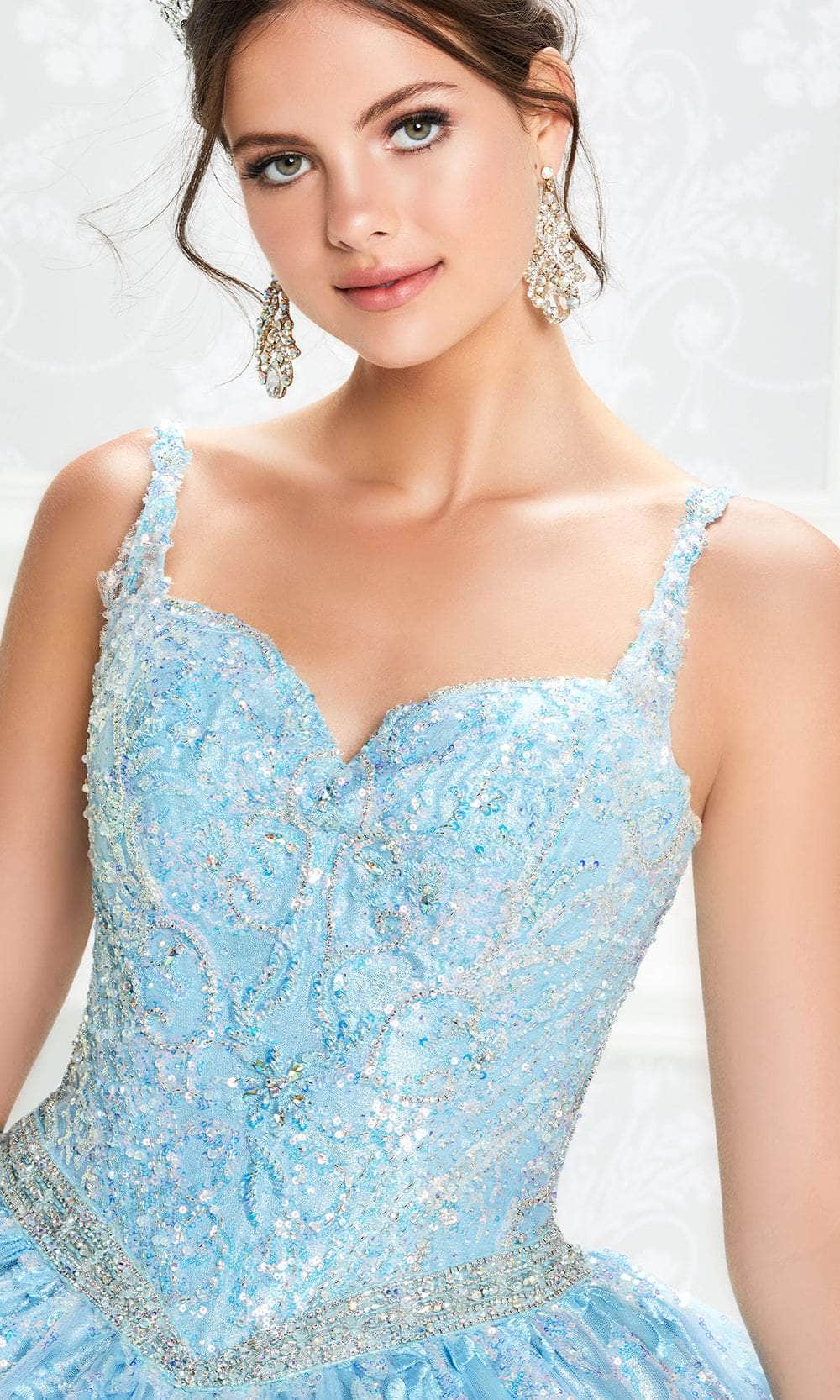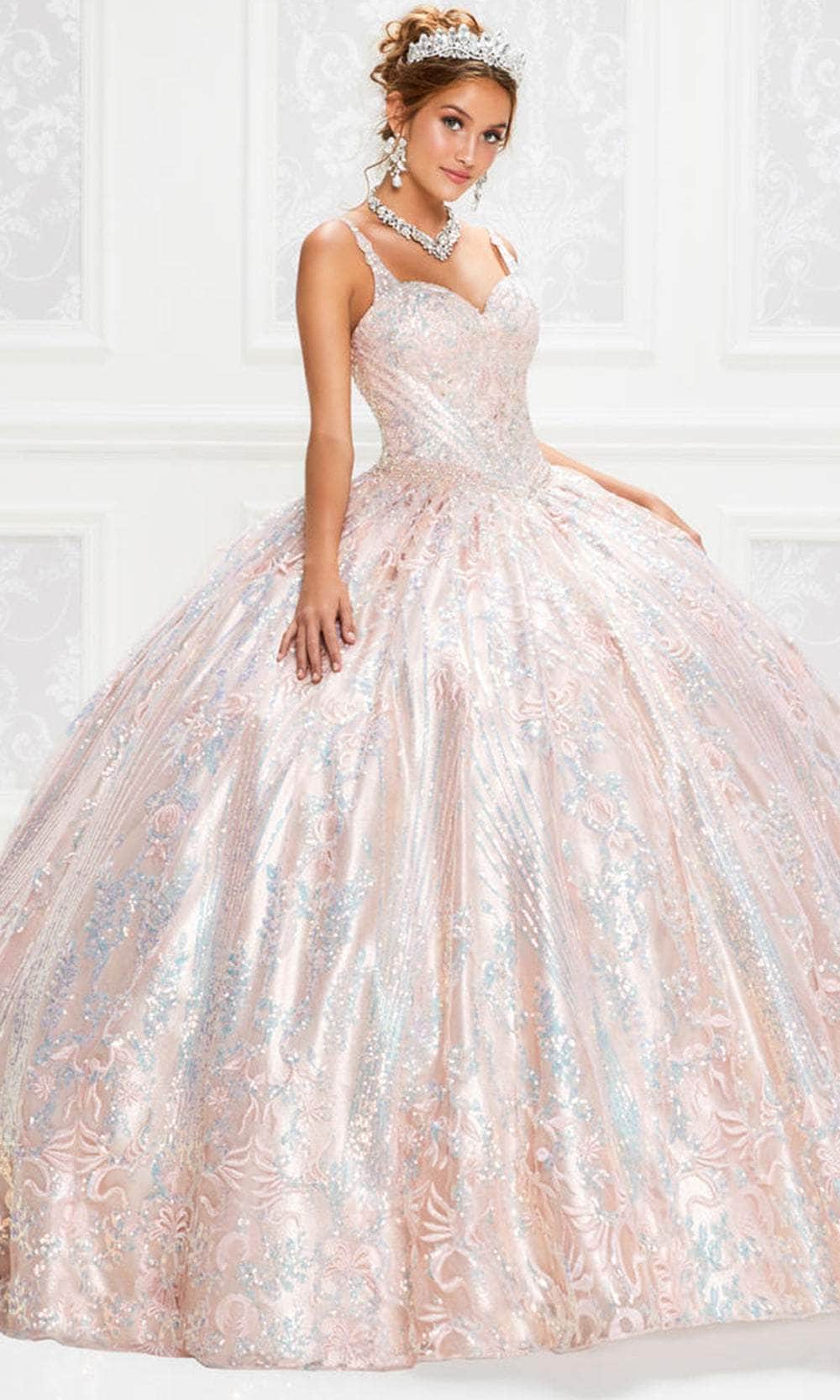 Sparkle and dazzle everyone with this Princesa by Ariana Vara PR12009 gown, a perfect choice for your Quinceañera celebration. This stunning ball gown features luxurious cracked ice fabric and lace appliques, creating a captivating and textured look. The queen Anne neckline and beaded cap sleeves add a touch of sophistication, while the Basque waist highlights the figure beautifully. The gown is adorned with shimmering stone accents, and the keyhole detail at the back adds a hint of allure. Complete with a scalloped lace trim and a sweep train, this Princesa by Ariana Vara PR12009 ensures an unforgettable entrance fit for royalty. Model is wearing Ice Blue color.