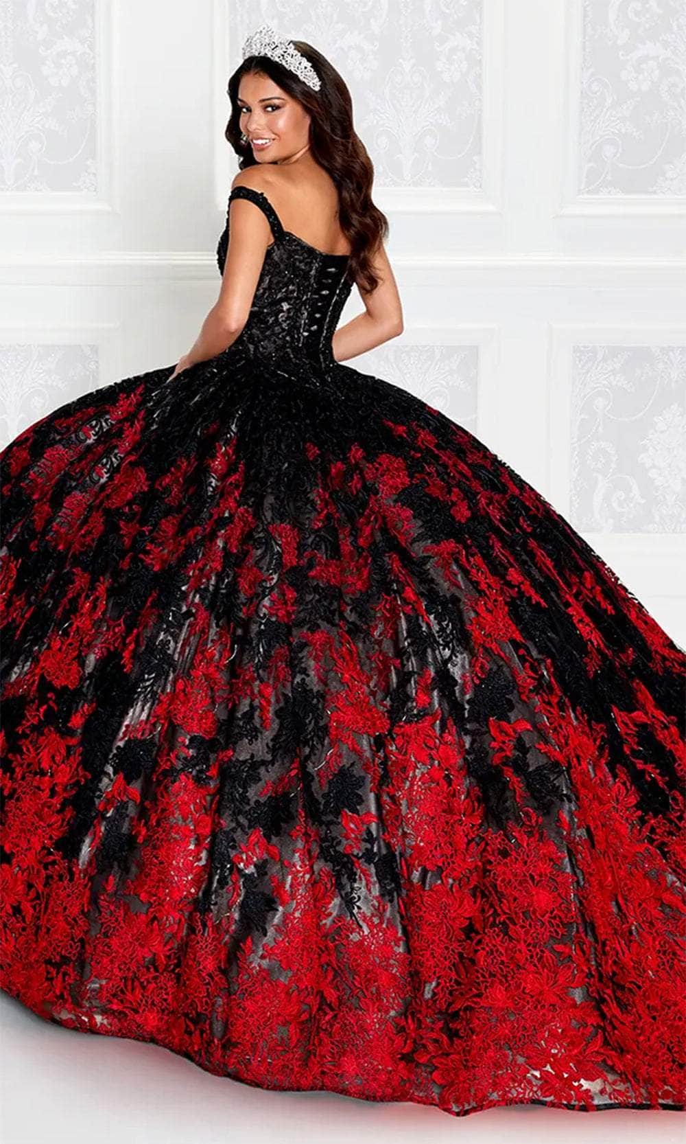 Experience the magic of your Quinceañera with the enchanting Princesa by Ariana Vara PR12275 gown, designed to make you shine like a true princess. This stunning ball gown features intricate beading and embroidered lace that exudes elegance, while the glitter tulle adds a touch of sparkle. The V-neck bodice with an off-the-shoulder design offers a romantic silhouette, and the natural waistline flatters the figure beautifully. For added versatility, the gown comes with a bolero jacket and detachable off-the-shoulder sleeves. To make your celebration even more magical, the Princesa by Ariana Vara PR12275 includes built-in lights that illuminate the fabric, ensuring you glow throughout your special day. Models are wearing Ivory/Hot Pink and Black/Red colors.