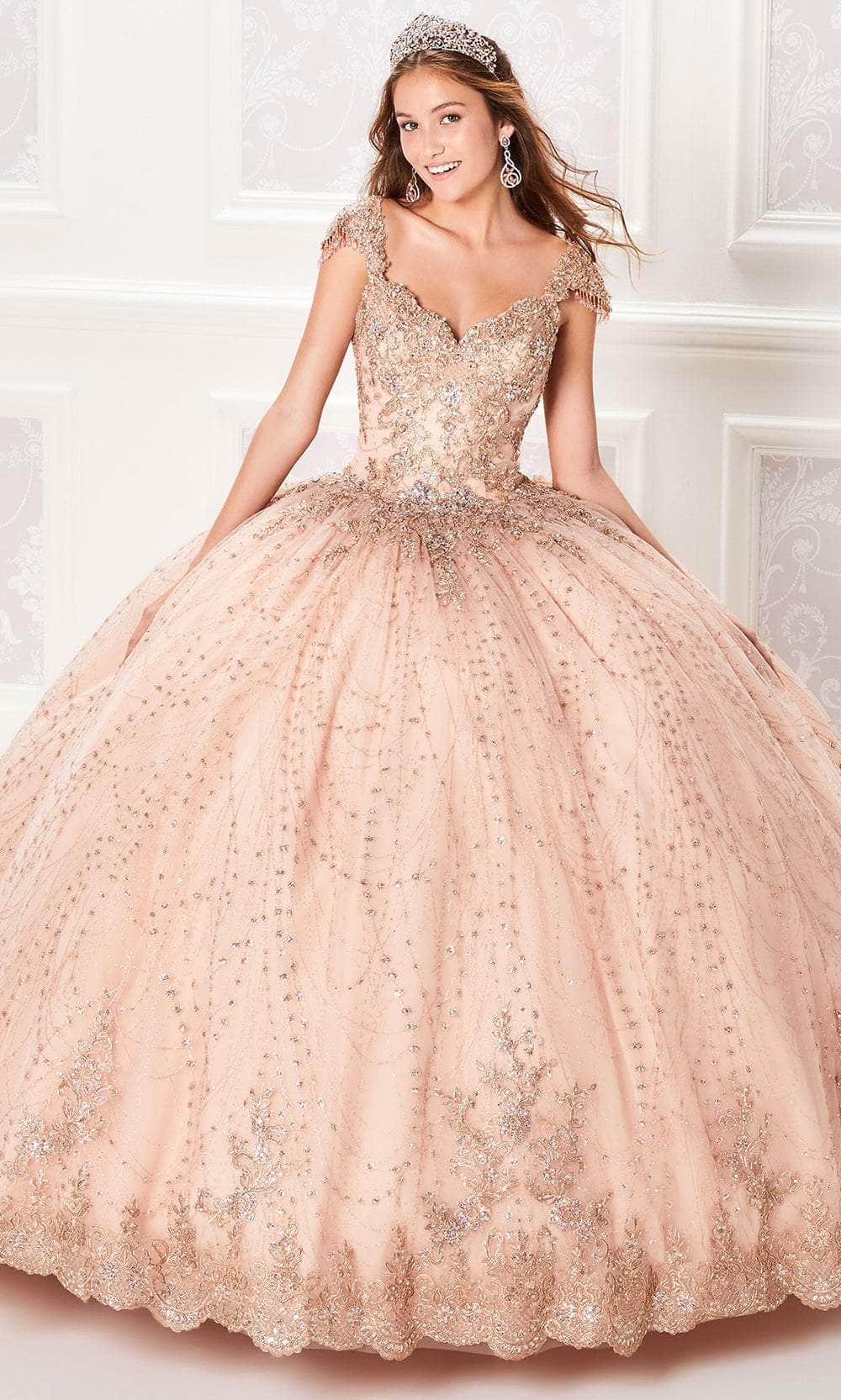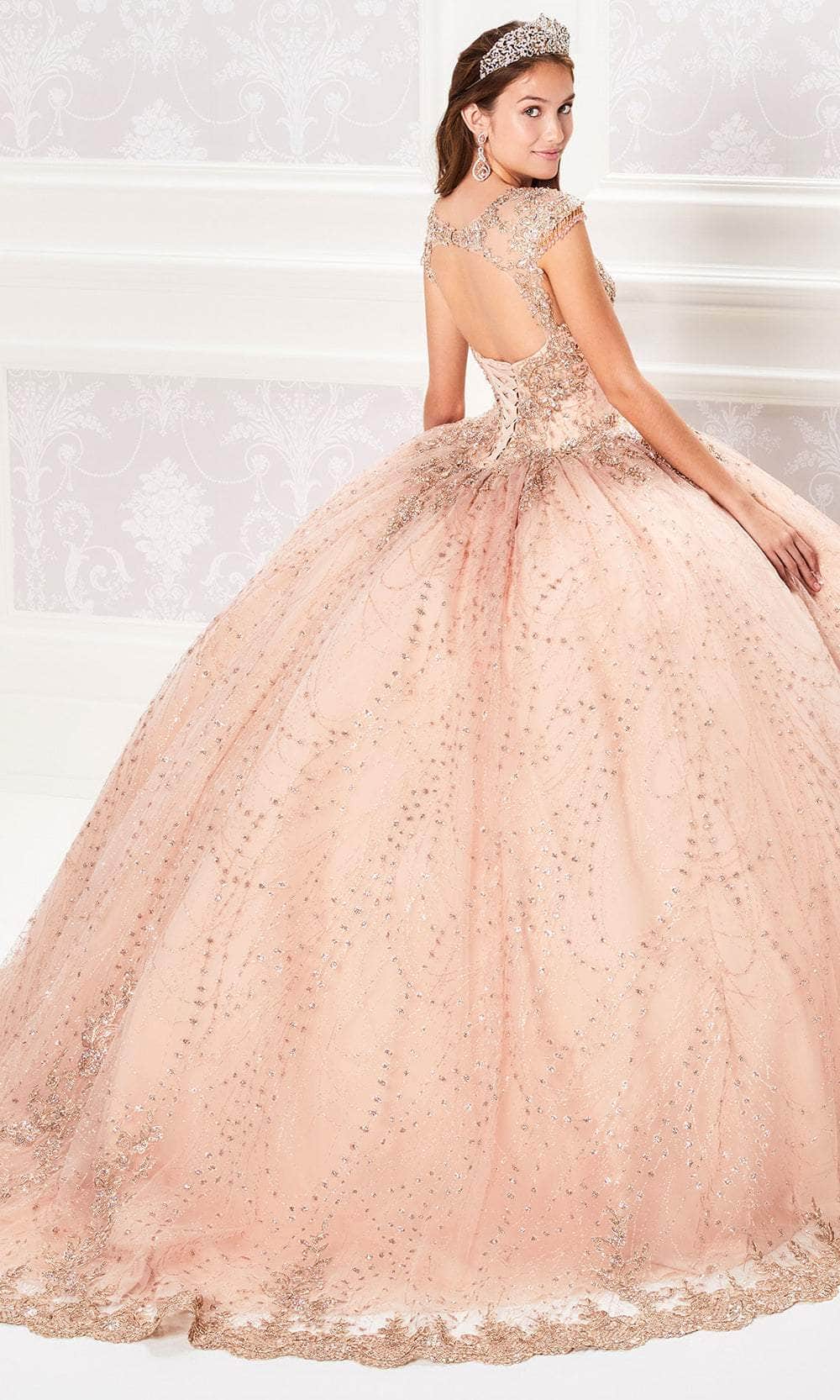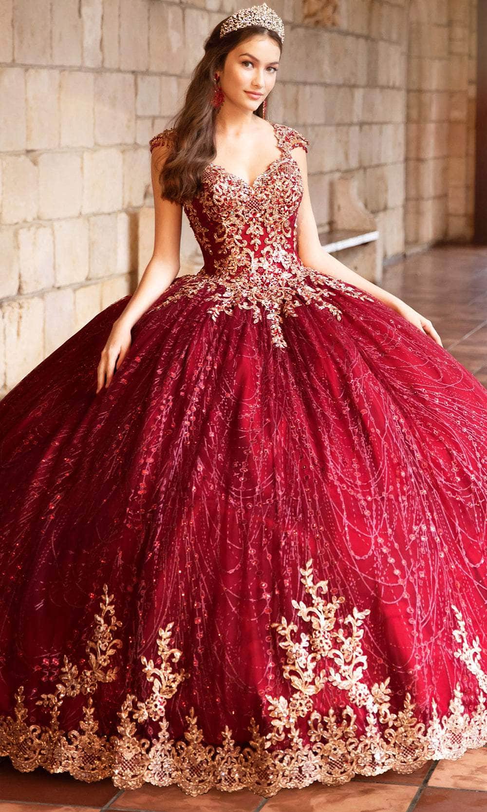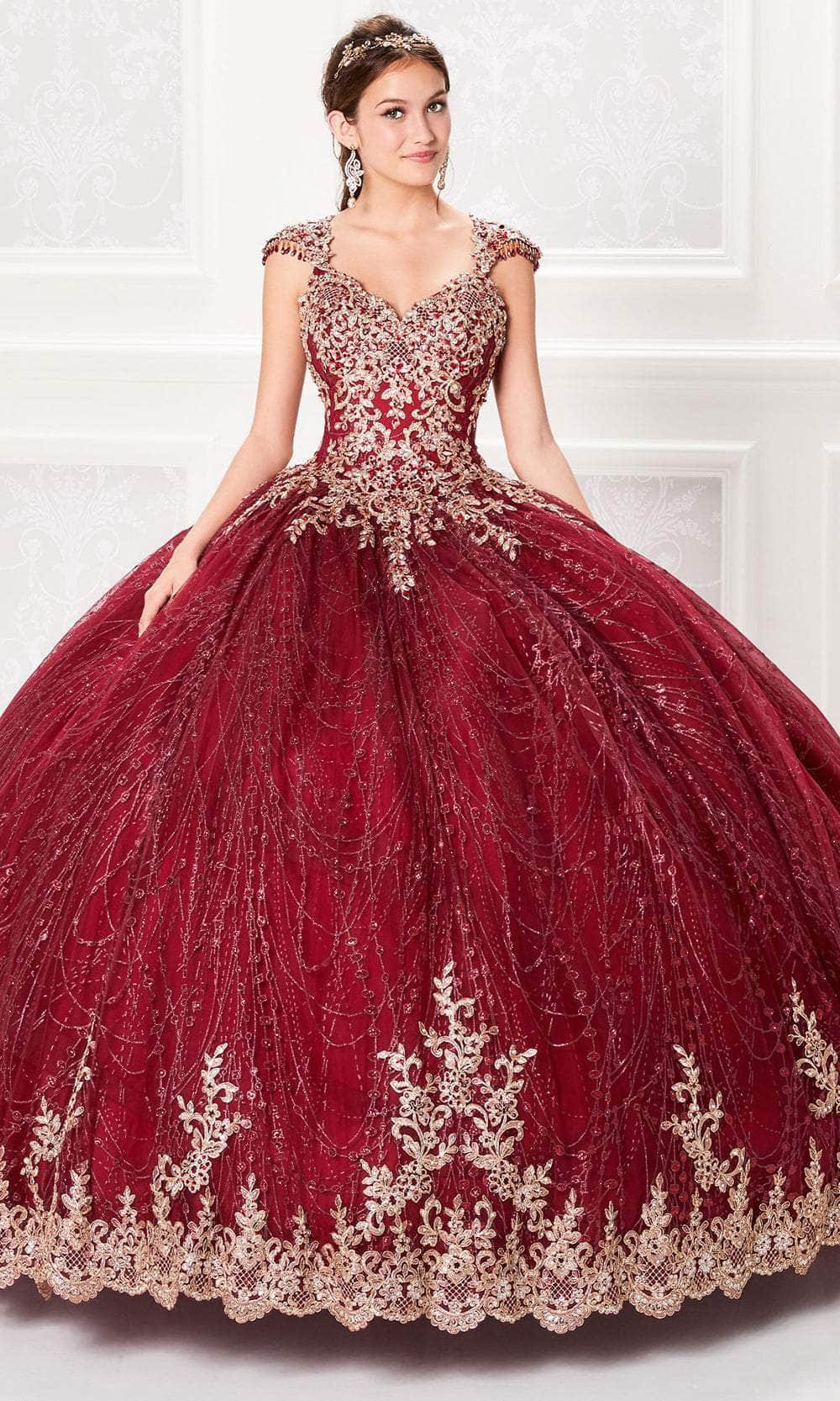 Radiate elegance on your special day with the Princesa by Ariana Vara PR21964 gown, designed to make you feel like a true princess. This exquisite ball gown is crafted from cracked ice fabric, embellished with intricate lace appliques and sparkling stone accents that catch the light. The queen Anne neckline and beaded cap sleeves offer a refined touch, while the Basque waist enhances the silhouette. The gown features a corset back with a keyhole detail for added drama. The scalloped lace trim and sweep train complete this luxurious look, making Princesa by Ariana Vara PR21964 ideal for a memorable Quinceañera celebration. Models are wearing Wine/Gold and Rose Gold colors.