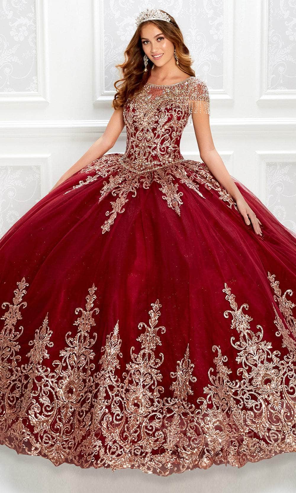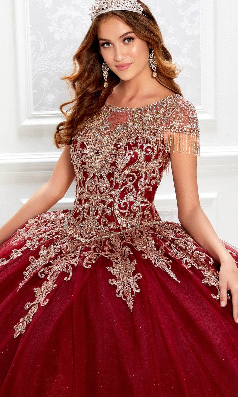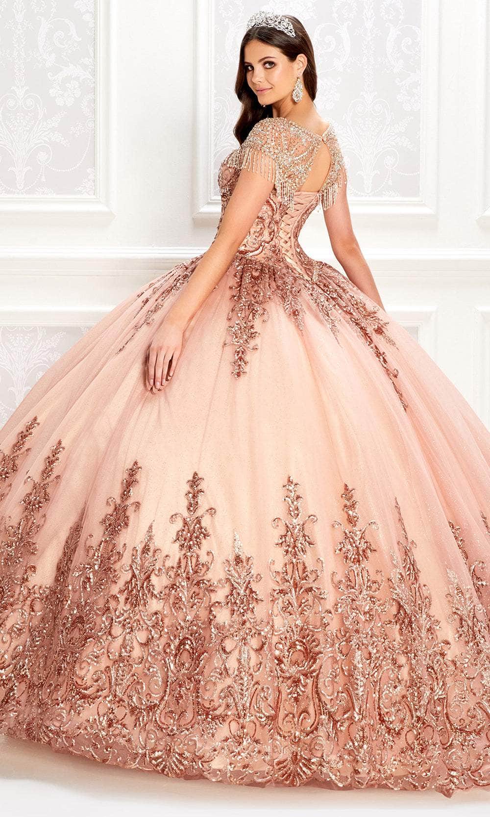 Radiate elegance in the Princesa by Ariana Vara PR22026 gown, designed to make your Quinceañera a truly unforgettable event. This exquisite ball gown features a beaded bodice with intricate lace appliques that cascade down the tulle and glitter tulle skirt, offering a look that sparkles from every angle. The jewel neckline and short sleeves, adorned with beaded fringe, add a touch of sophistication. The Basque waist beautifully defines the figure, while the corset back ensures a tailored fit. Perfect for creating a grand entrance, this Princesa by Ariana Vara PR22026 is a celebration of timeless beauty and grace. Models are wearing Wine/Rose Gold and Bronze/Rose Gold colors.