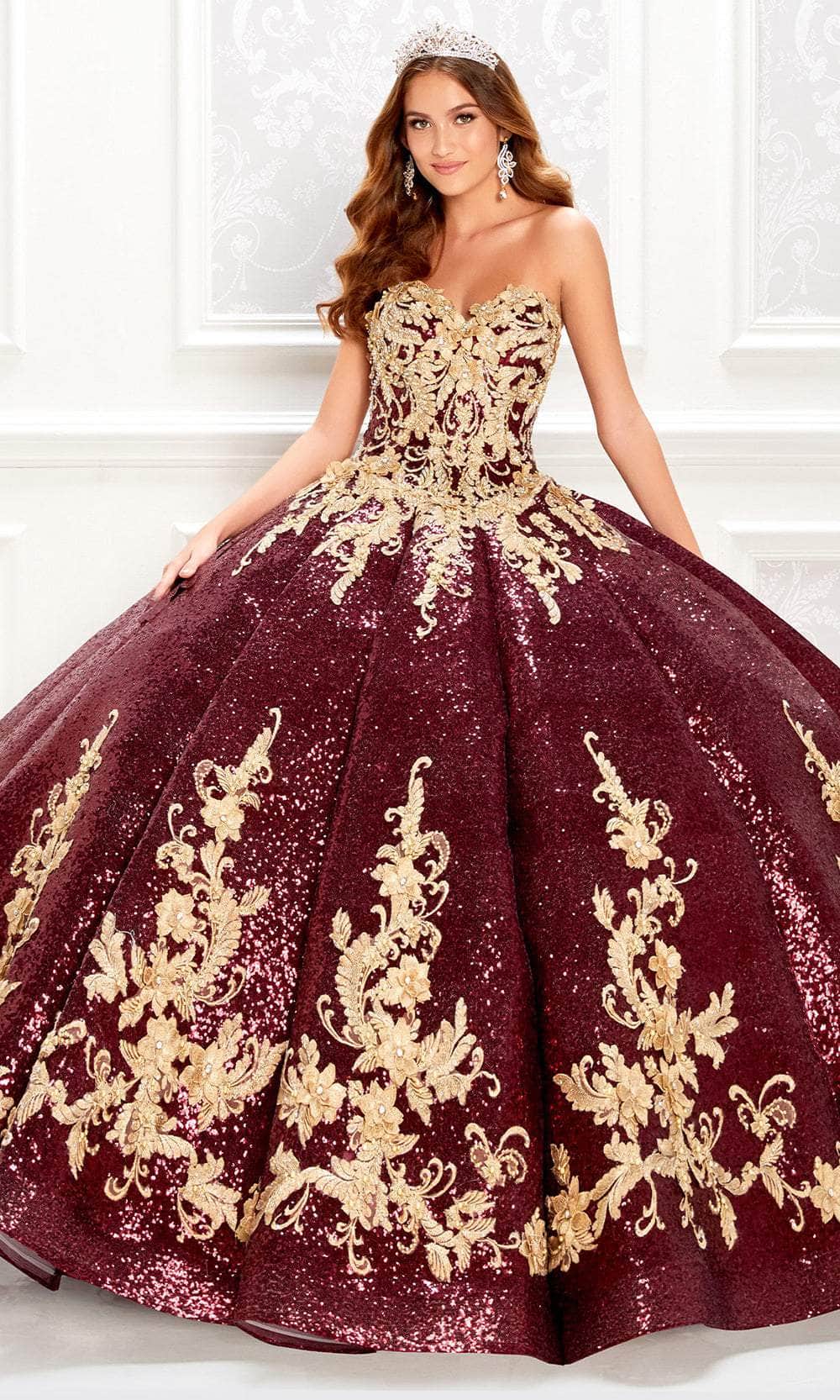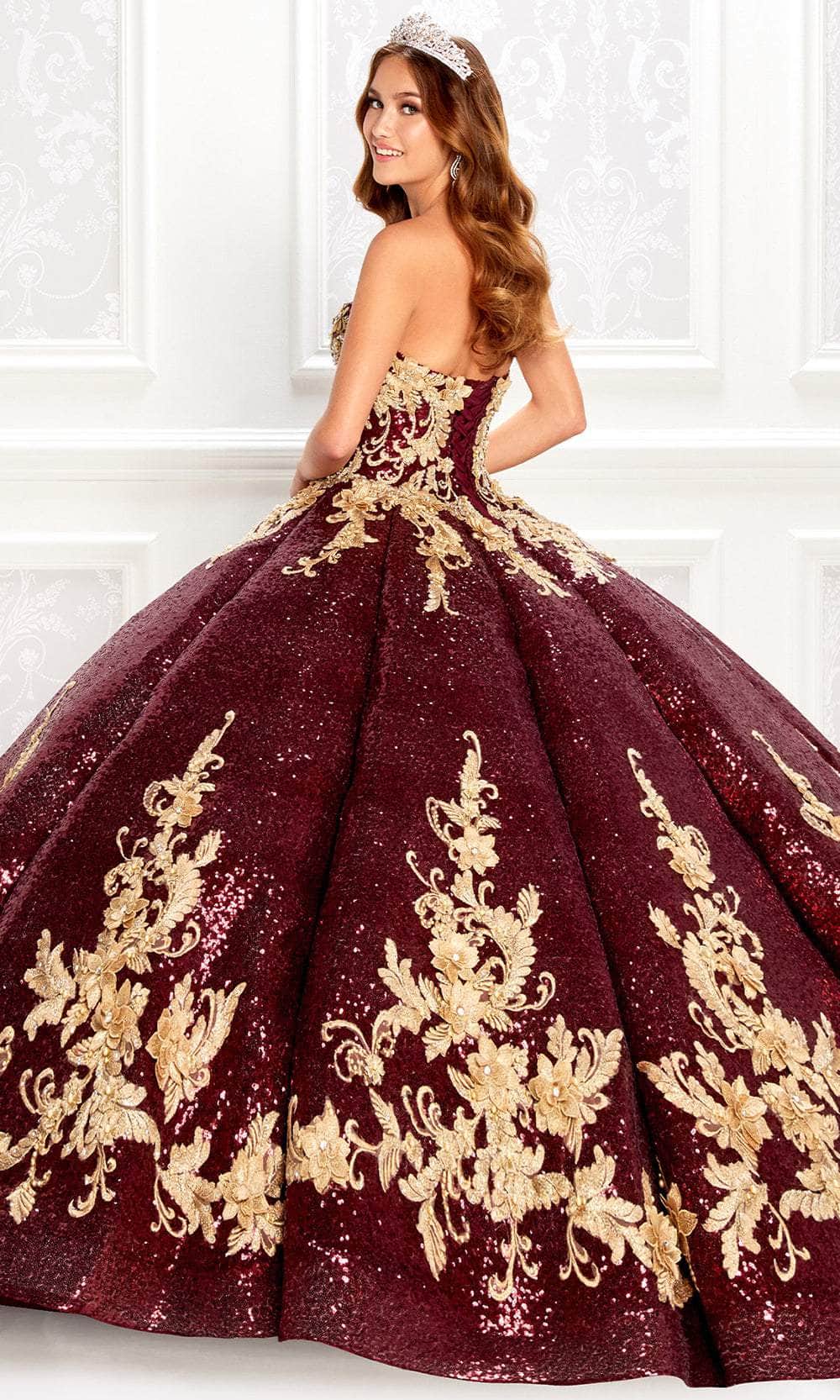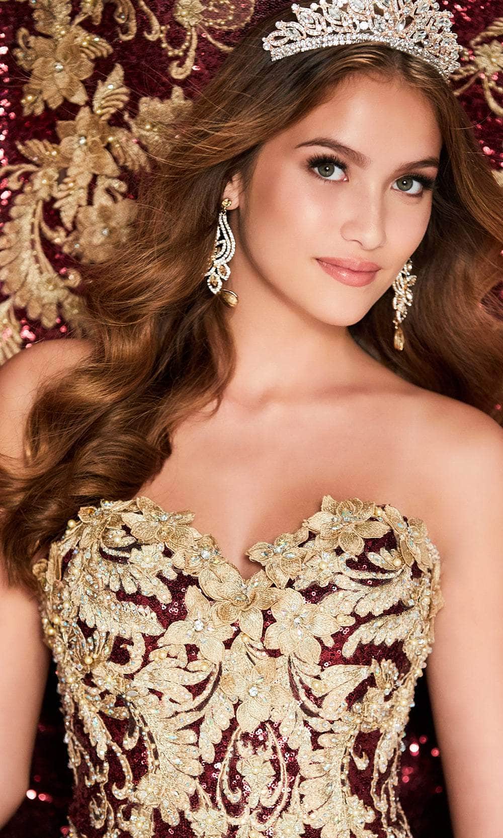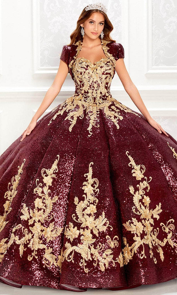 Be the epitome of classic elegance with sparkling twist in this Princesa by Ariana Vara PR22030 gown. This strapless ball gown features a stunning sweetheart neckline embellished with delicate lace appliques and intricate beading, creating a captivating, romantic allure. The Basque waist accentuates your silhouette, while the corset back ensures a perfect fit. Stone accents shimmer across the dress, adding a touch of magic. With horsehair trim at the hem for added volume and a matching sequin jacket, this Princesa by Ariana Vara PR22030 promises a glamorous entrance on your special day. Model is wearing Wine/Gold color.