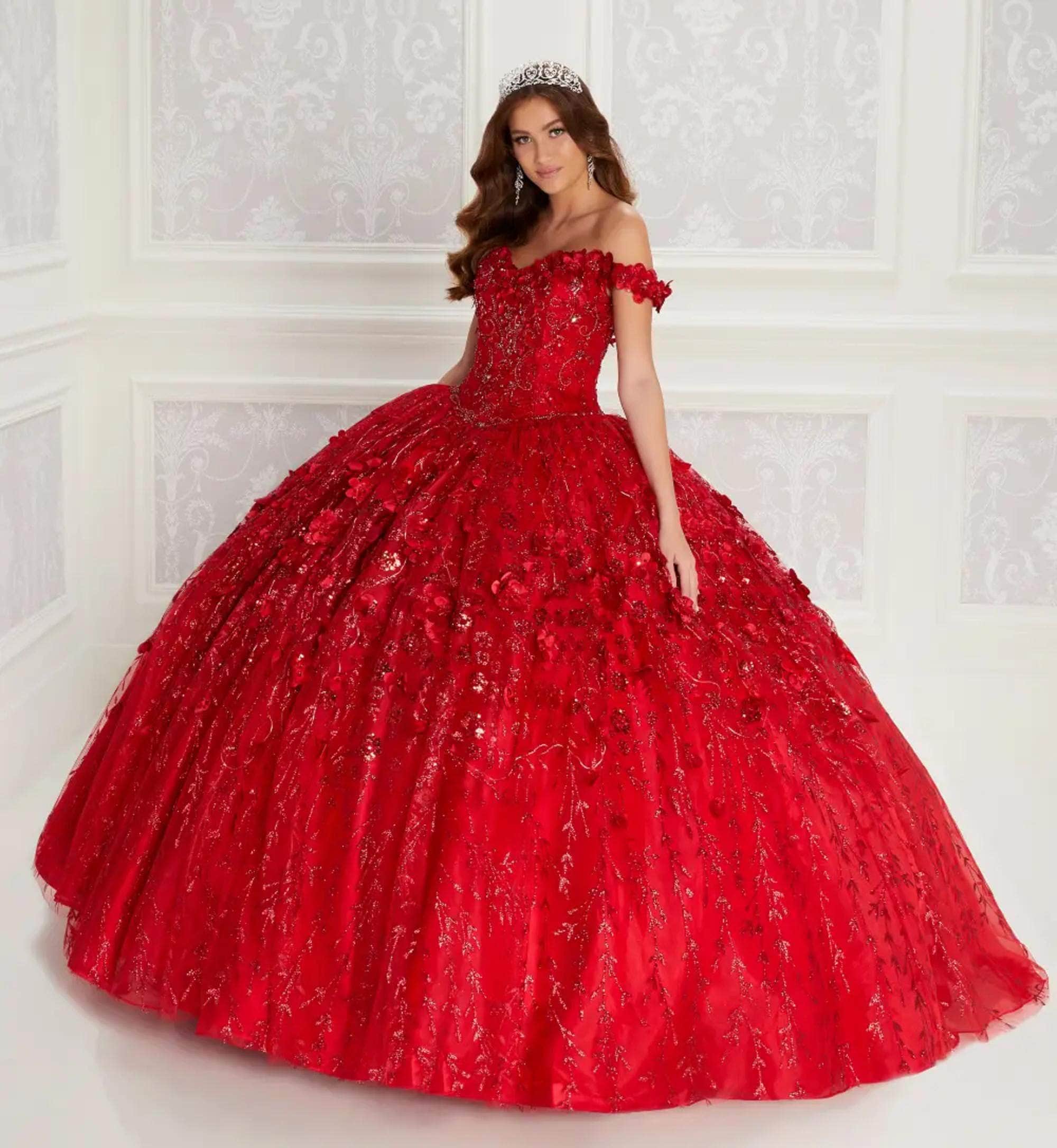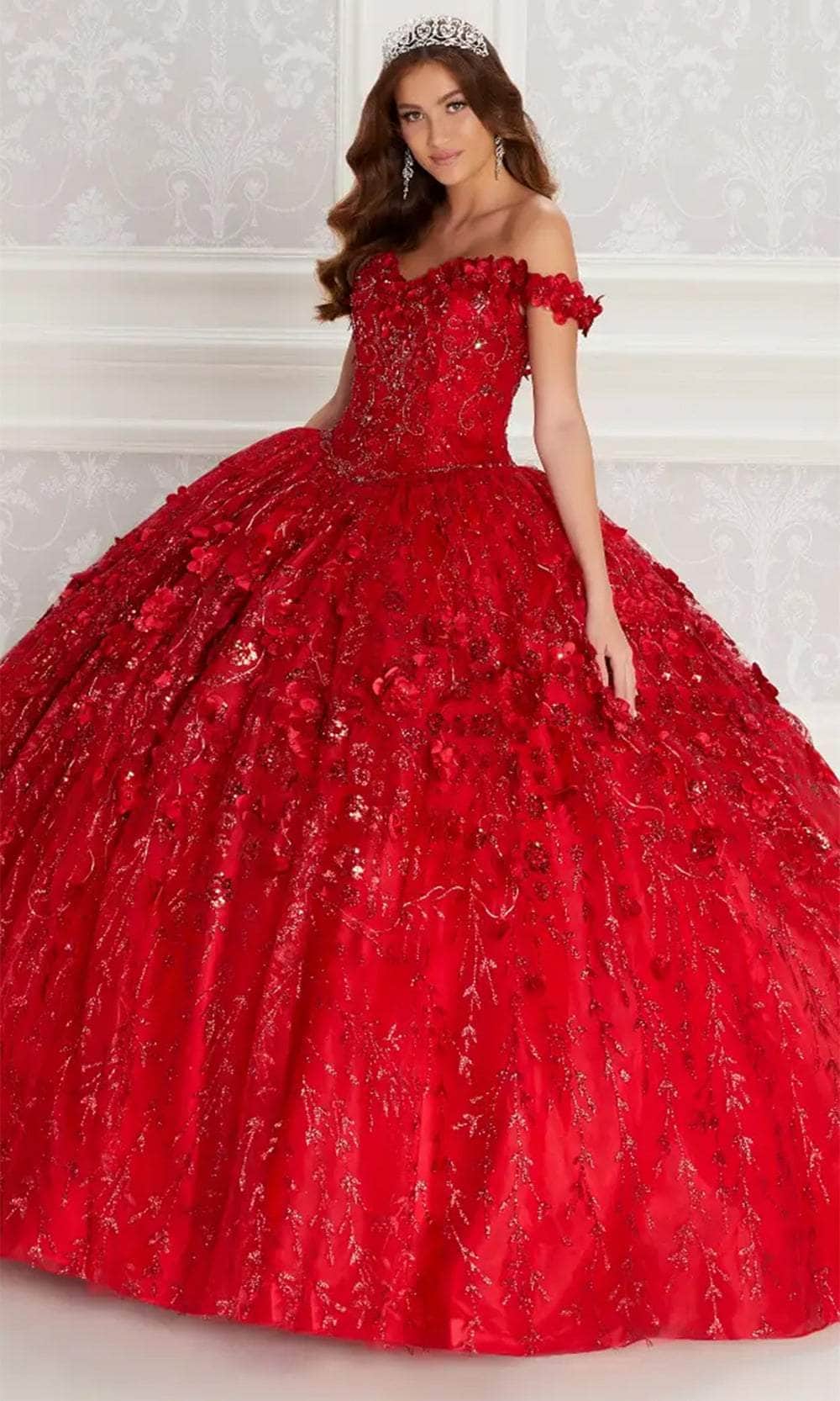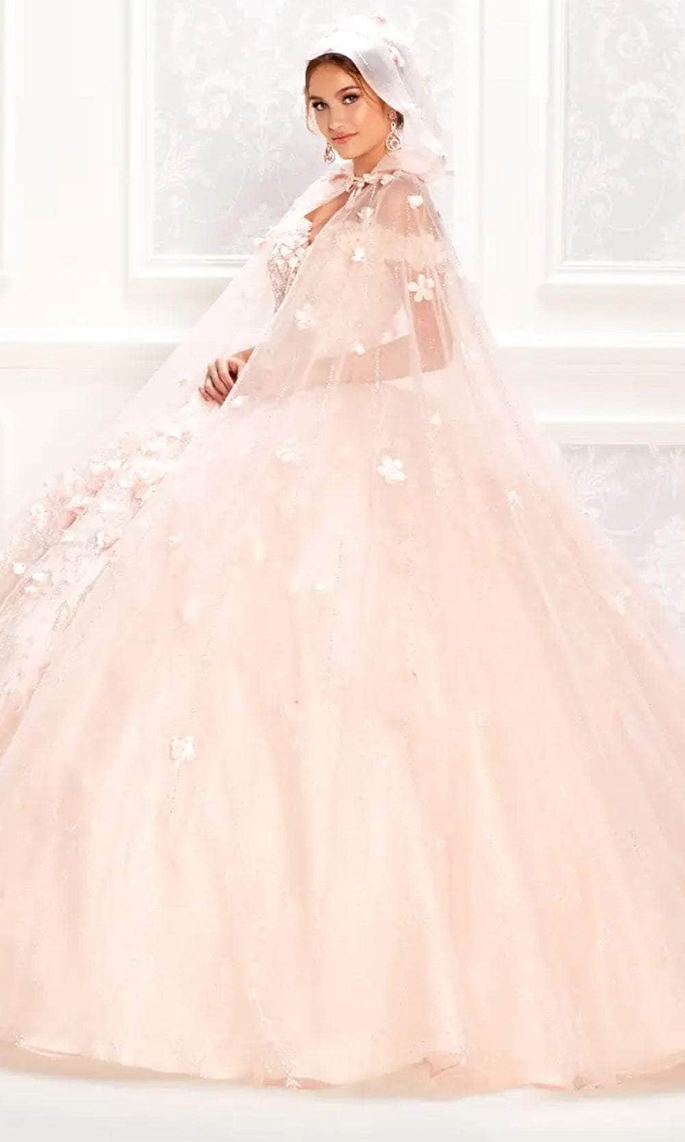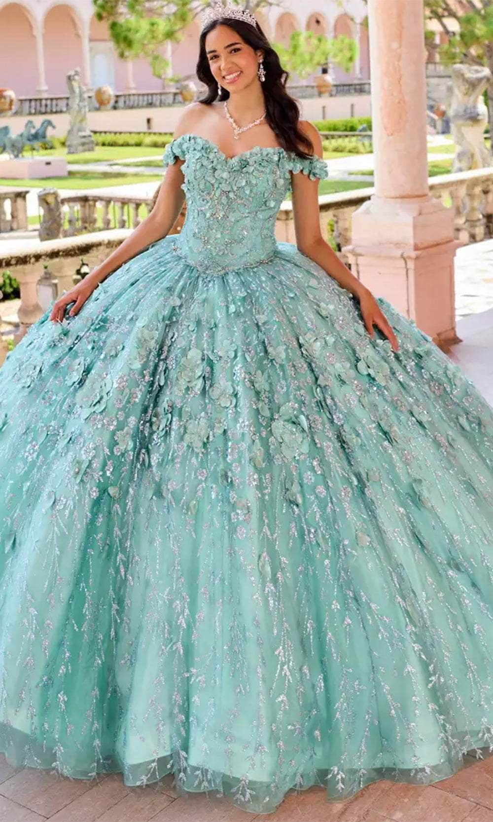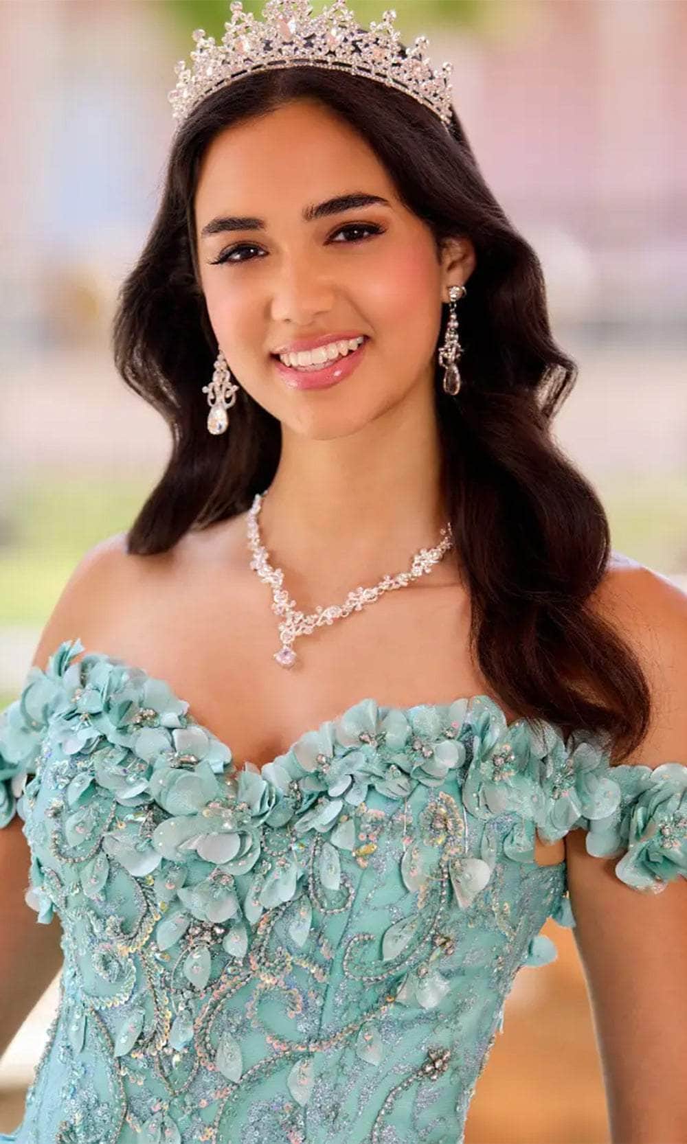 Get ready to dazzle at your Quinceañera in the breathtaking Princesa by Ariana Vara PR22036 ball gown. This enchanting strapless dress features a sweetheart neckline adorned with sparkling beadwork and delicate 3D floral appliques, creating a truly captivating look. The Basque waist accentuates the figure, while the corset back ensures a flattering and secure fit. Shimmering stone accents add a touch of sparkle, making this gown shine from every angle. For added versatility and elegance, the gown comes with a detachable off-the-shoulder strap and a matching jacket, Princesa by Ariana Vara PR22036 allows you to customize your look for an unforgettable celebration. Models are wearing Blush, Orchid, Red, and Sage colors.