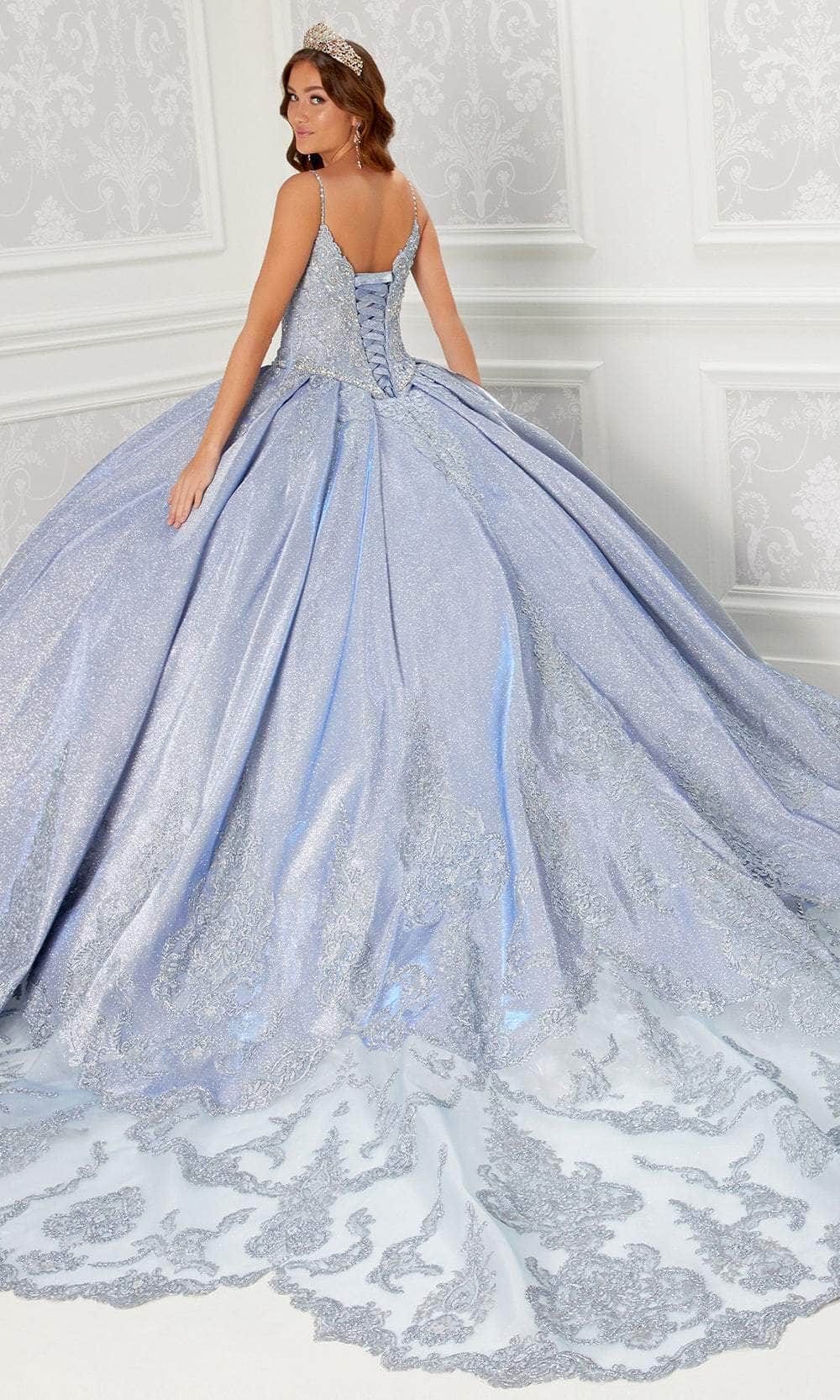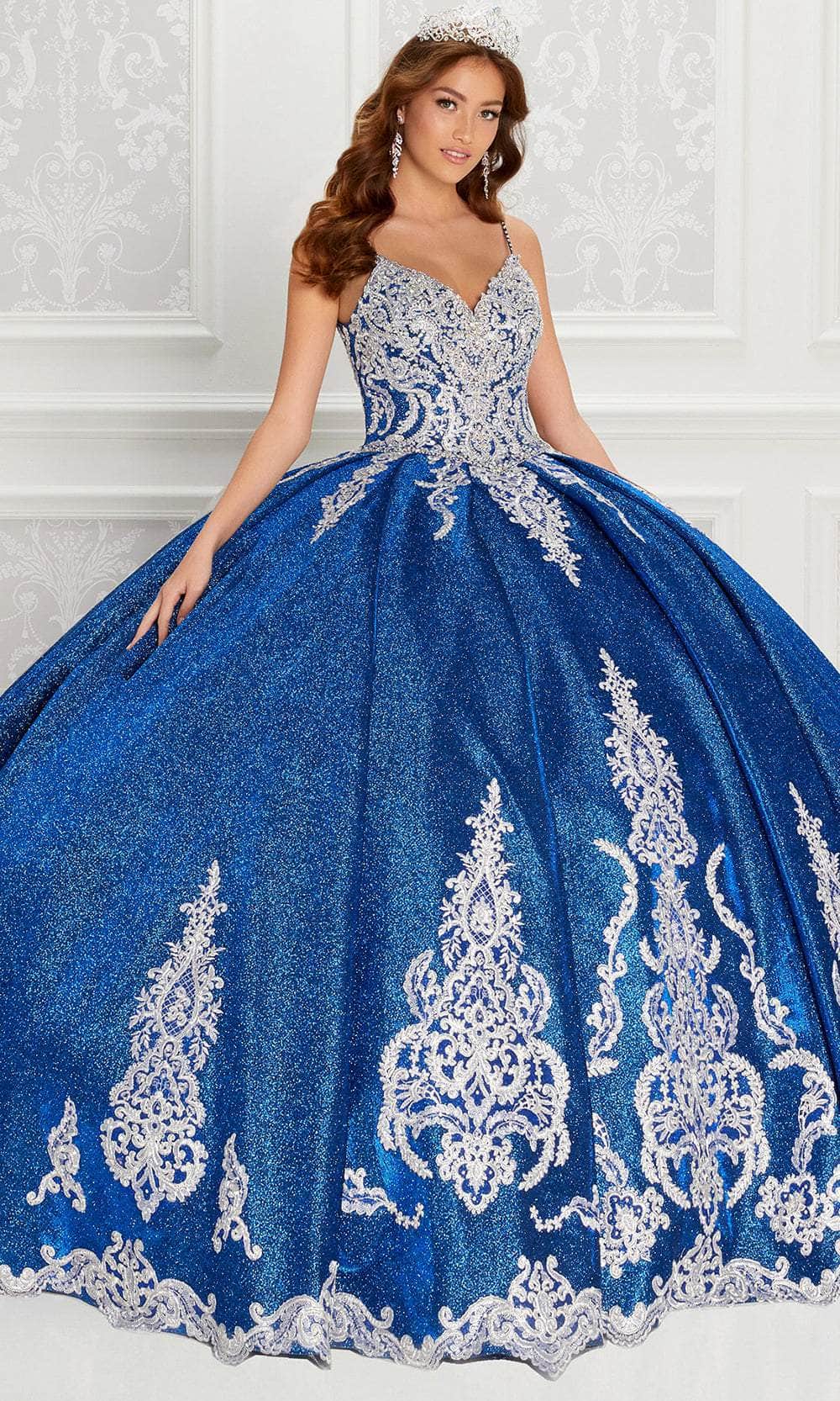 Make your fairytale moment come to life in the stunning Princesa by Ariana Vara PR22141 ball gown. Crafted from luxurious novelty glitter fabric and embroidered lace, this enchanting dress features a beautifully beaded bodice with a deep V-neckline and a Basque waist that flatters the figure. The corset back offers a customizable fit, while sparkling stone and crystal accents add a touch of magic. The gown flows into a dramatic scalloped edge cathedral train, complete with a built-in bustle detail for an elegant touch. A matching short cape adds a regal finish, perfect for making a grand entrance at any special event. Models are wearing Black/Gold, Sapphire/Silver, Ice Blue, Rose Gold, Lilac/Silver, and Merlot/Gold colors.