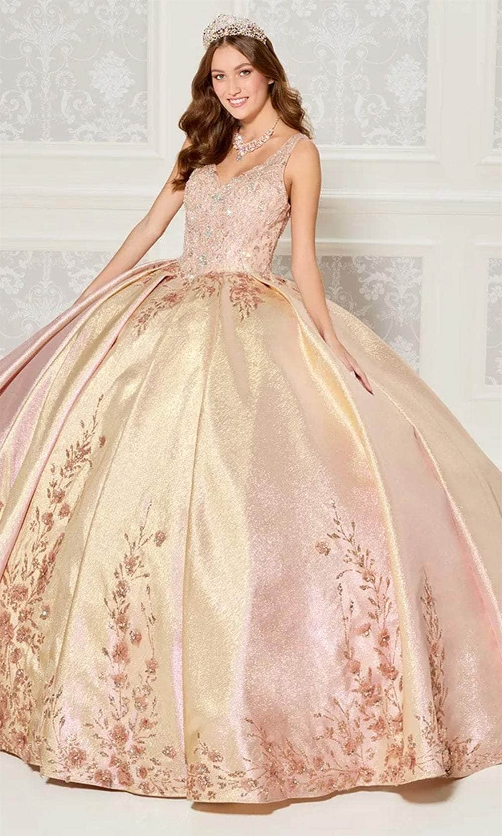 Radiate elegance and romance in the Princesa by Ariana Vara PR30081 gown, a stunning choice for your Quinceañera celebration. This beautiful metallic dress is adorned with exquisite three-dimensional flowers and intricate beading, creating a look that is both captivating and unique. The V-neck bodice enhances the gown's sophisticated appeal, while adding a touch of classic charm. Complete with a small matching cape, this Princesa by Ariana Vara PR30081 ensures a magical entrance that will leave a lasting impression on your special day. Models are wearing Rose Gold, Ice Blue, and Raspberry Radiant/Gold colors.