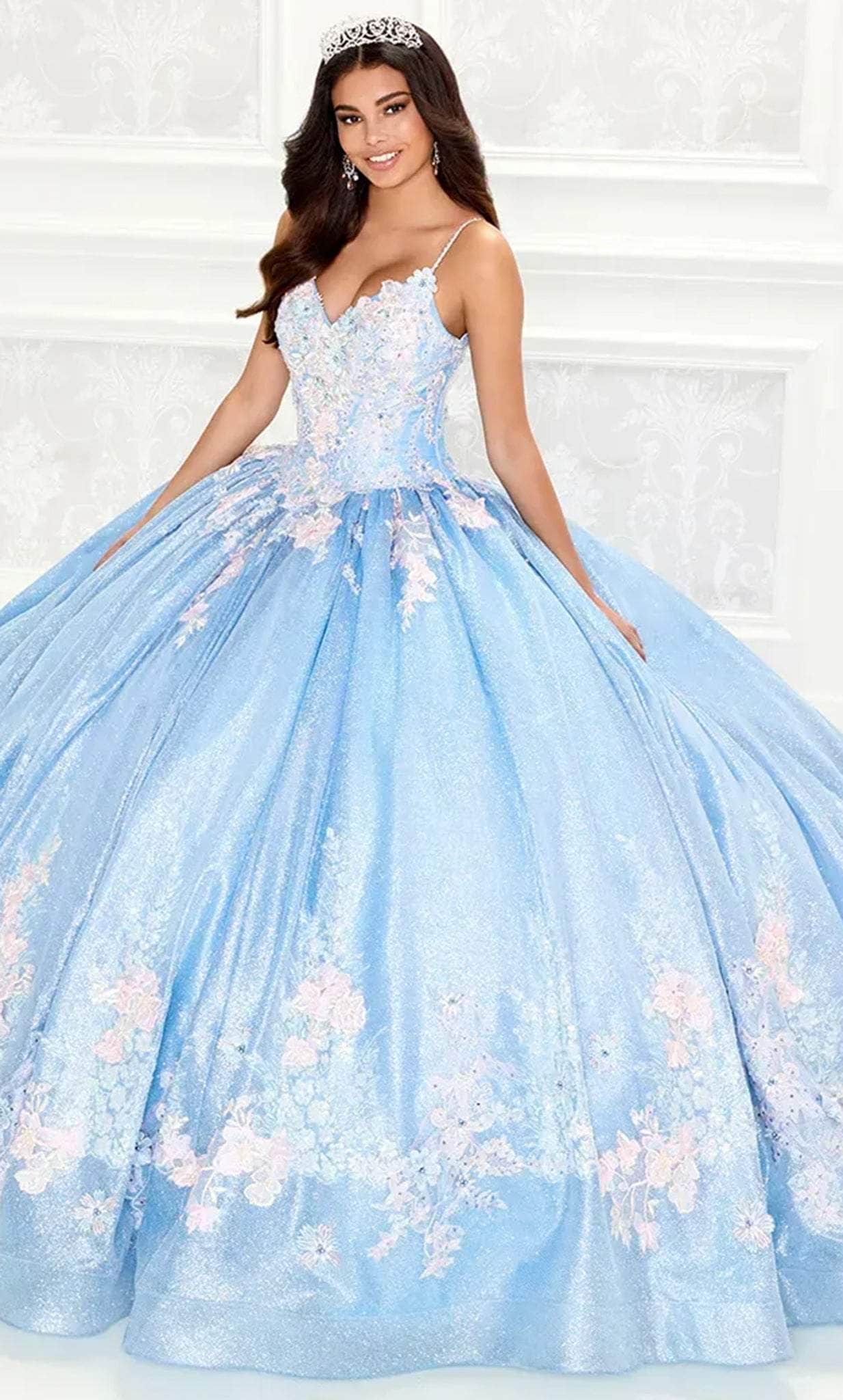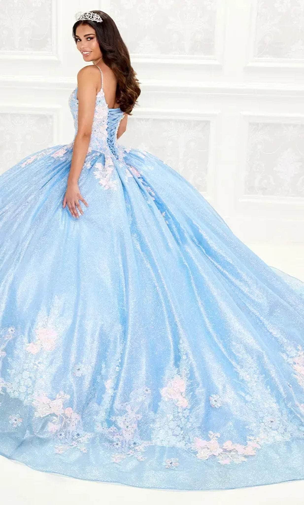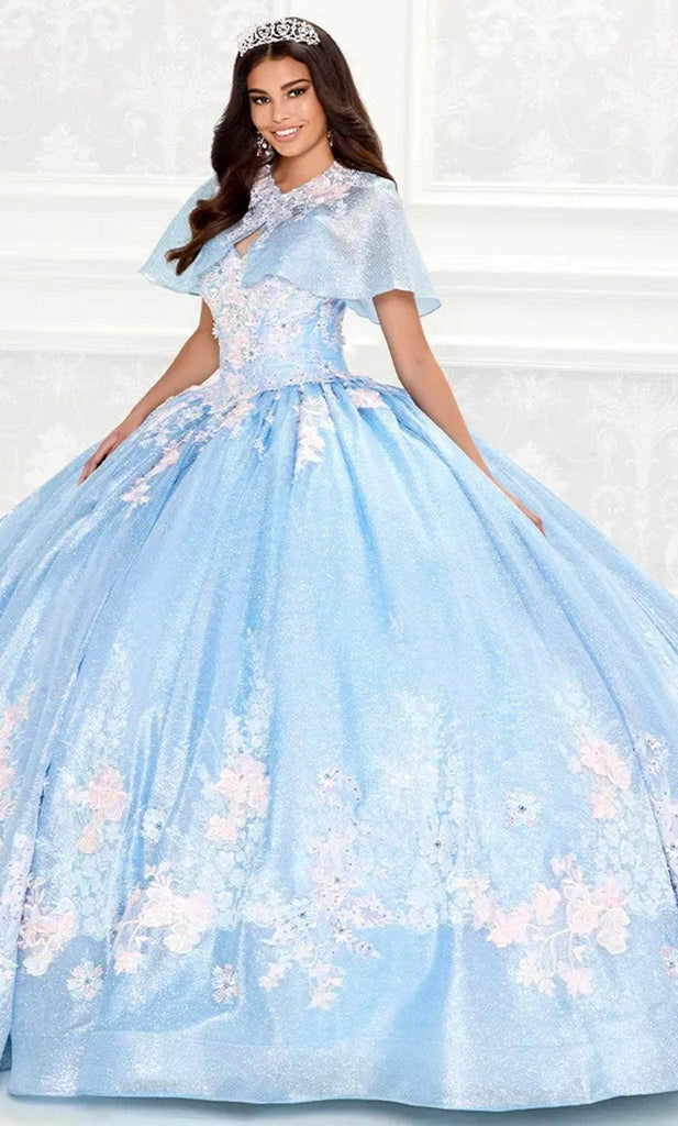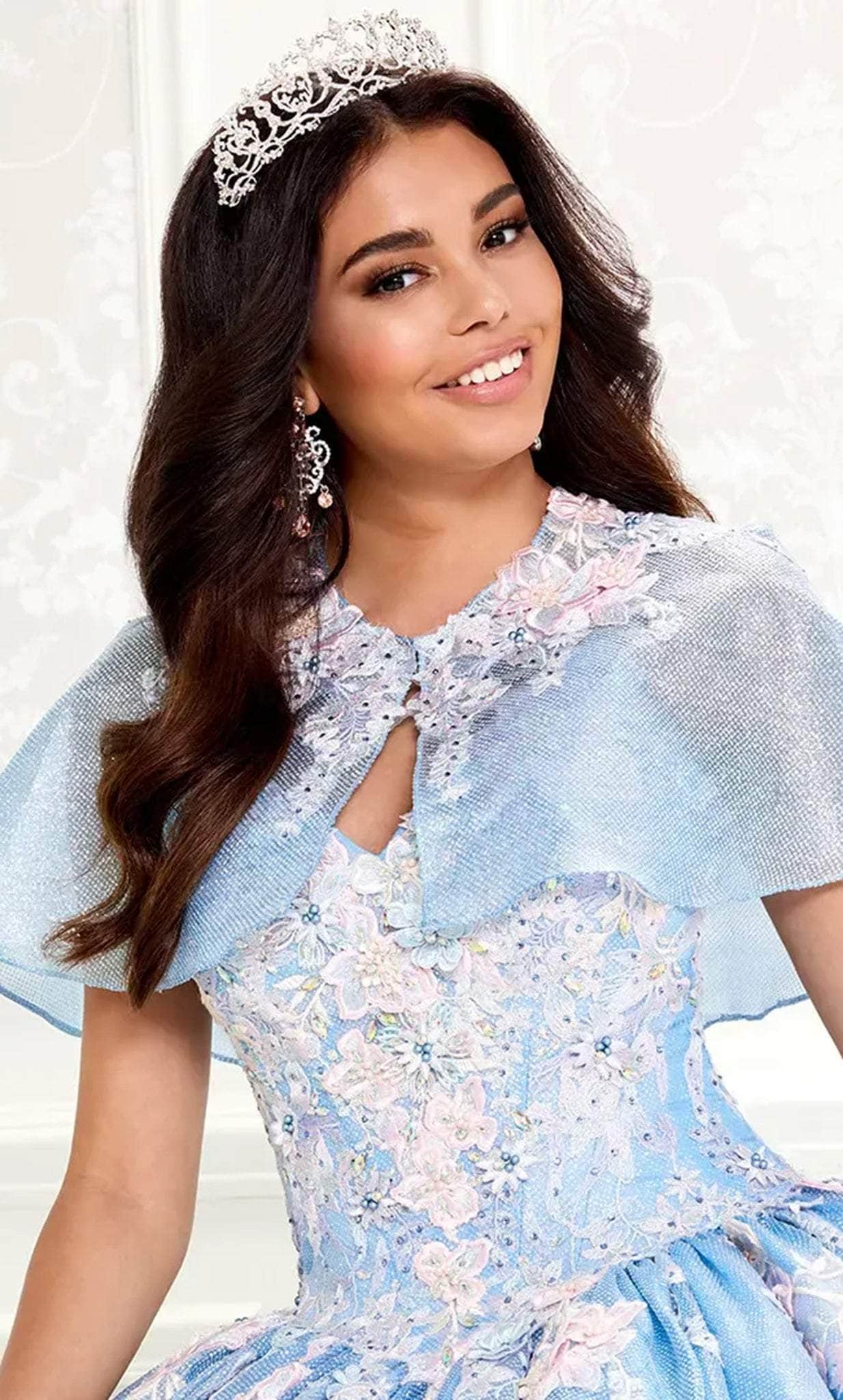 Dazzle the stunning affair with your immaculate demeanor in this Princesa by Ariana Vara PR30083 masterpiece. Adorned with the most refined beading, stone accents, and cracked Ice applique with 3D flowers over a glittered organza, this gown flatters with a V-neckline and a corset lace-up back. From the basque waist, a voluminous quinceanera ballgown features a dramatic court train finish. A small cape is included in this masterpiece. Leave them speechless in the ballroom with your grandeur in this Princesa by Ariana Vara PR30083 creation. Models are wearing the Blue Cotton Candy color.