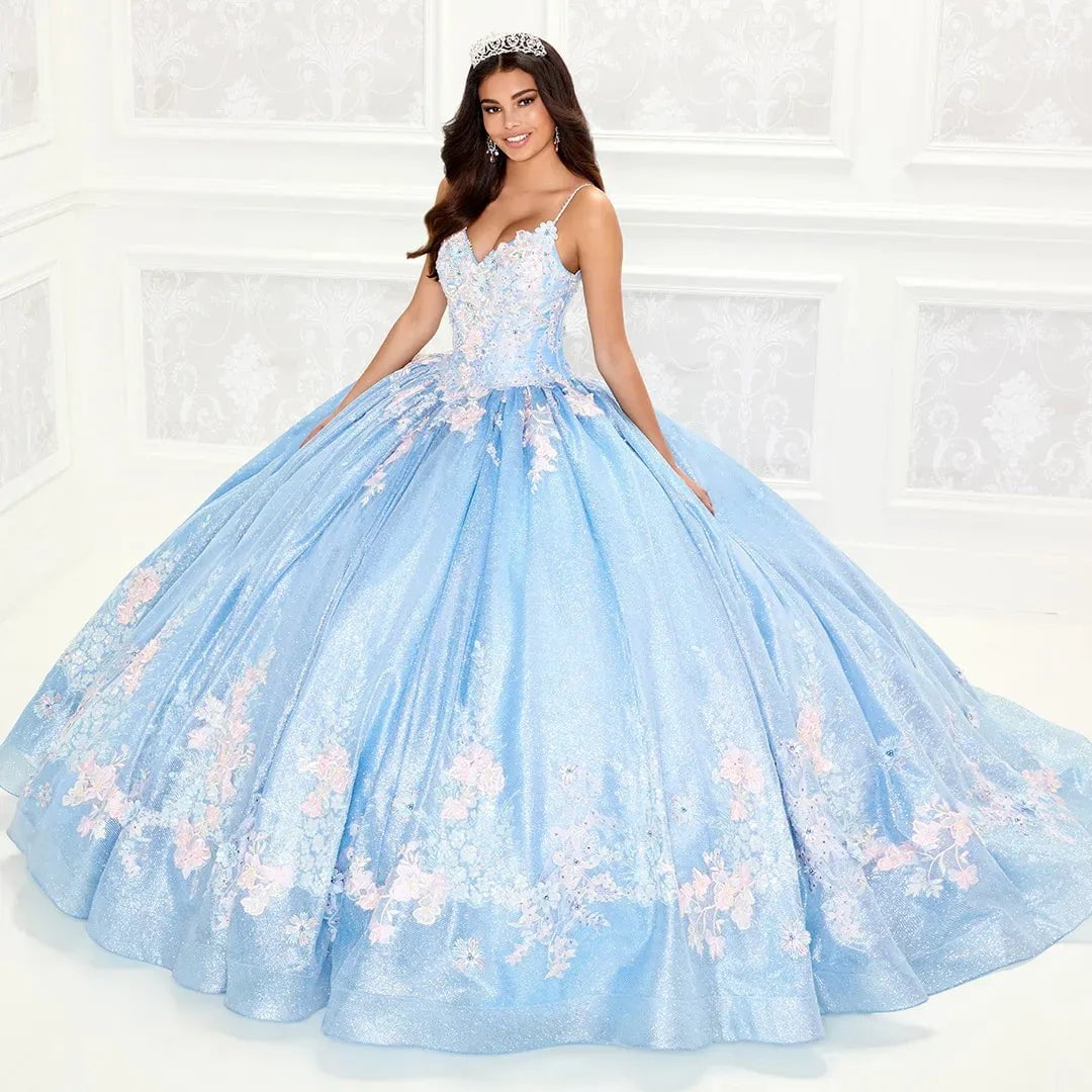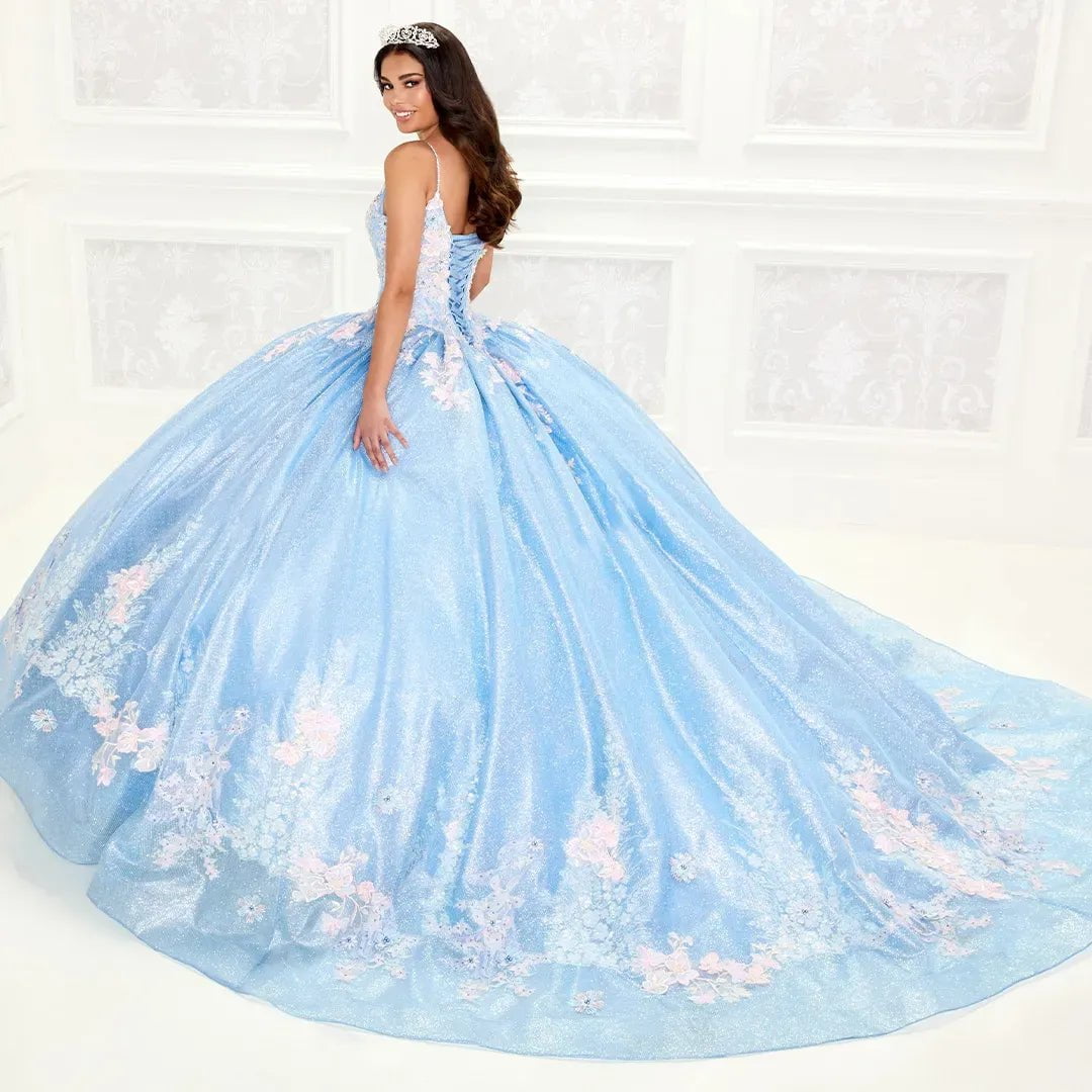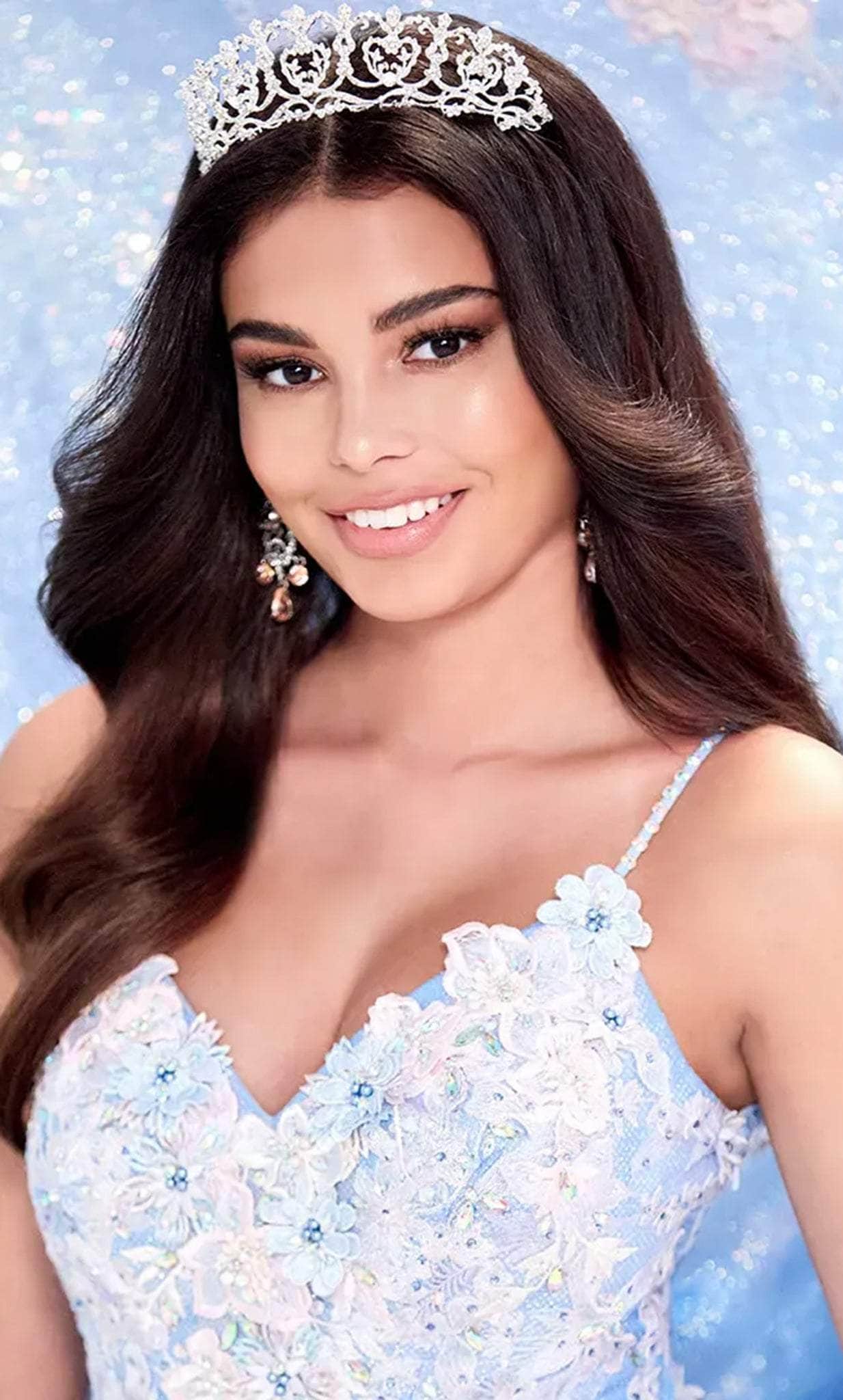 Dazzle the stunning affair with your immaculate demeanor in this Princesa by Ariana Vara PR30083 masterpiece. Adorned with the most refined beading, stone accents, and cracked Ice applique with 3D flowers over a glittered organza, this gown flatters with a V-neckline and a corset lace-up back. From the basque waist, a voluminous quinceanera ballgown features a dramatic court train finish. A small cape is included in this masterpiece. Leave them speechless in the ballroom with your grandeur in this Princesa by Ariana Vara PR30083 creation. Models are wearing the Blue Cotton Candy color.