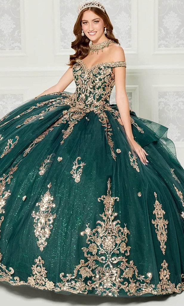 Create a special moment wearing this Princesa by Ariana Vara PR30112 gown. This stunner will make you feel like royalty with its dazzling beadwork and lace embroidery. Featuring an off-shoulder sweetheart neckline and corset lace-up back, complemented by a matching necklace. The skirt moulds a ballgown silhouette in a full length hem and flares into a chapel train, ending in a ruffled and bow detailing at the back. Fascinate the crowd wearing this exceptional Princesa by Ariana Vara PR30112 masterpiece. Models are wearing the Forest/Gold and Wine/Gold colors.