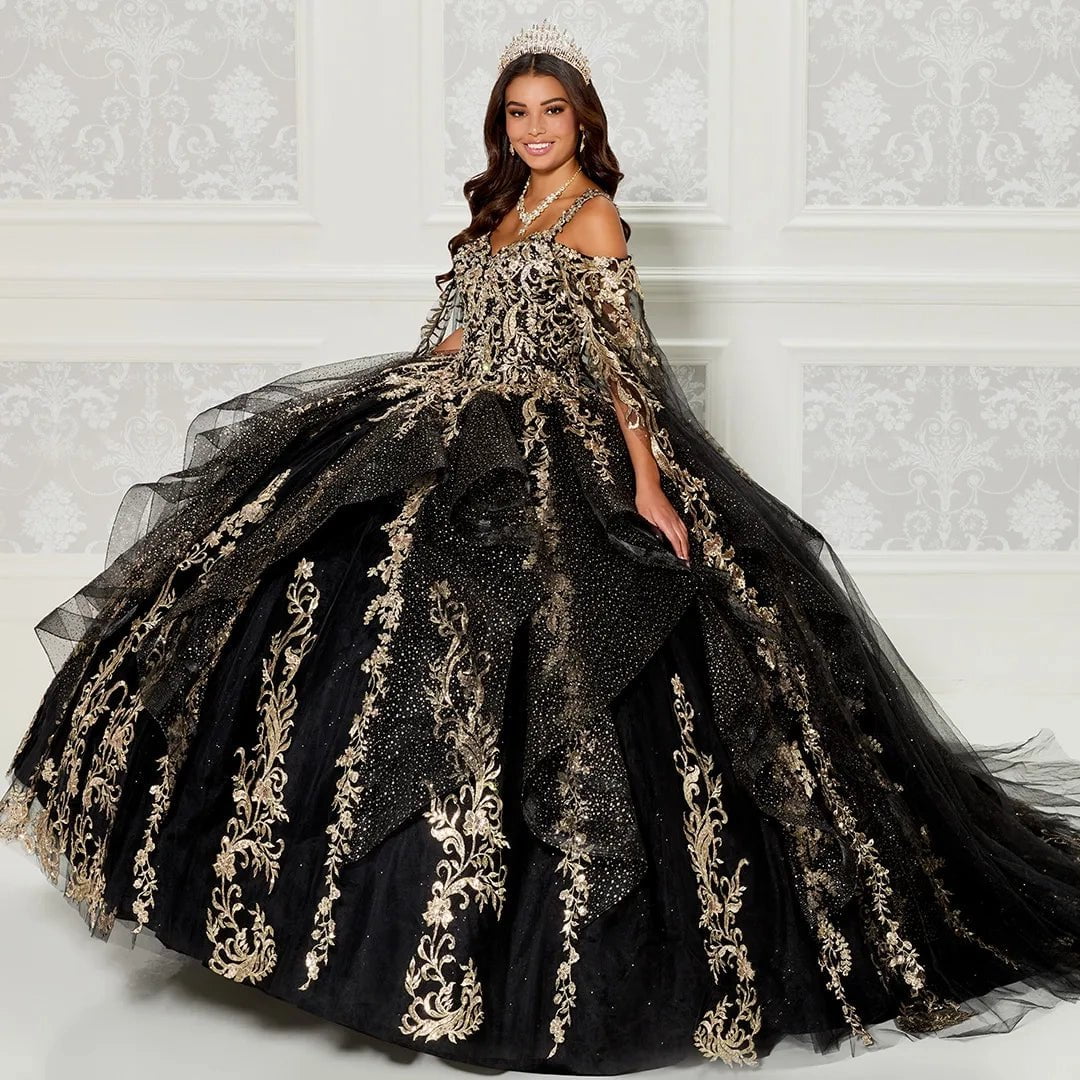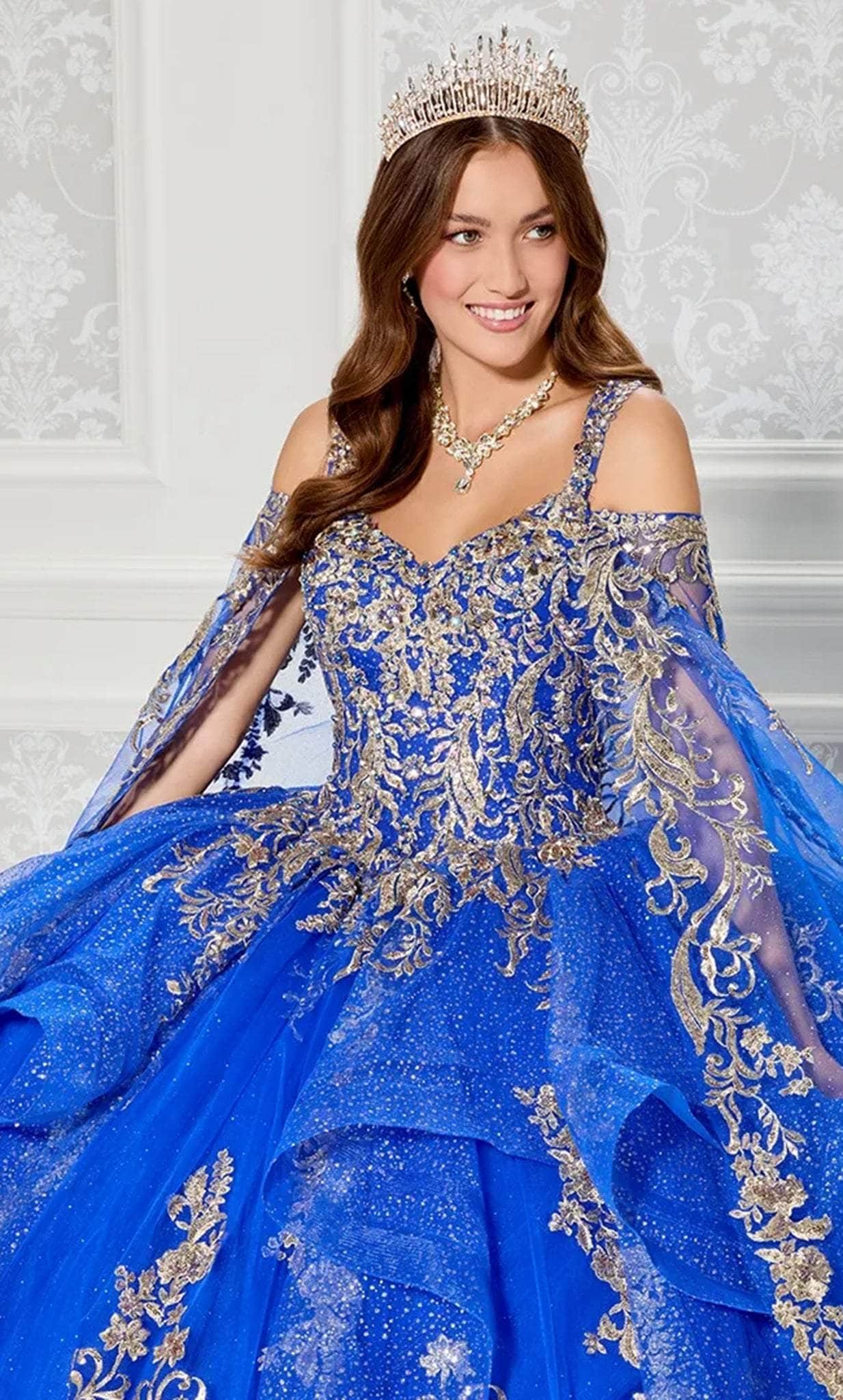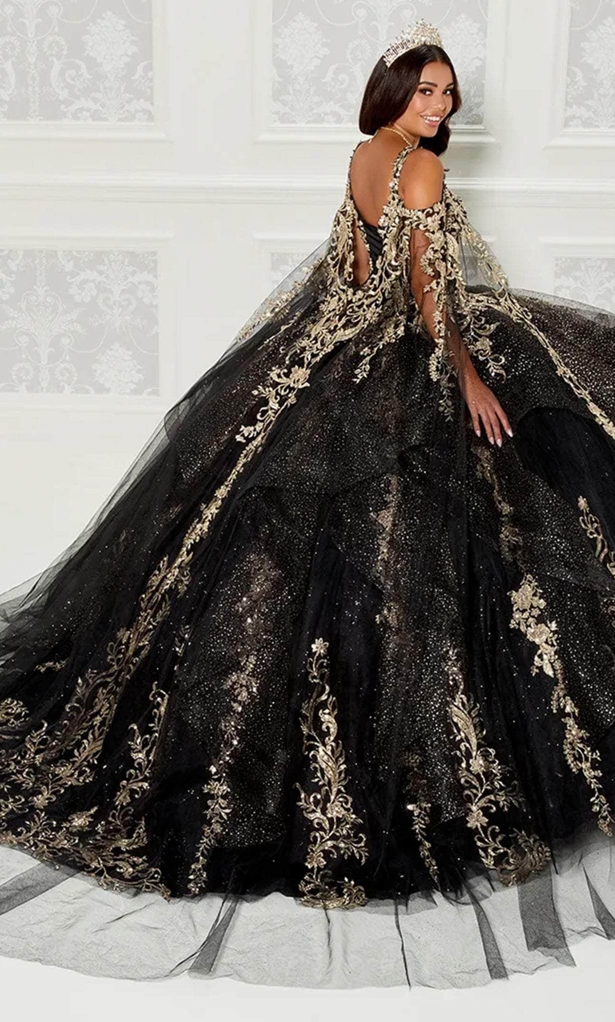 Charm everyone with the iridescent appeal of this glamorous Princesa by Ariana Vara PR30117 creation. Showing off a spectacle of intricate bead festooned gold metallic appliques, this beauty features a deep v-neckline with tank straps. Cinching the elaborate bodice with a corset styled open back, the skirt flaunts glittering ruffled layers that flows into a ballgown silhouette with an applique ornate train. This ensemble has a matching detachable long cape. Be a queen of your own right in this fascinating Princesa by Ariana Vara masterpiece. Models are wearing the Black/Gold and Royal/Gold colors.
