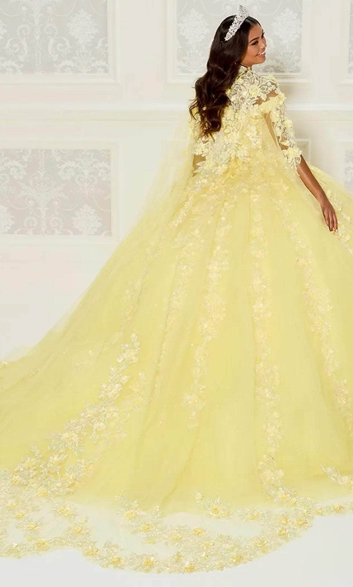 Leave them astounded as you walk with poise in this Princesa by Ariana Vara PR30120 creation. Lavishly embellished with 3D floral appliques, beaded, and embroidery all over its length, this gown creates a show-stopping look. This style flaunts an off-shoulder sweetheart neckline, corset lace-up back and adds drama with its detachable long cape. From the natural waist, the skirt graces a ballgown silhouette that descends beautifully with a chapel train. This Princesa by Ariana Vara PR30120 gown will sure to display your natural beauty and grace. Models are wearing the Lilac and Yellow colors.