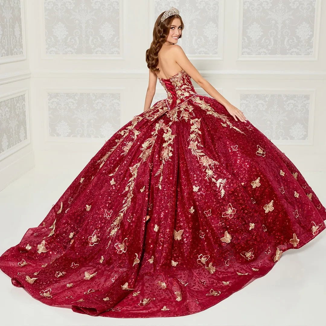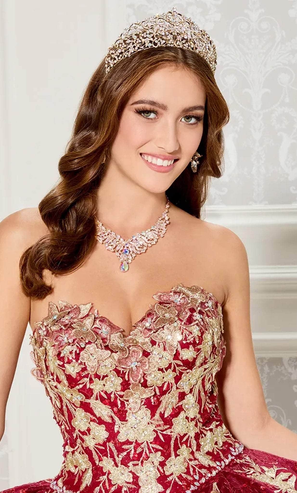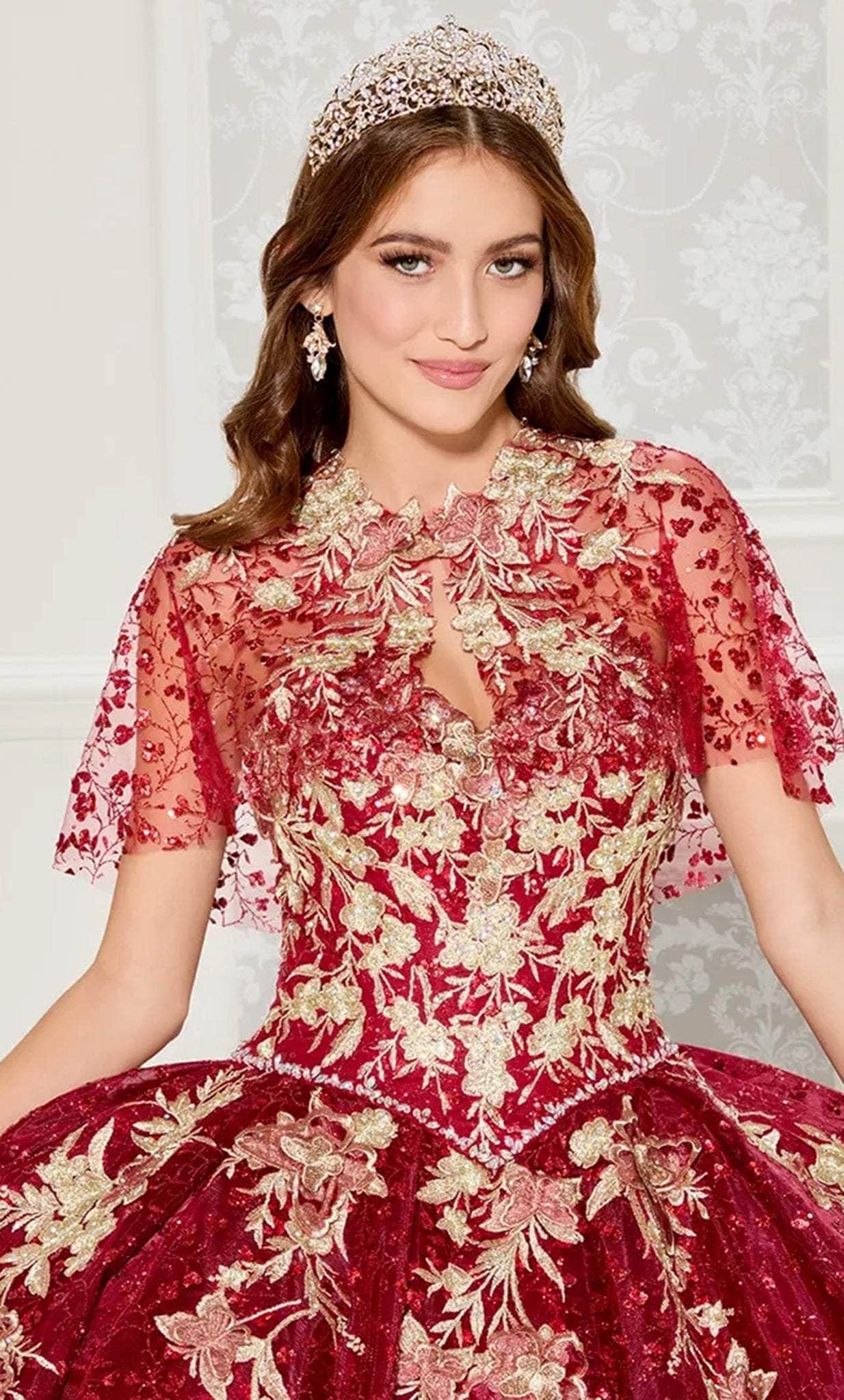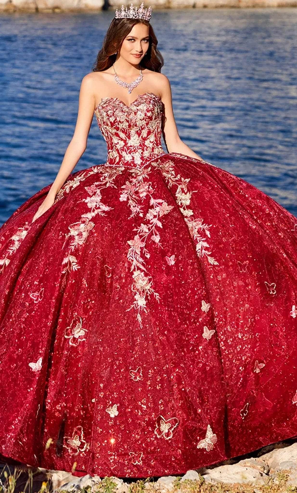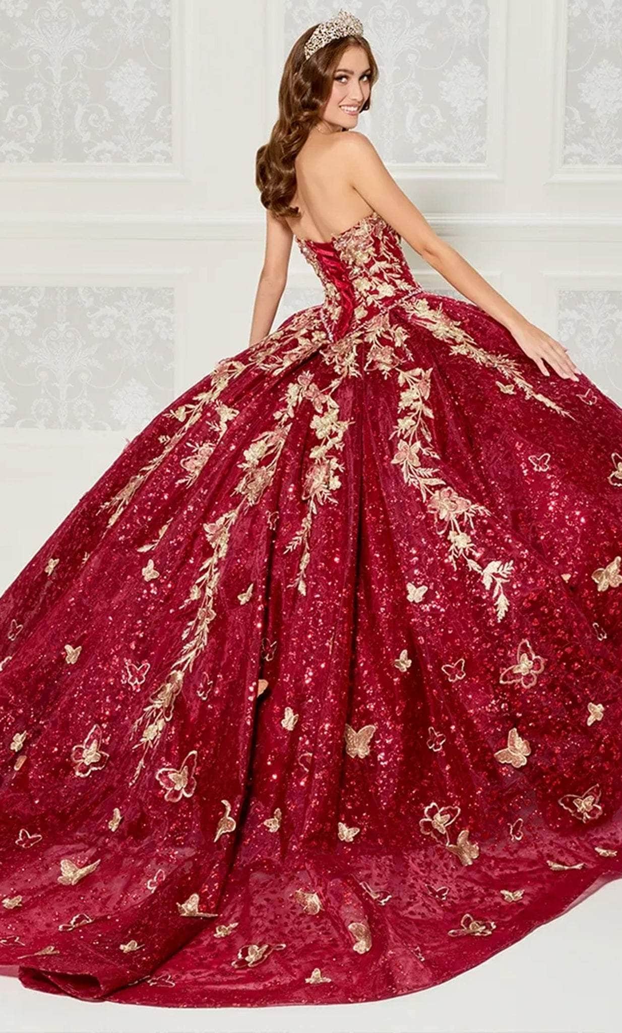 Beam with pride as you show up in this majestic Princesa by Ariana Vara PR30121 creation. This strapless gown with embroidery, 3D butterfly appliques, and beadwork embellishment is sure to turn heads. Showcasing a sweetheart neckline, basque waist and lace-up open back. The ballgown skirt is pleated and flares out into a remarkable chapel train. This ensemble also includes a matching small cape. Fall in love when you slip on this Princesa by Ariana Vara PR30121 masterpiece. Model is wearing the Wine/Gold color.