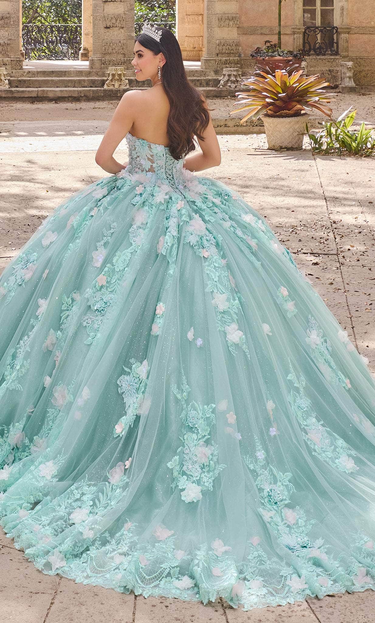 Step into a fairytale with this enchanting ball gown from Princesa by Ariana Vara PR30133. The sweetheart neckline beautifully showcases your shoulders and décolletage. The strapless design adds a touch of elegance and sophistication. Intricate 3D floral appliques cascade along the bodice, creating a stunning visual effect. Glitters add a magical sparkle, illuminating your every movement. Layers of ethereal tulle create a voluminous skirt, while delicate embroidery adds intricate detail. The lace-up tie ensures a perfect fit, accentuating your waistline. This Princesa by Ariana Vara PR30133 creation will sure to display your natural beauty and grace. Model is wearing Winterwint/Multi color.